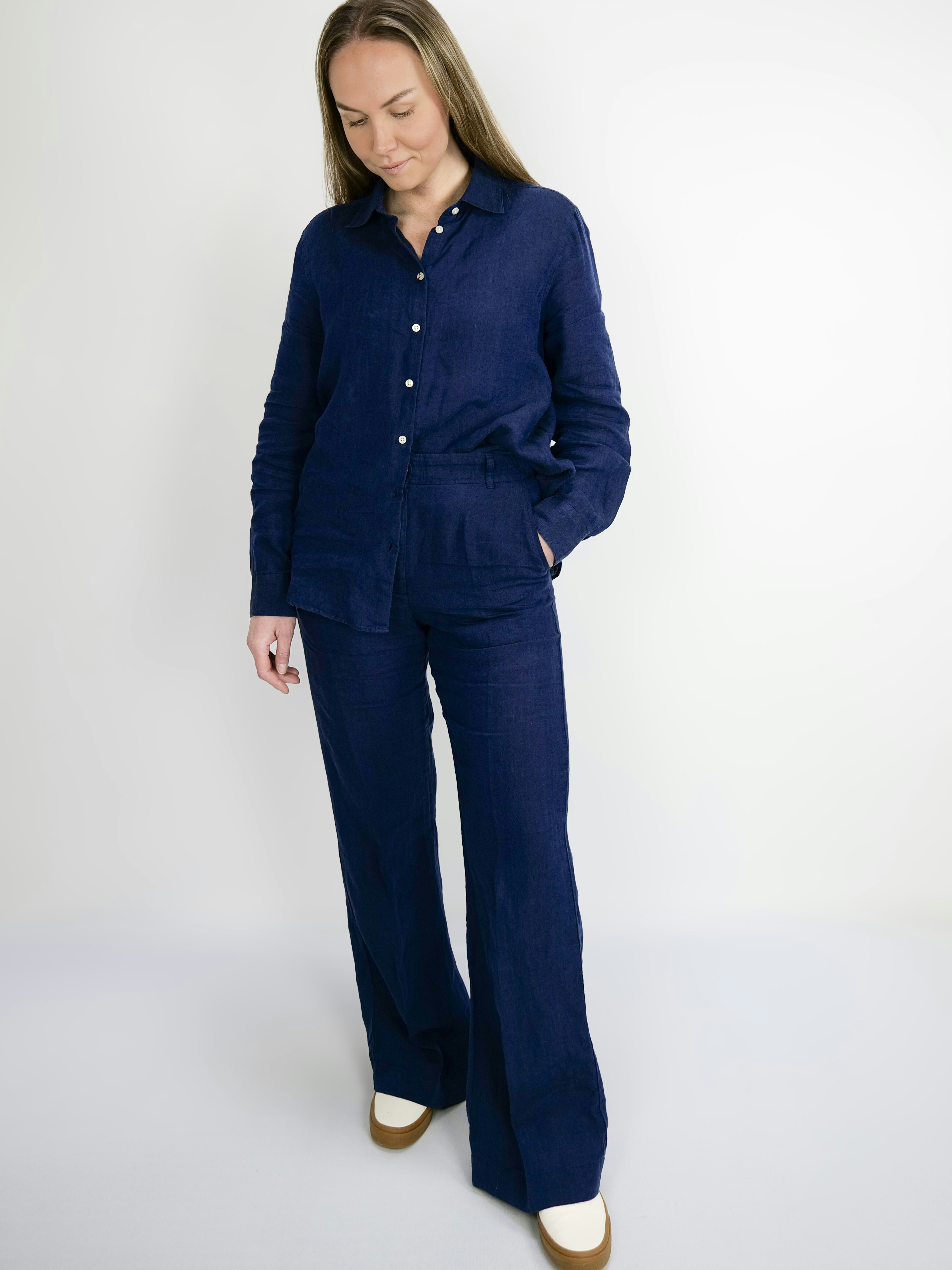 Linnebyxan Ägnö har en rak och ledig passform med normalhög midja. Byxorna är tillverkad i 100% Linne som är förtvättad för att vara mjuk och skön från start. Byxorna stängs med dragkedja och midjan har förstärkt linning som är utrustad med bältesöglor. Sidorna har praktiska fickor och bak finns två passpoalfickor utan lock. Bär byxorna tillsammans med våra linneöverdelar i samma färg som ett set eller tillsammans med precis vad som helst som en oumbärlig vårbyxa.