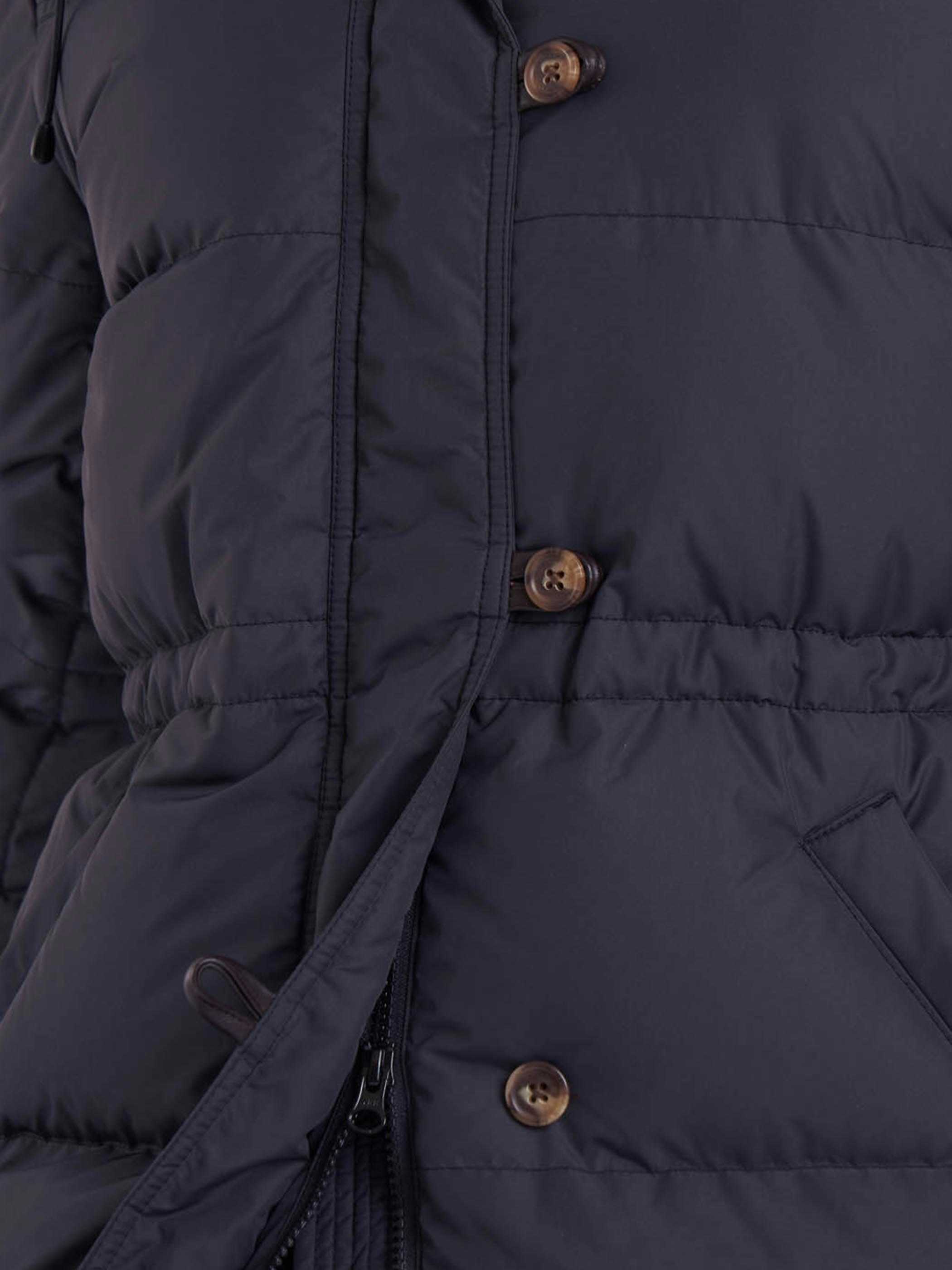 Med en innovativ "Anti-cold zone" blockerar den kyliga vindar genom sömmarna. Den anpassningsbara midjan med dragsko och elastiska ärmslut förhindrar kall luft från att komma in. En hög, dunfodrad krage erbjuder extra värme och skydd runt halsen. För flexibilitet har jackan en tvåvägsdragkedja och en avtagbar luva, kompletterad med knappar för att fästa en extra pälskrage.