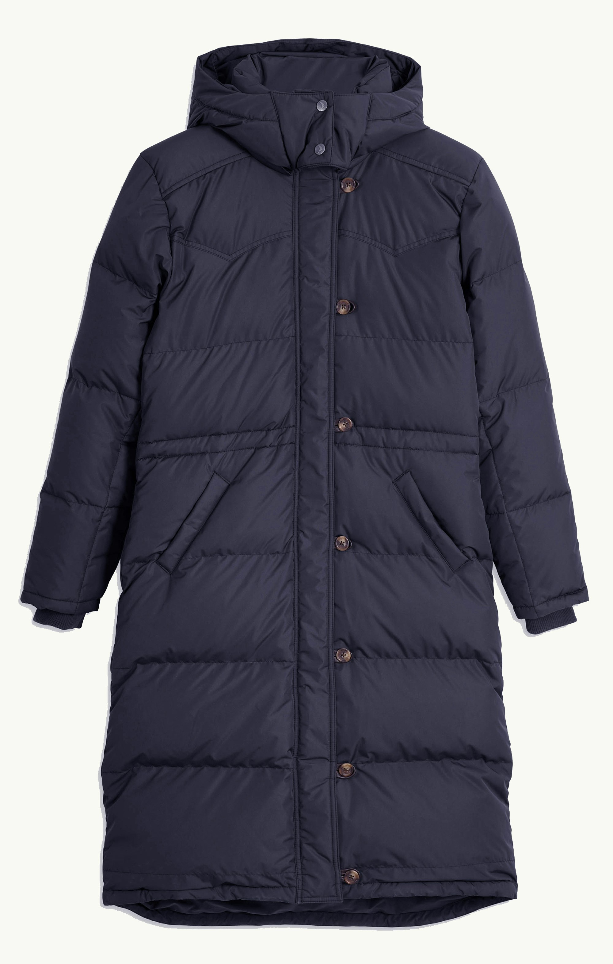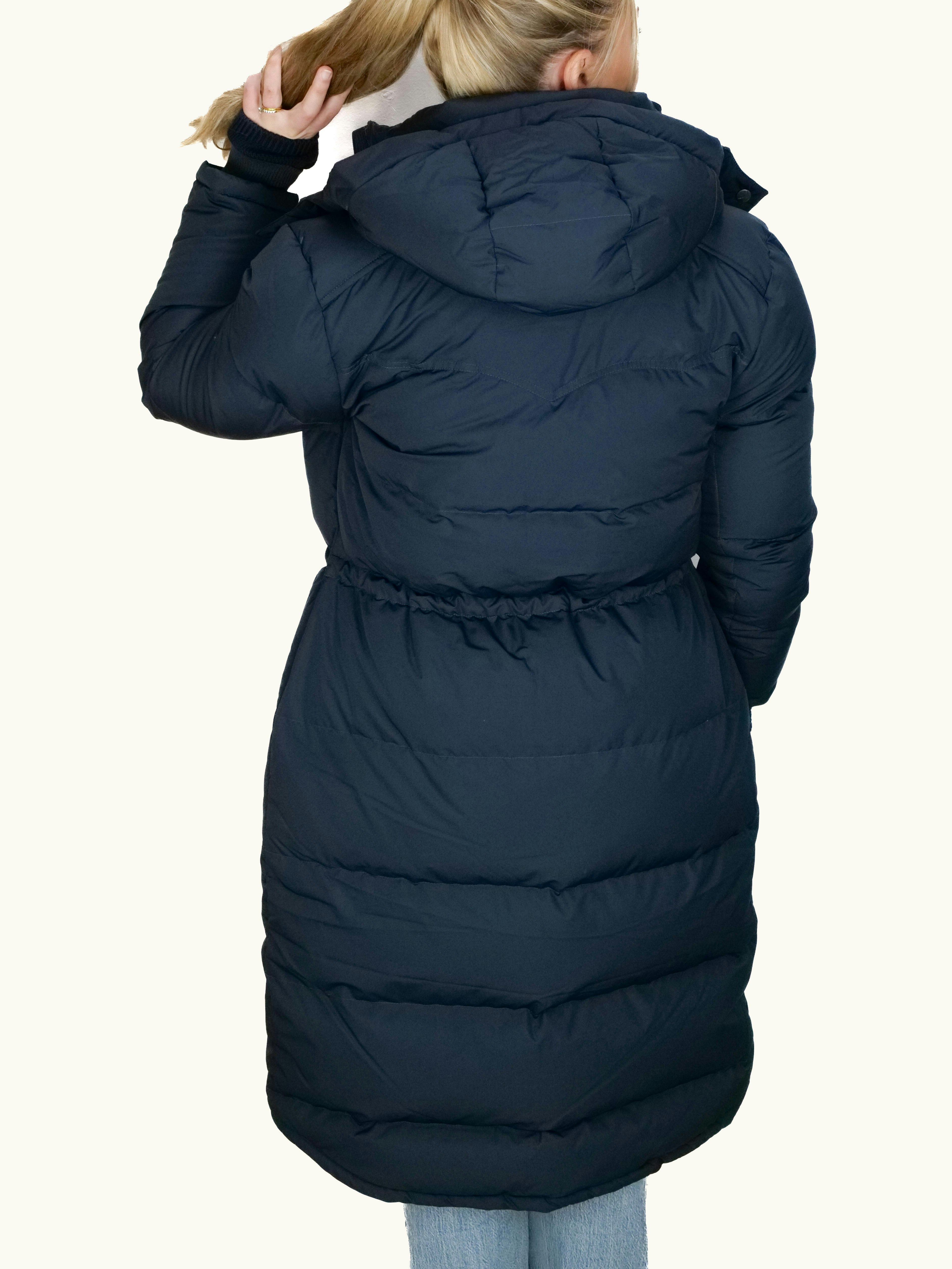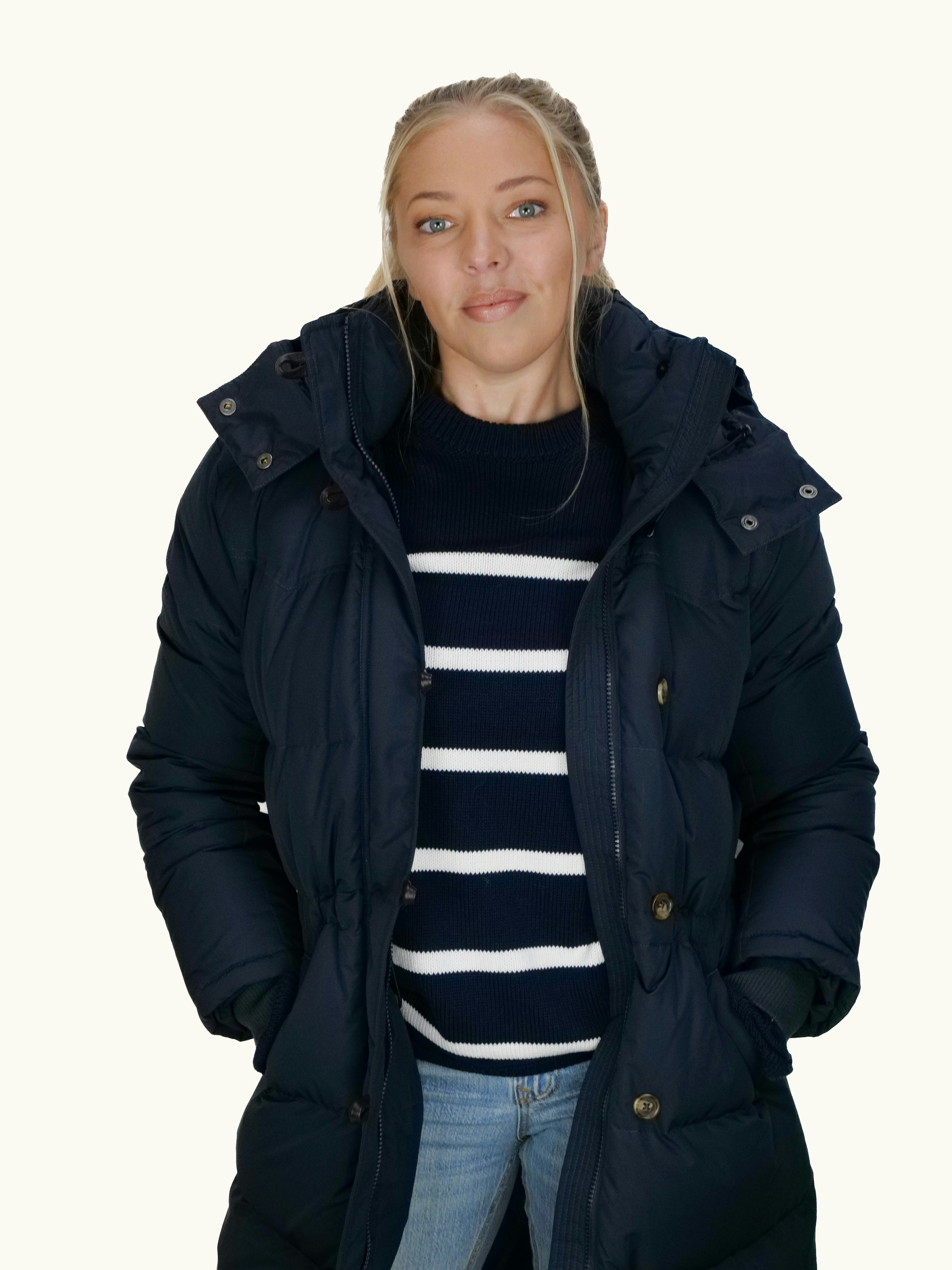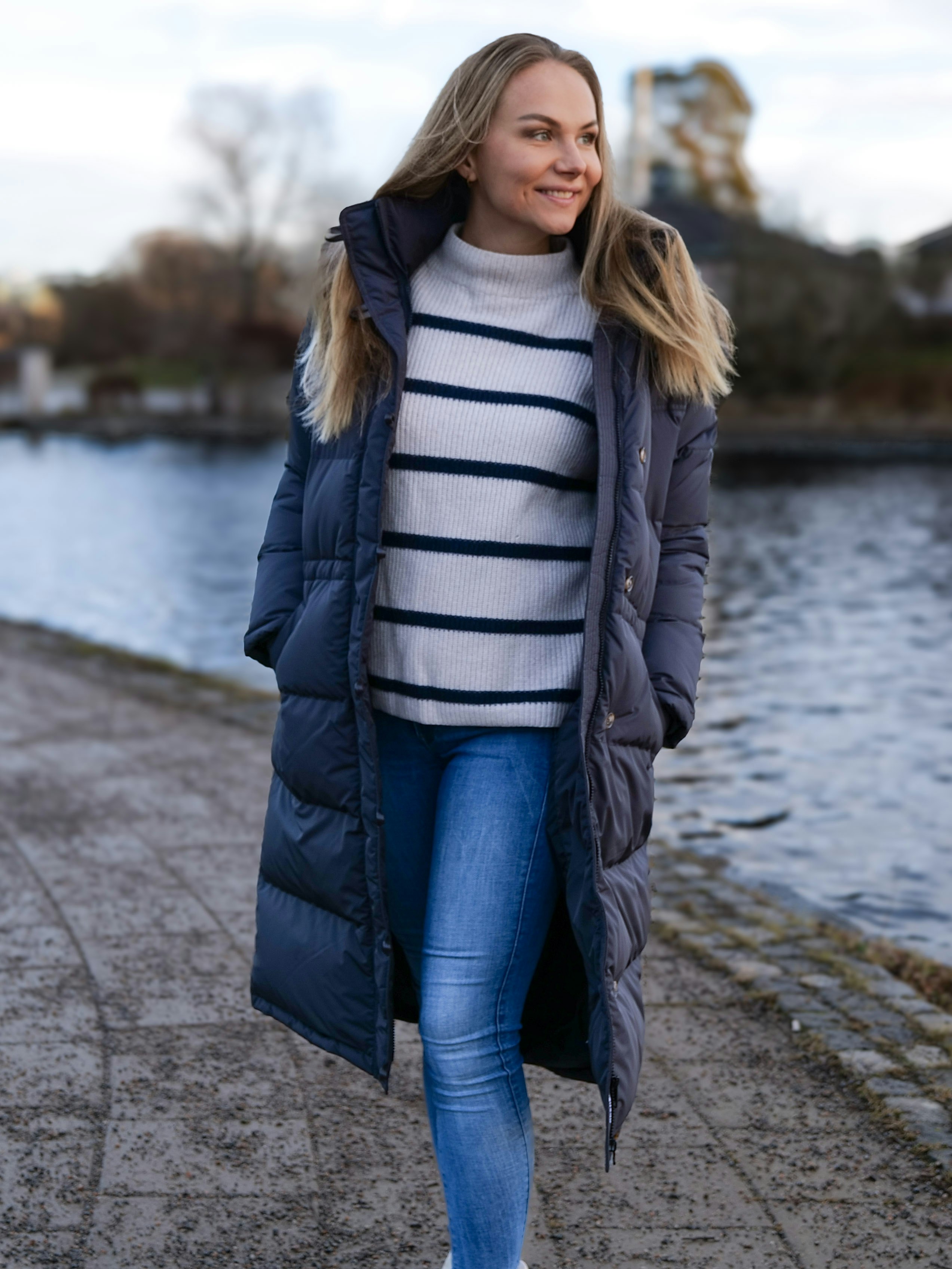 Alexandra lång är en detaljrik dunjacka designad för att hålla dig varm.
