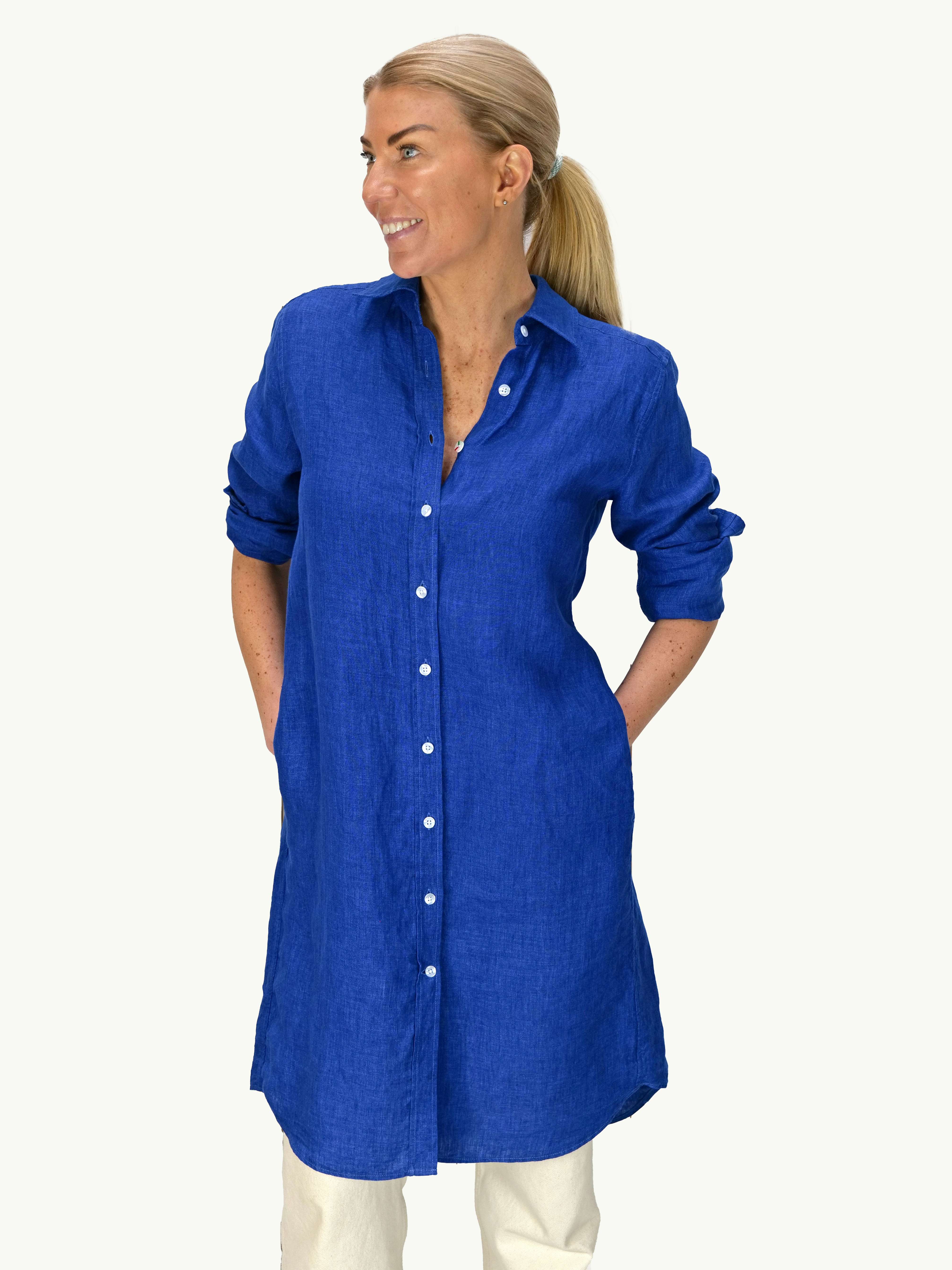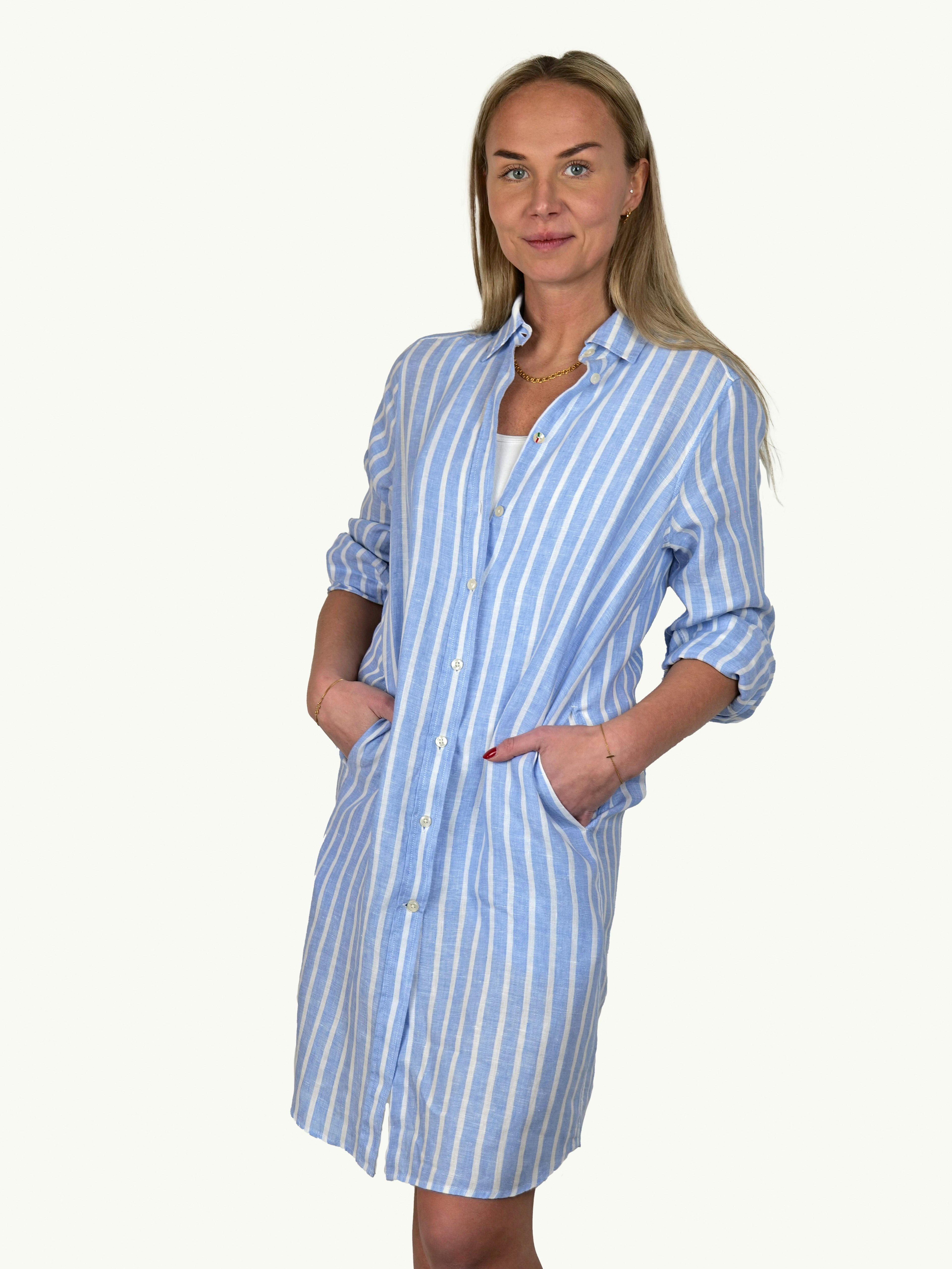 Den randiga Bea är en linneklänning med lång ärm, där ett klassiskt randigt uttryck möter en avslappnad och genomtänkt silhuett. Ränderna tillför liv och struktur, samtidigt som de förstärker känslan av sommar, kust och ledig elegans. Klänningen är lika självklar i skärgården som i staden, på kontoret eller vid mer uppklädda tillfällen.