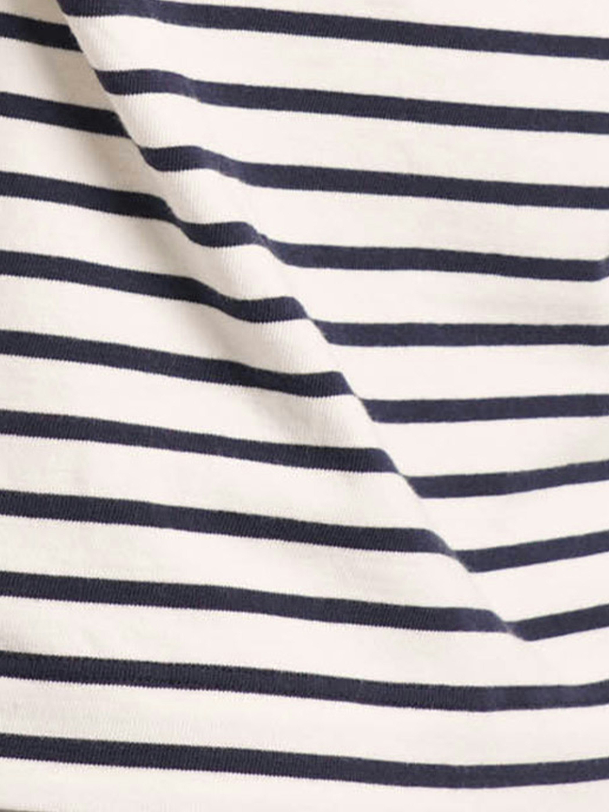 Den randiga t-shirten Bolmsö med lång ärm återvänder som en omtyckt klassiker, nu stolt stickad i Sverige. Tröjan är tillverkad av ekologisk bomull som har en mjuk och behaglig känsla mot huden. Tröjans design är enkel och rak. Ett distinkt inslag är den broderade Boomerang-loggan som pryder vänster ärm. Genom att avstå från traditionella muddar och istället välja en subtil båtringning, framhävs tröjans minimalistiska och handgjorda karaktär. Bolmsö är en mångsidig tröja, perfekt för användning genom alla årstider, och ett plagg att värna om och bära med glädje under många år. Tröjan är vit i botten och har Mörkblå ränder.