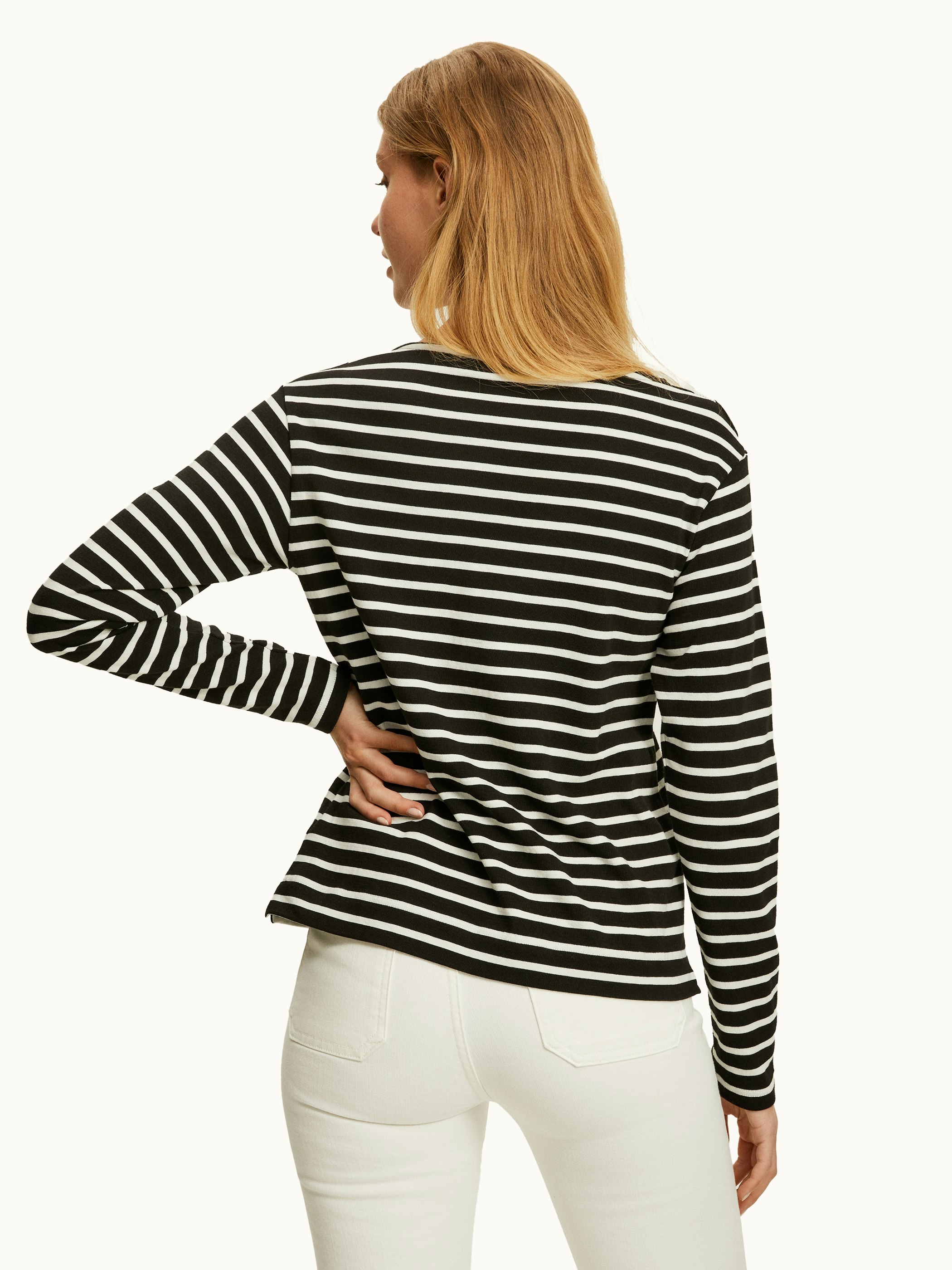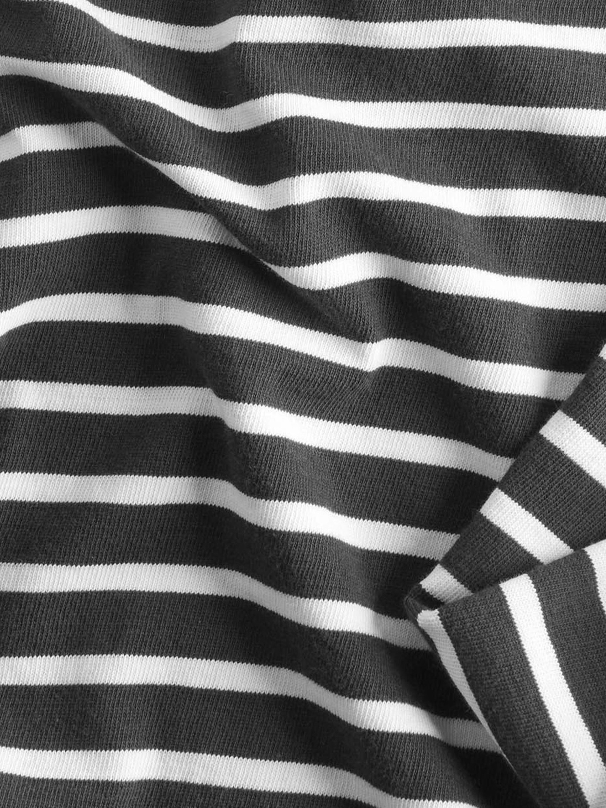 Den randiga t-shirten Bolmsö med lång ärm återvänder som en omtyckt klassiker, nu stolt stickad i Sverige. Tröjan är tillverkad av ekologisk bomull som har en mjuk och behaglig känsla mot huden. Tröjans design är enkel och rak. Ett distinkt inslag är den broderade Boomerang-loggan som pryder vänster ärm. Genom att avstå från traditionella muddar och istället välja en subtil båtringning, framhävs tröjans minimalistiska och handgjorda karaktär. Bolmsö är en mångsidig tröja, perfekt för användning genom alla årstider, och ett plagg att värna om och bära med glädje under många år. Tröjan är svart i botten och har vita ränder.