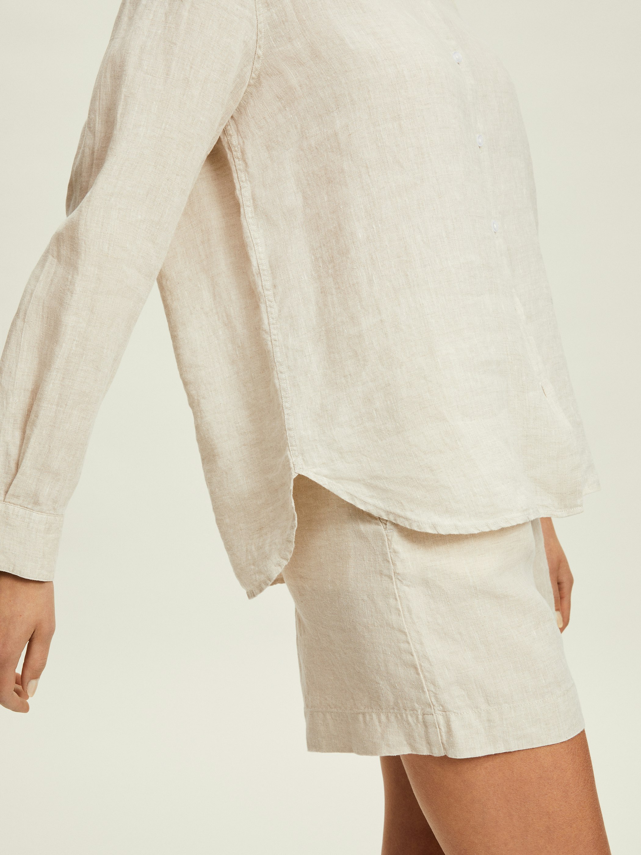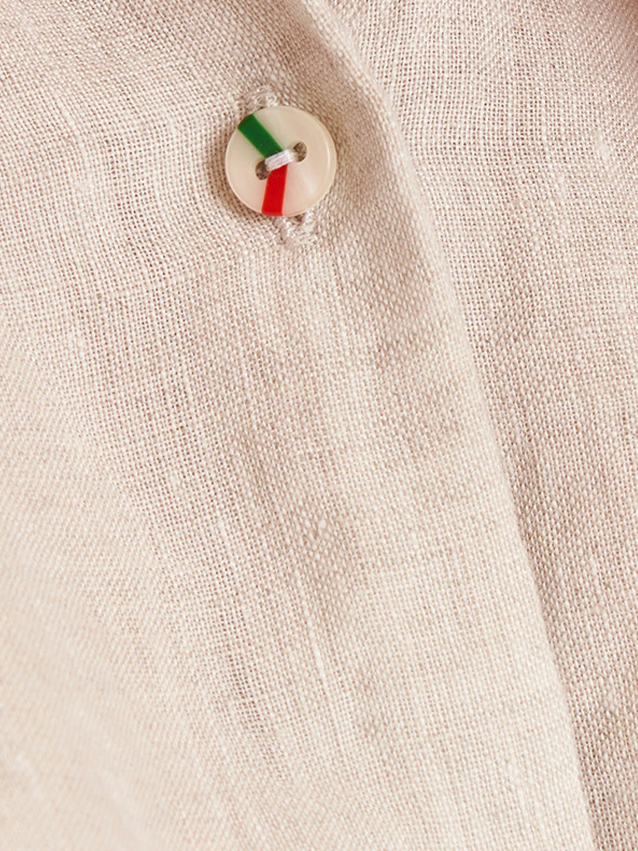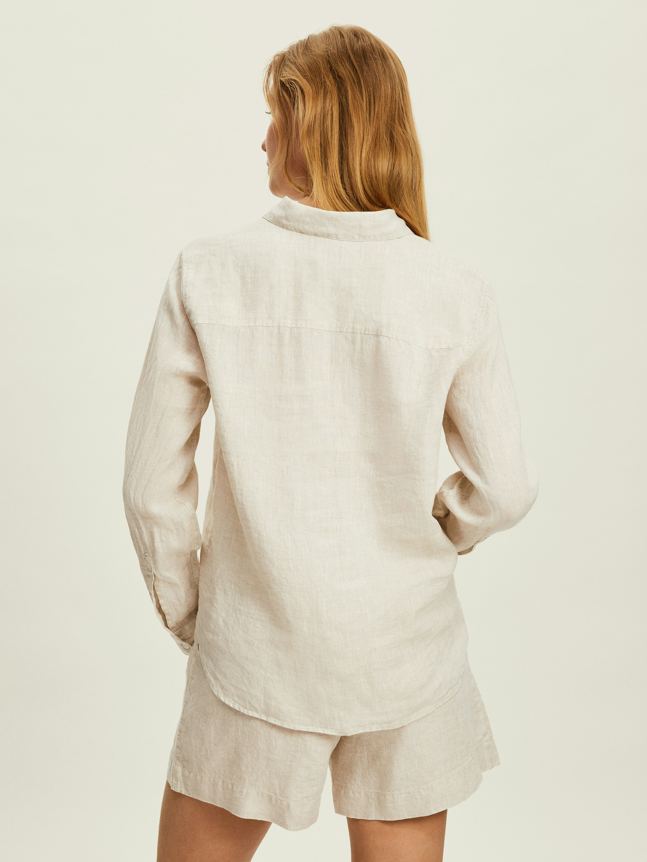 Skjortan har en nätt krage och knäppning utan placket. Det förtvättade linnet ger en mjuk känsla mot huden och en långvarig passform som håller tvätt efter tvätt.