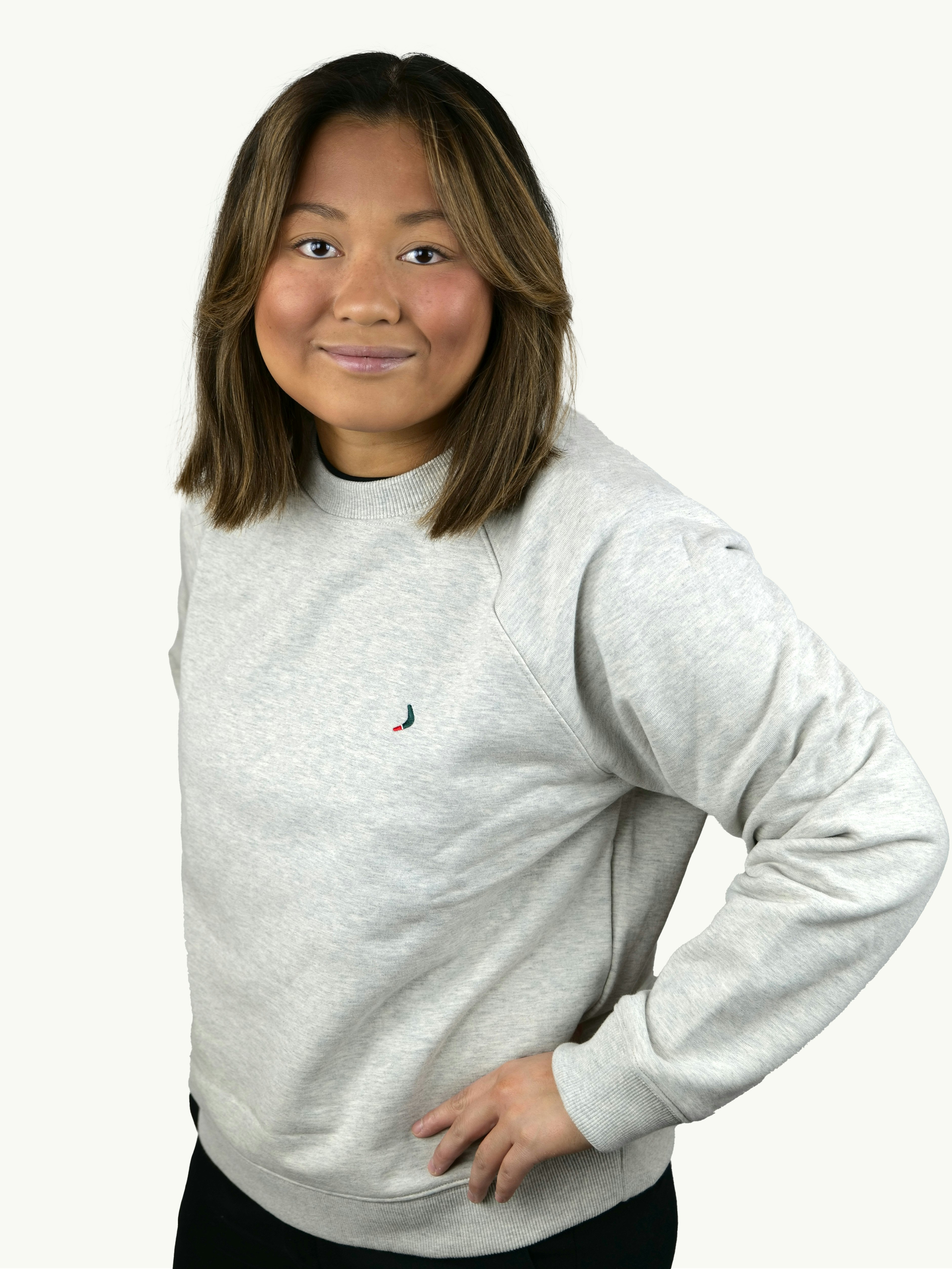 Tröjan har en rund hals och raglanärmar. På bröstet sitter en broderad Boomerang-logga.