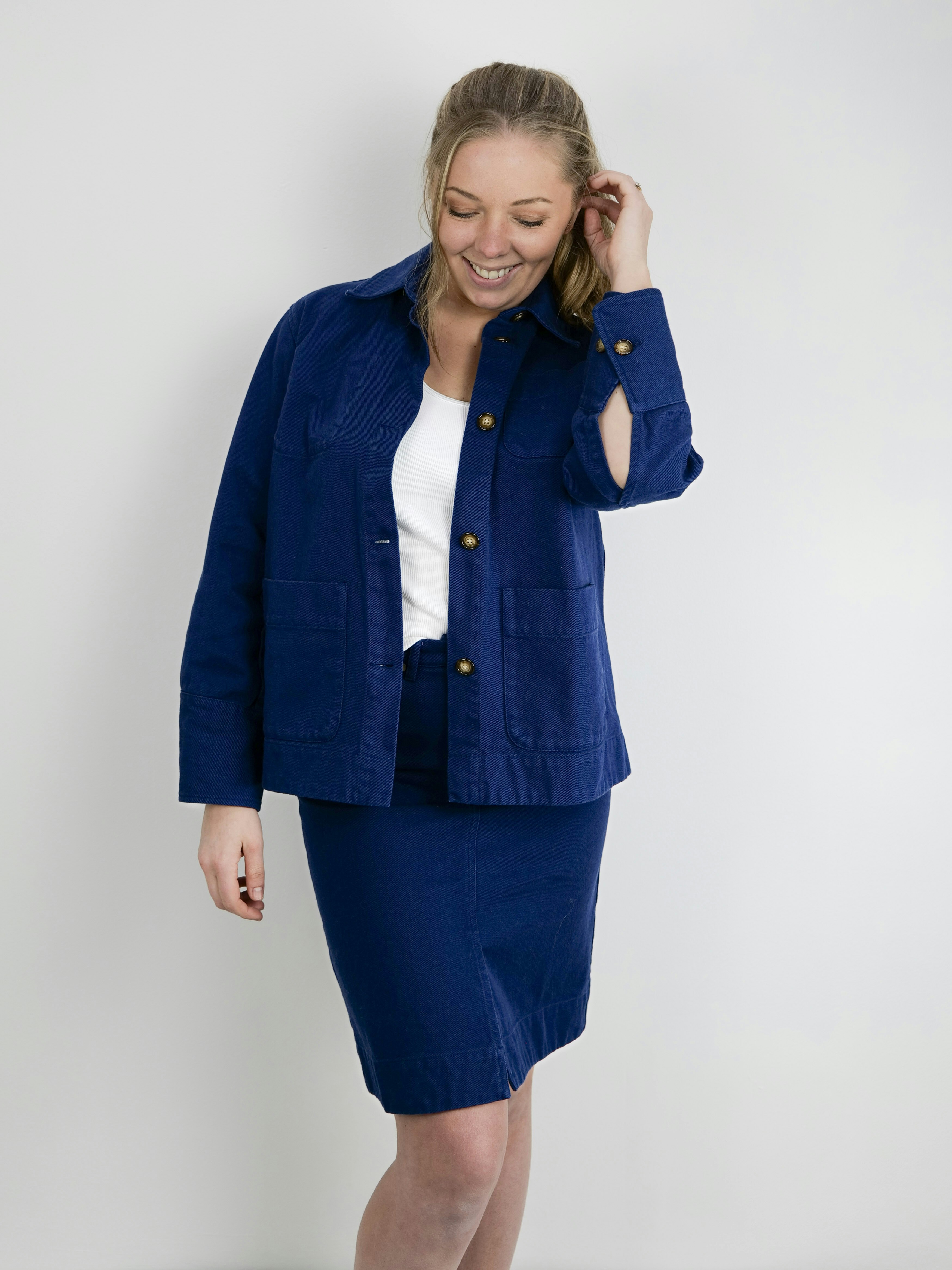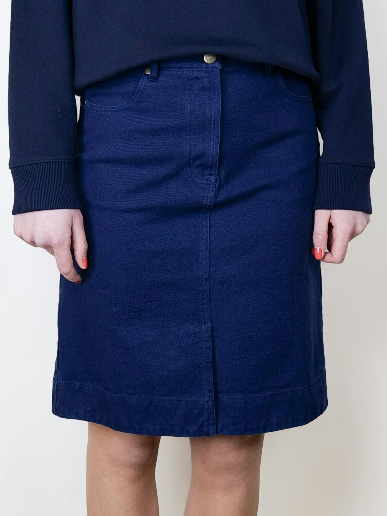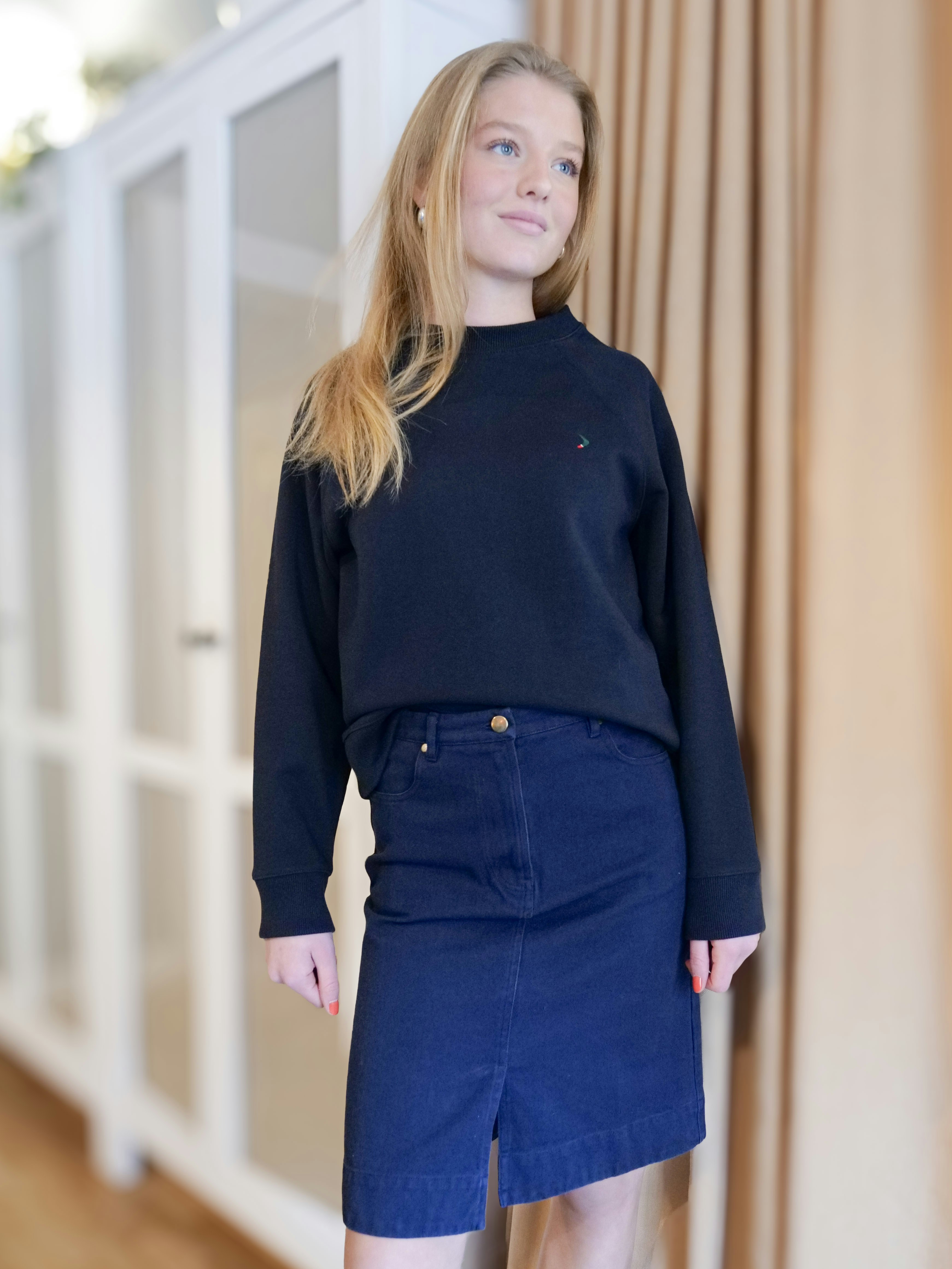 Kjolen har klassiska denimattribut med zip-öppning och fickor fram och bak. Ett sprund finns fram för rörelsevidden