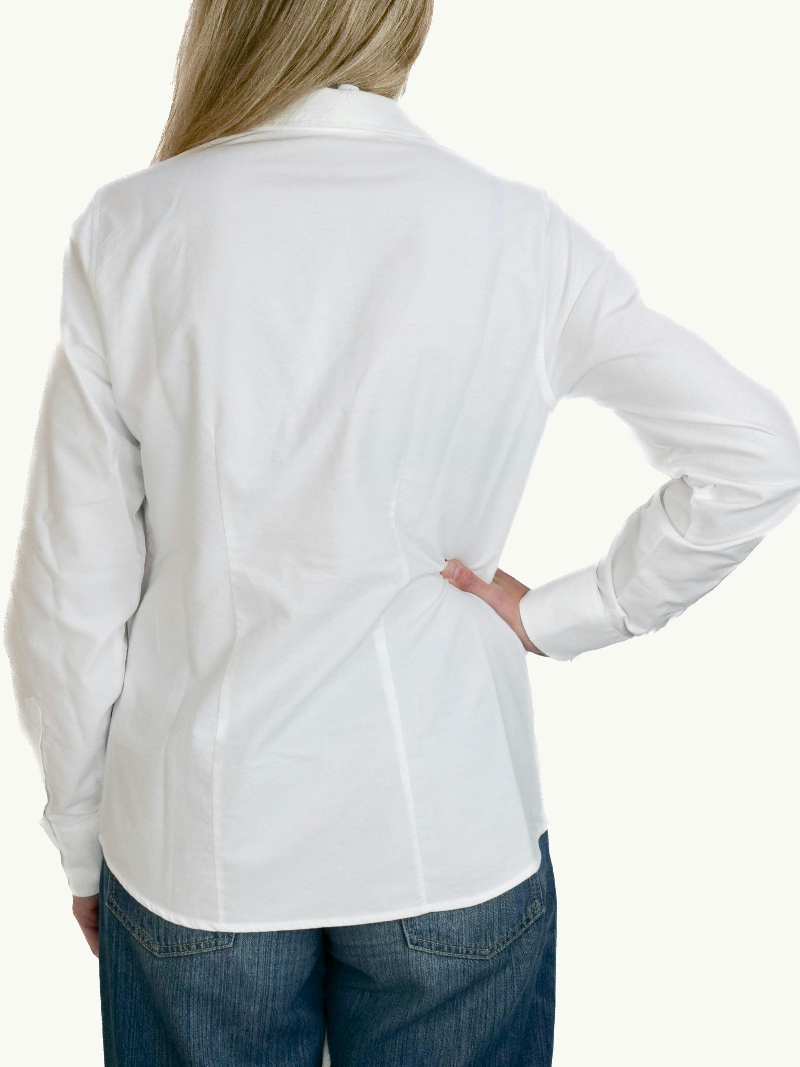 Den är formad med ett rundat nederkant som passar att bäras både utsläppt och instoppad. Skjortans rygg har smickrande insnitt som framhäver passformen, och manschetterna är förstärkta med två knappar.