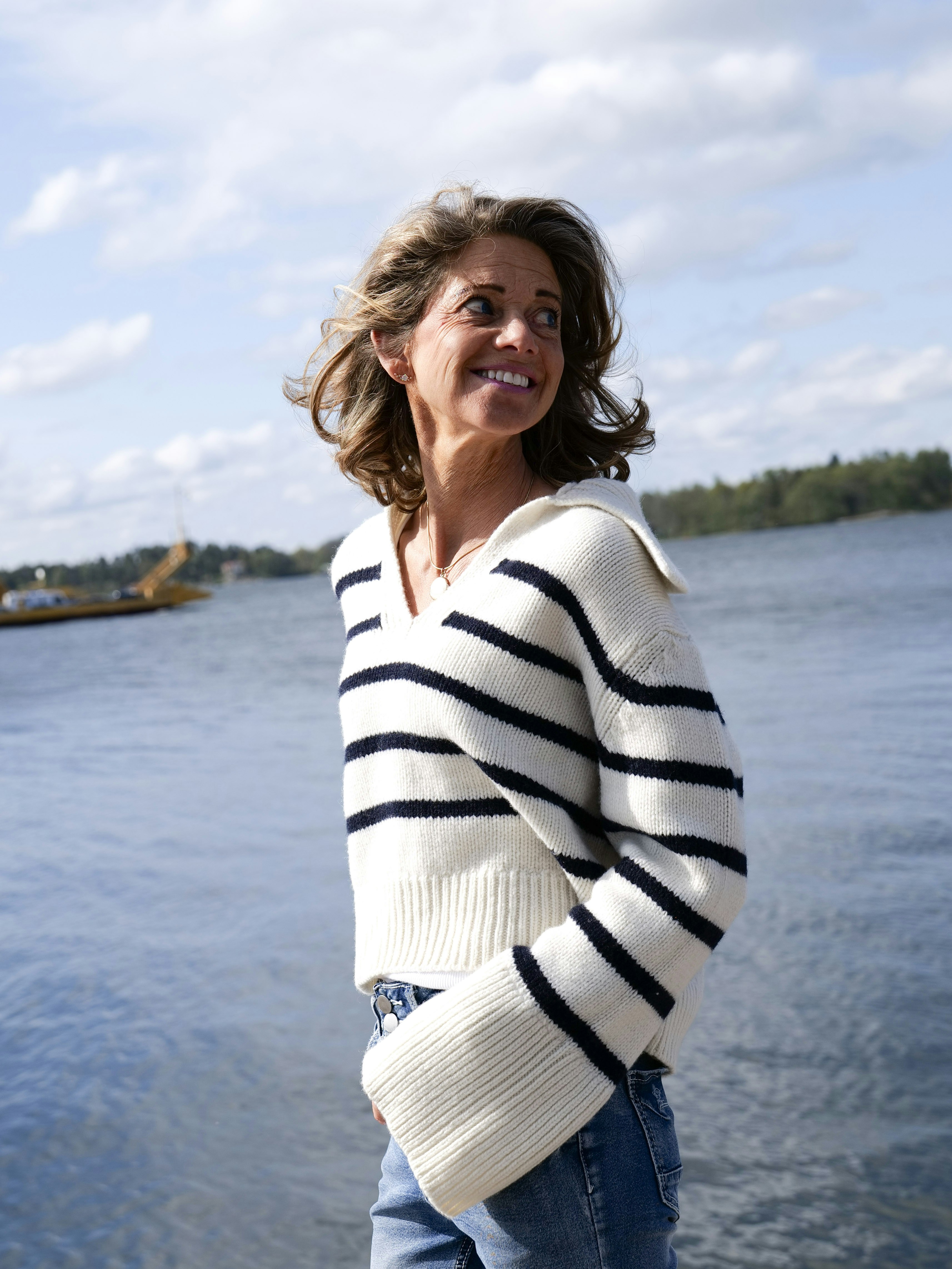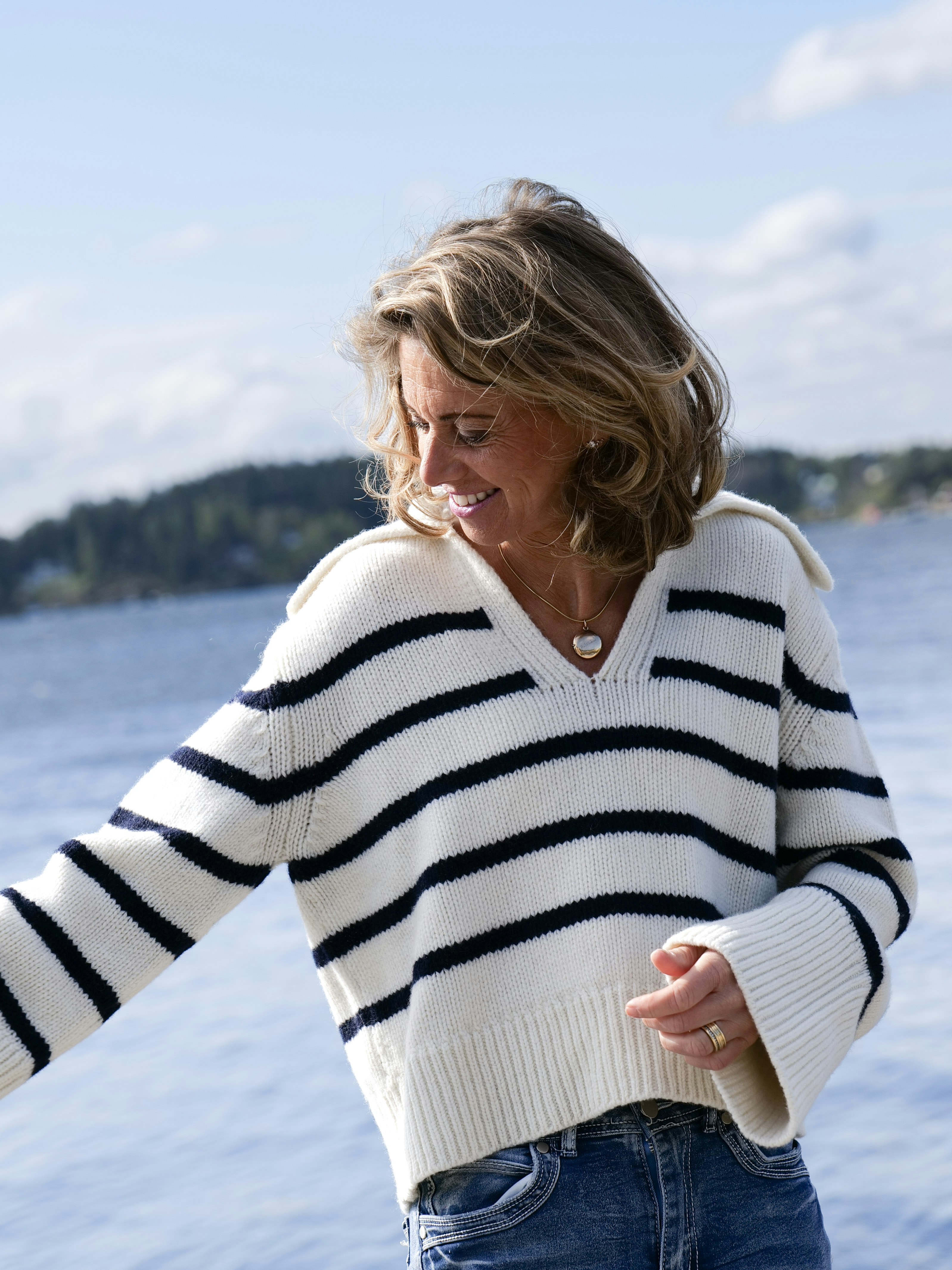 Hojskär är en stickad tröja i en exklusiv blandning av återvunnen ull, ny ull och cashmere – en harmonisk kombination som ger både värme, mjukhet och ett hållbart tänk. Tröjan har en avslappnad passform med en kortare längd och lite vidare siluett, perfekt för lager på lager under kyliga dagar.