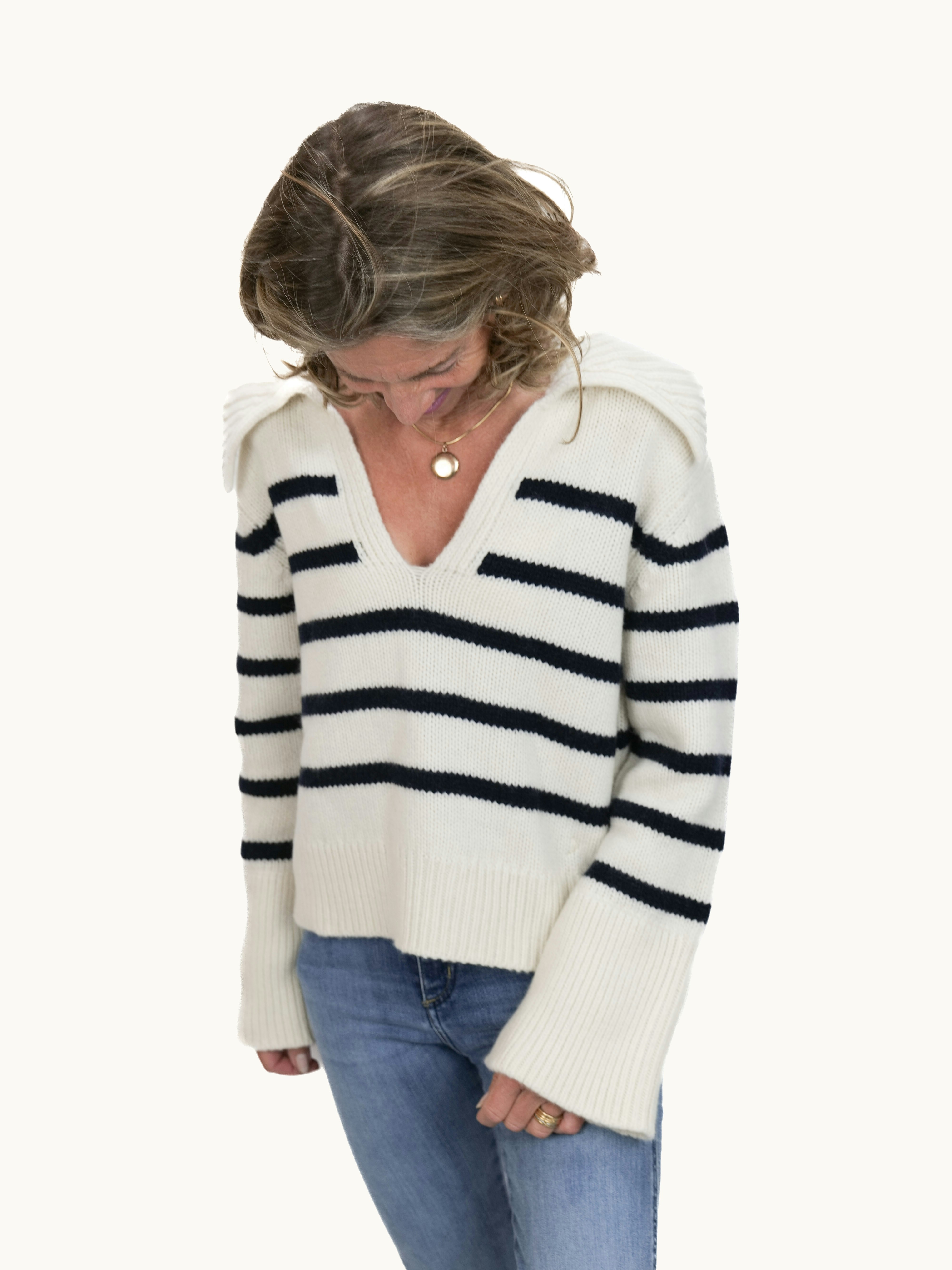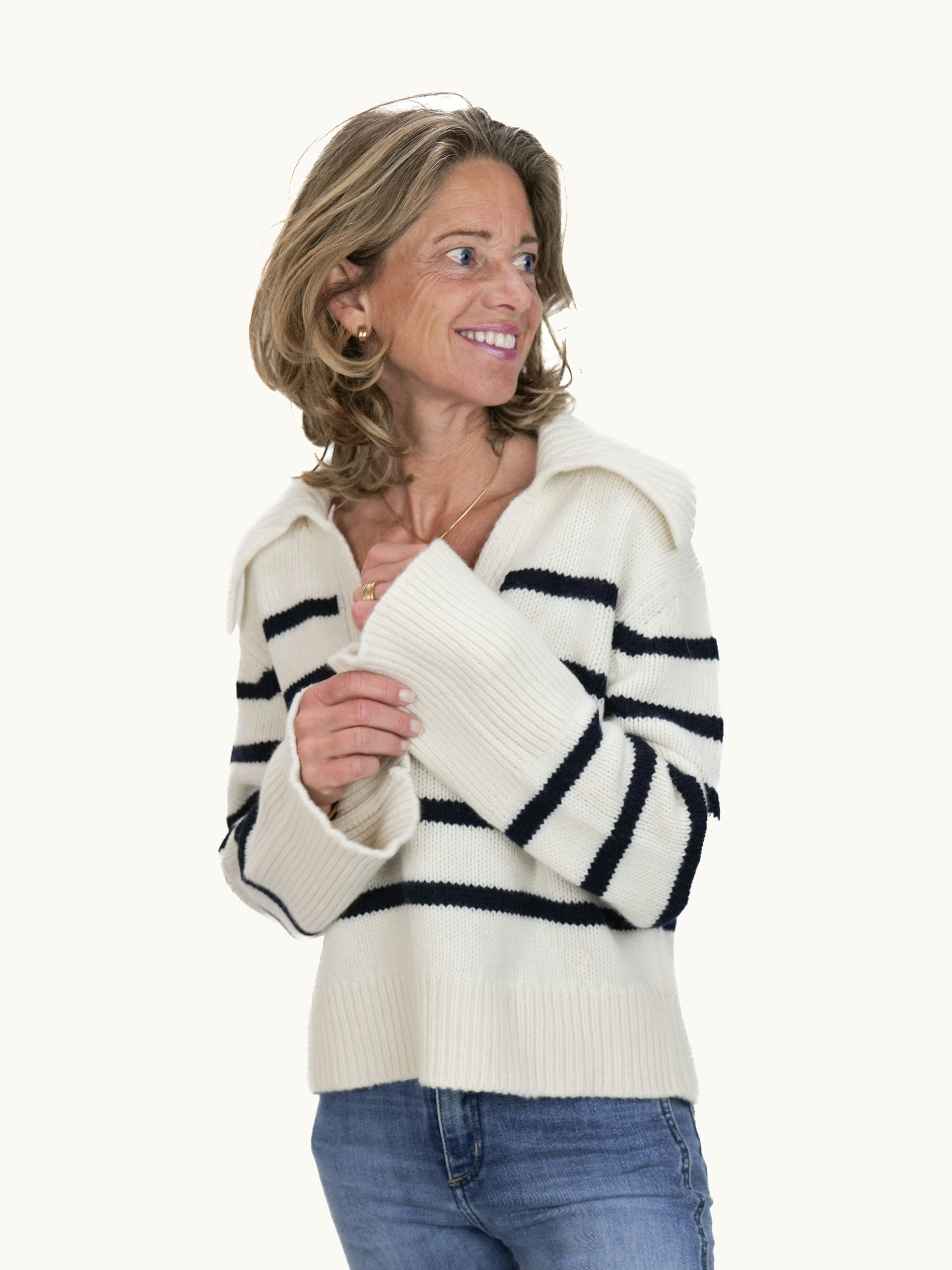 Den generösa stickade kragen och splitten mitt fram skapar en balanserad och elegant look, medan ett rakt ärmavslut med en generös ärmlängd ger ett modernt fall och extra rörelsefrihet. Längst ner sitter en marinblå broderad Boomerang-logga – en liten men tydlig påminnelse om kvalitet och hantverk.