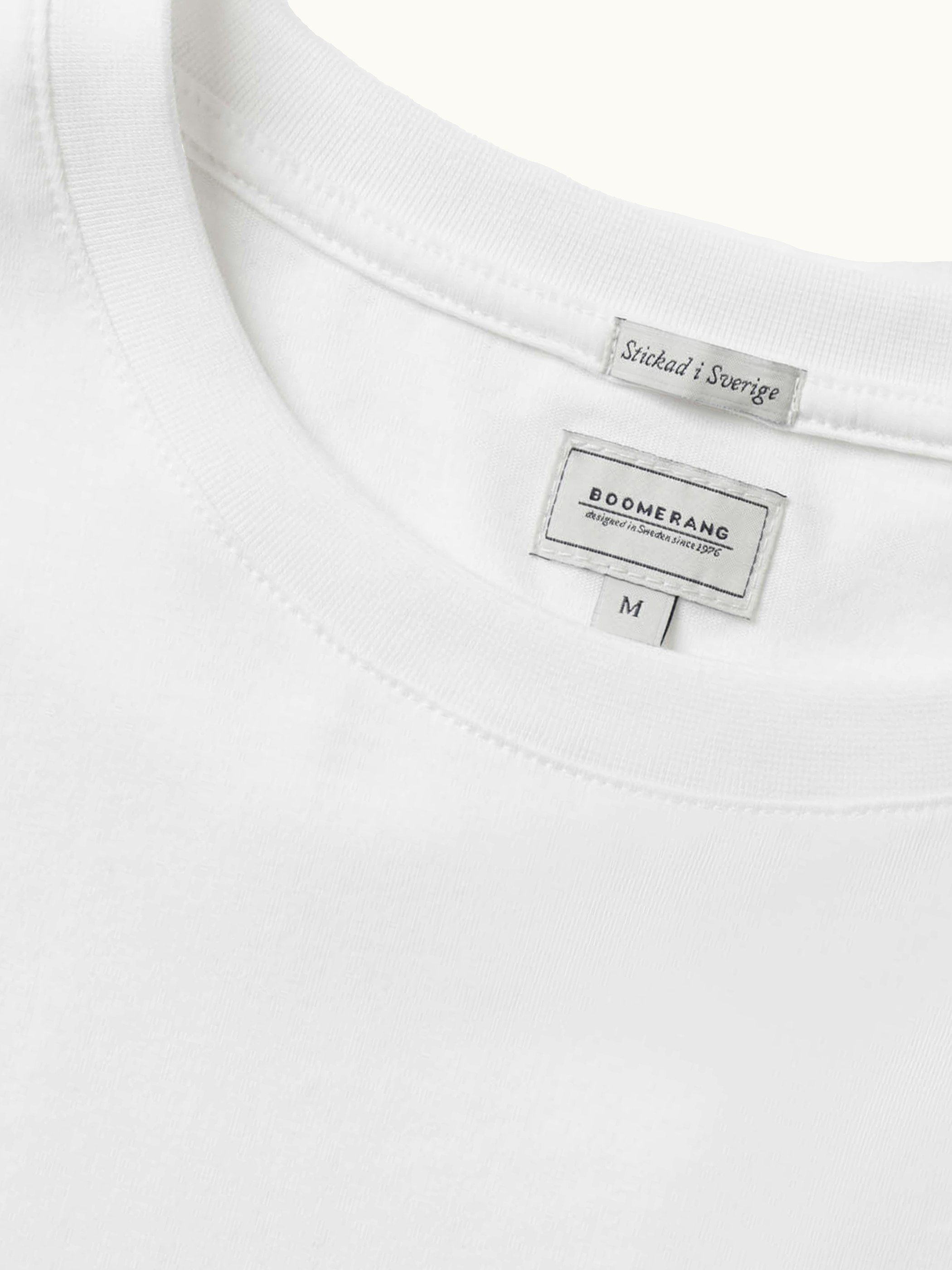 Halsringningen har en bredare ribbning och på vänster axel finns en Boomerang-logga broderad.