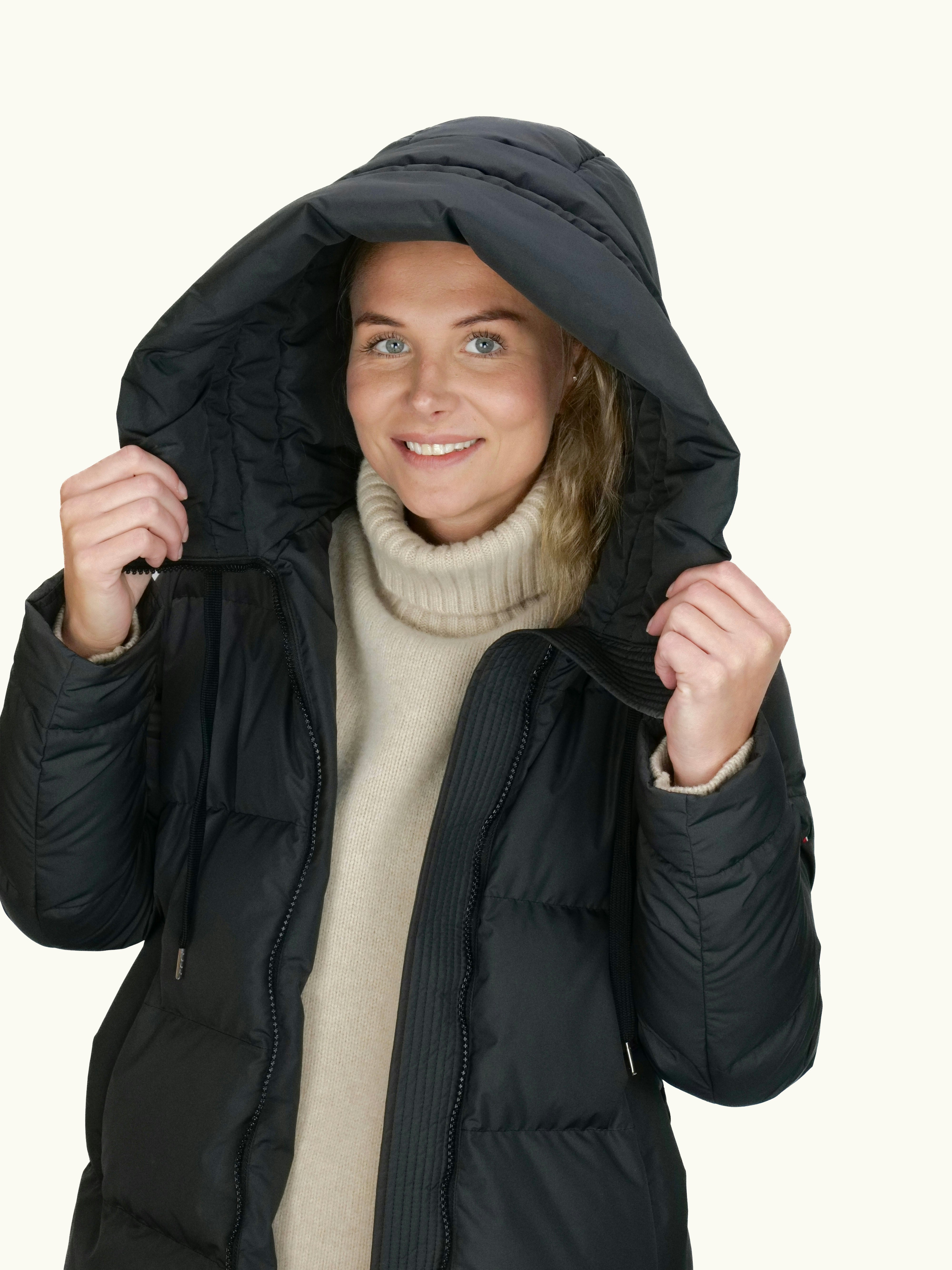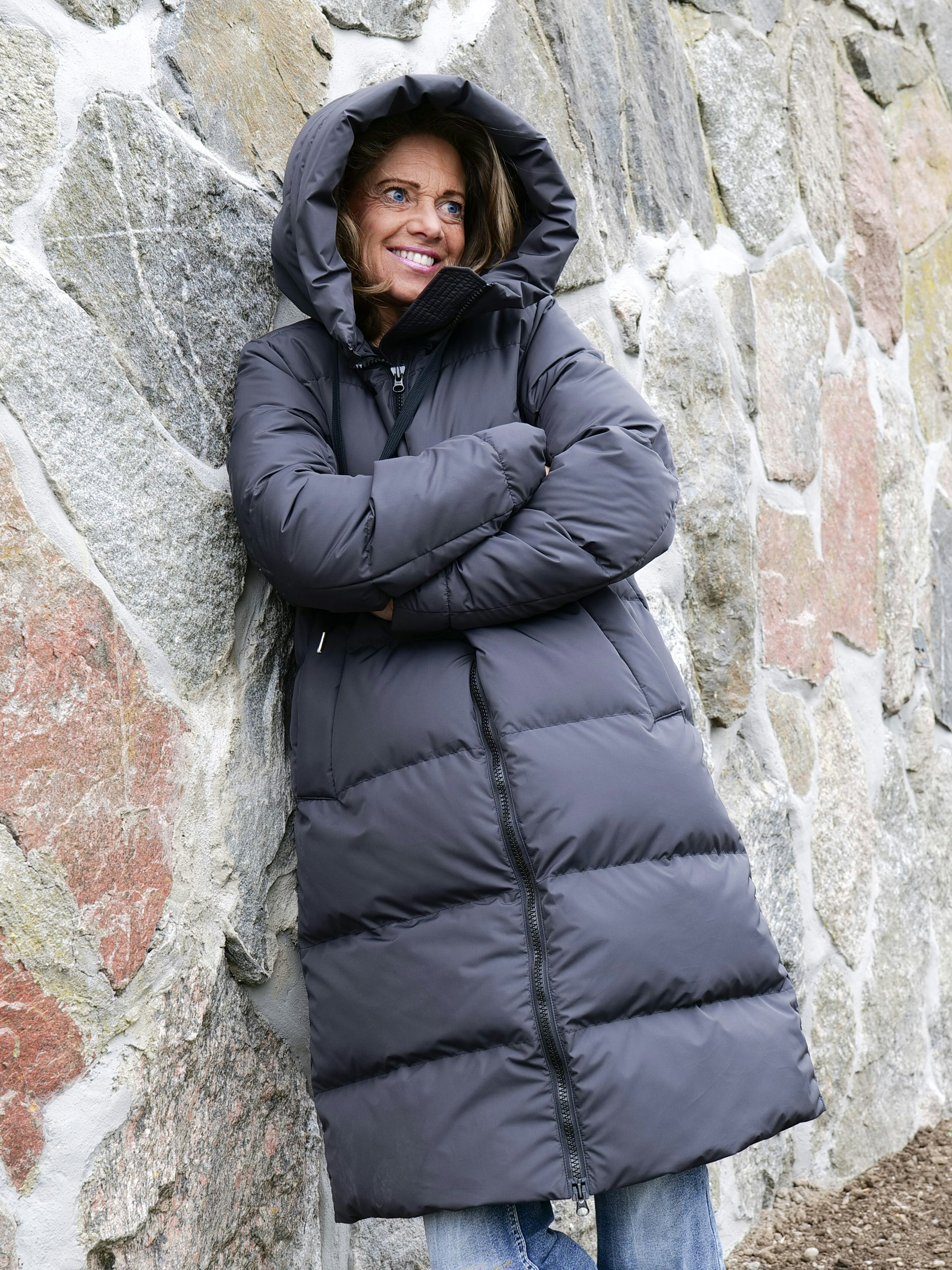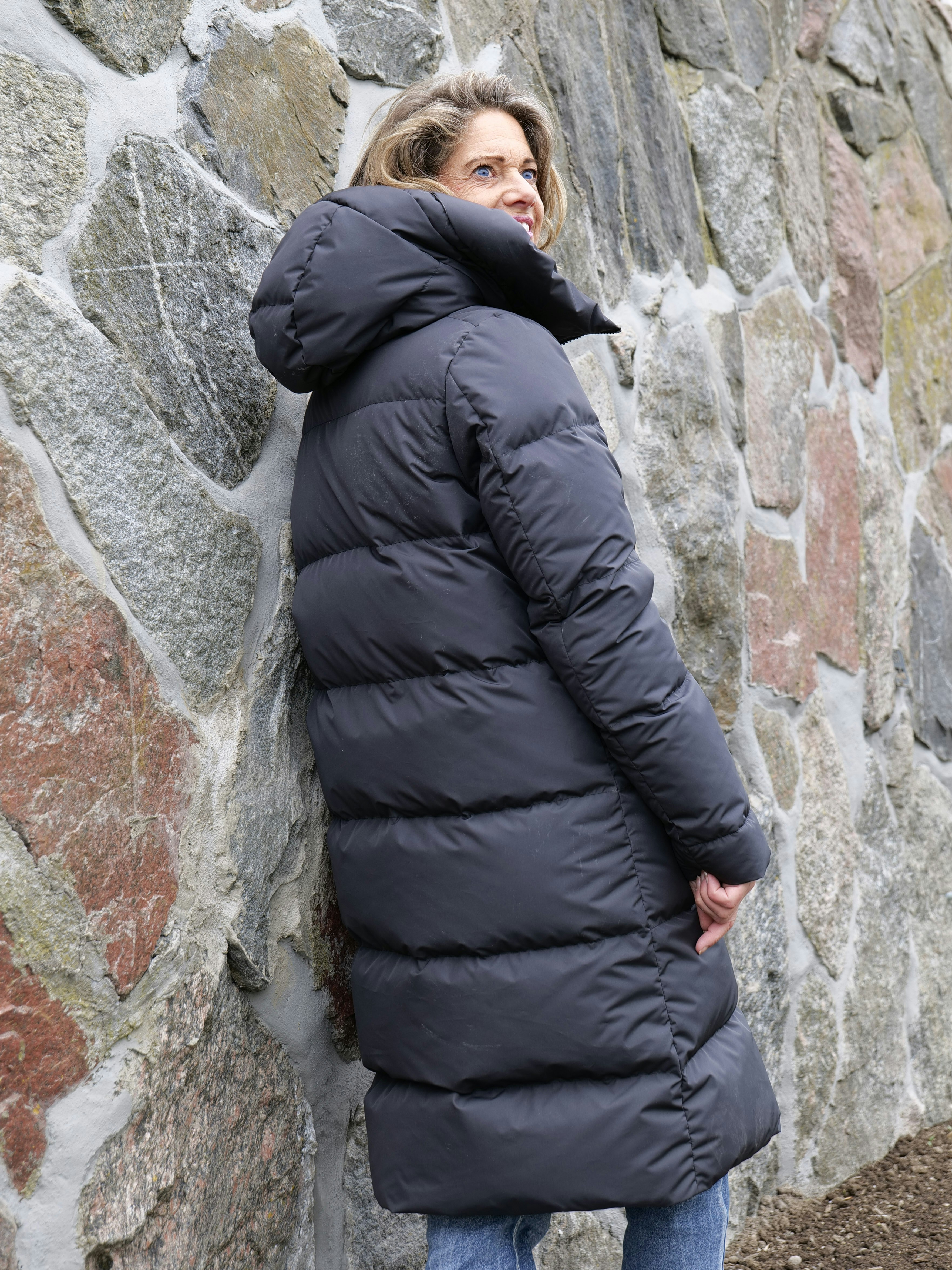 En lång, värmande dunjacka med stor, mysig huva – nu i ett uppdaterat yttertyg, samma som våra klassiska Alexandrajackor.