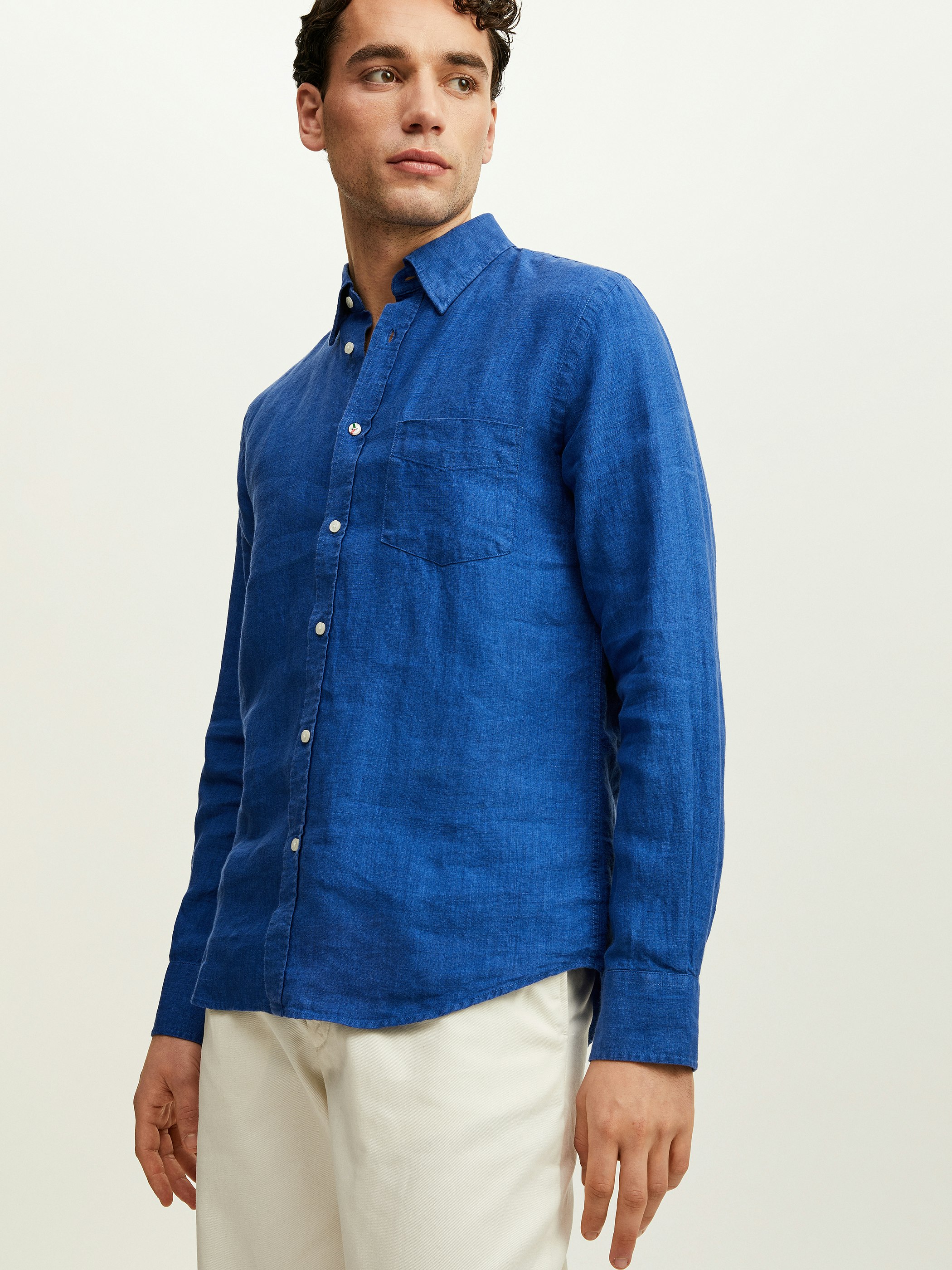 Koster linneskjorta har en mer skräddad passform, vilket innebär att den är något smalare i midjan. Skjortan har en klassisk krage med dold button down och en praktisk bröstficka för extra funktionalitet.