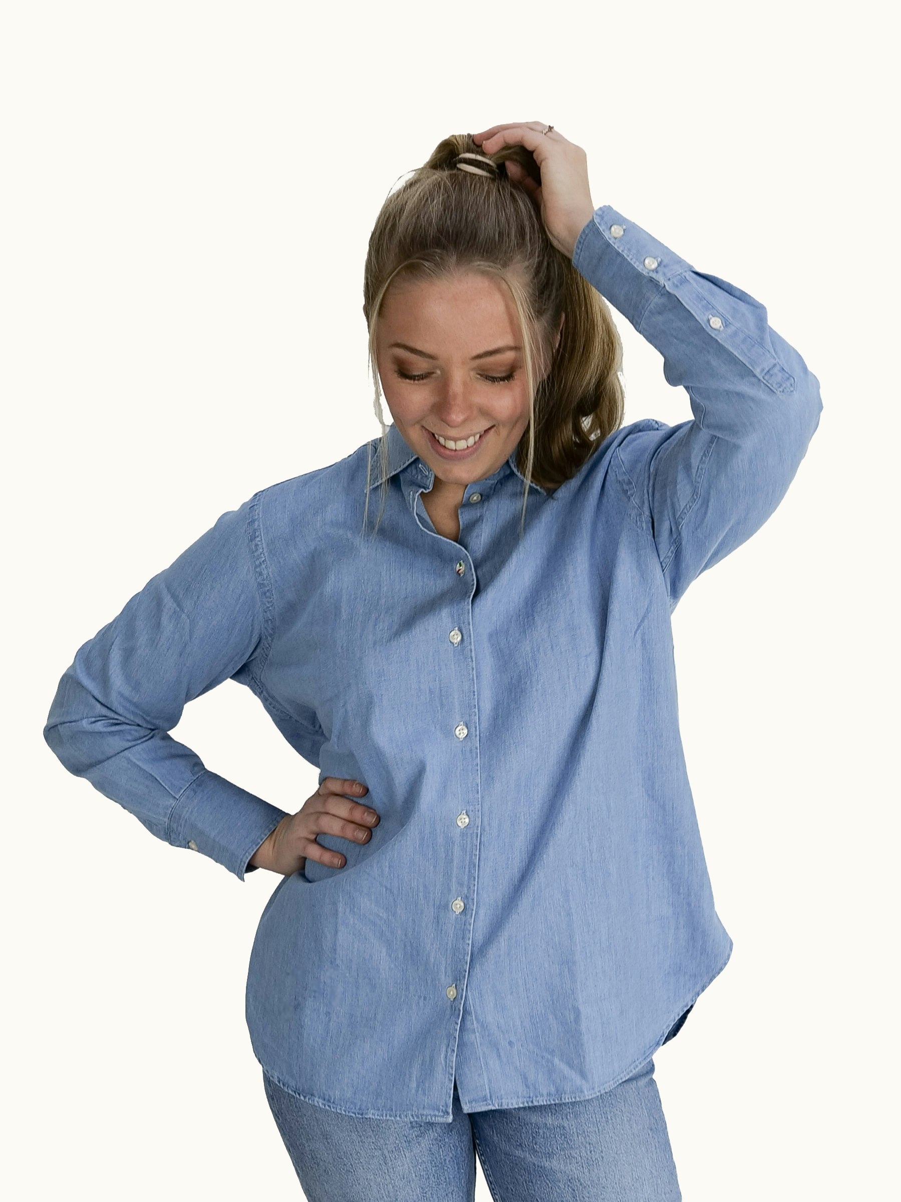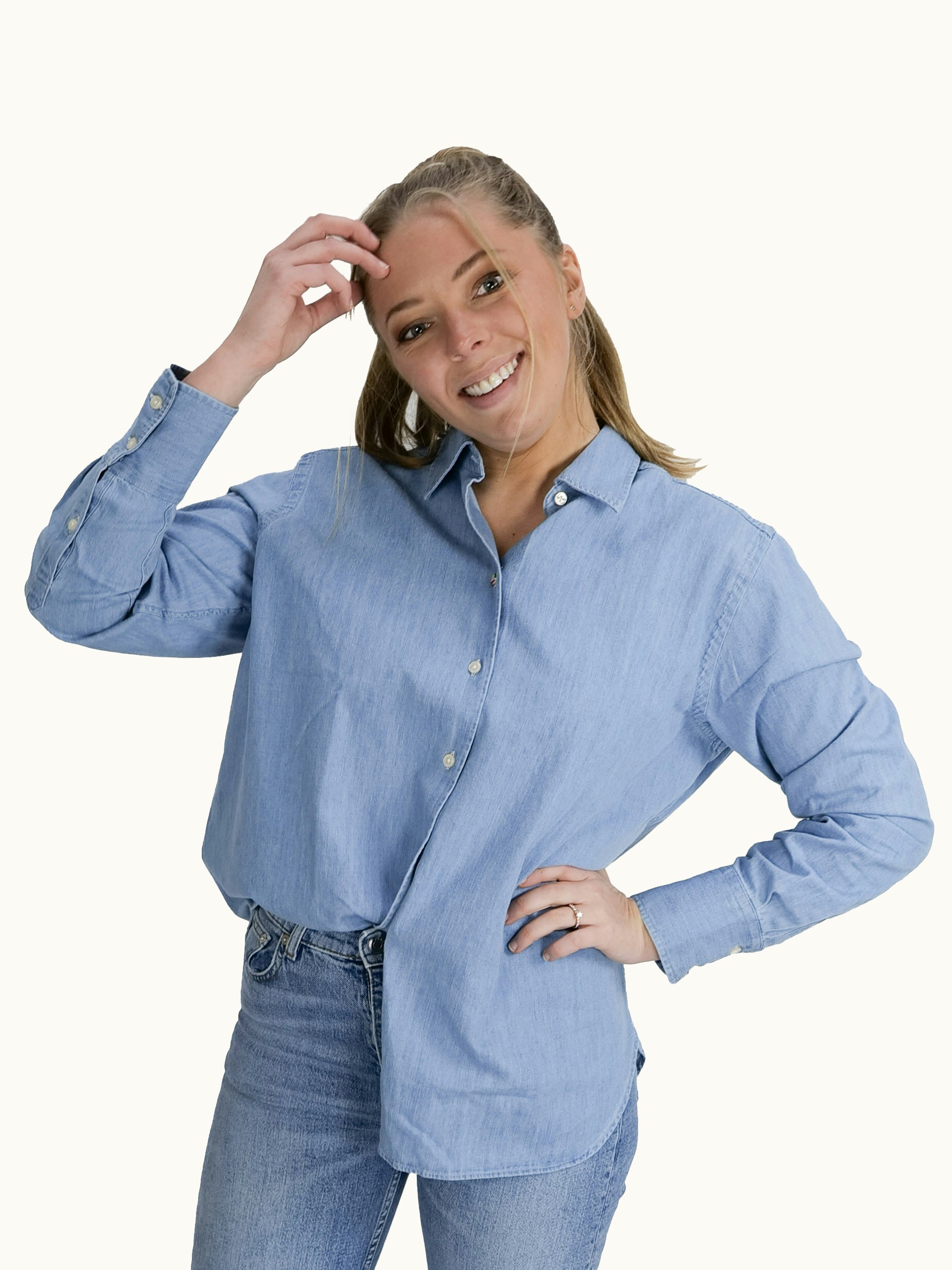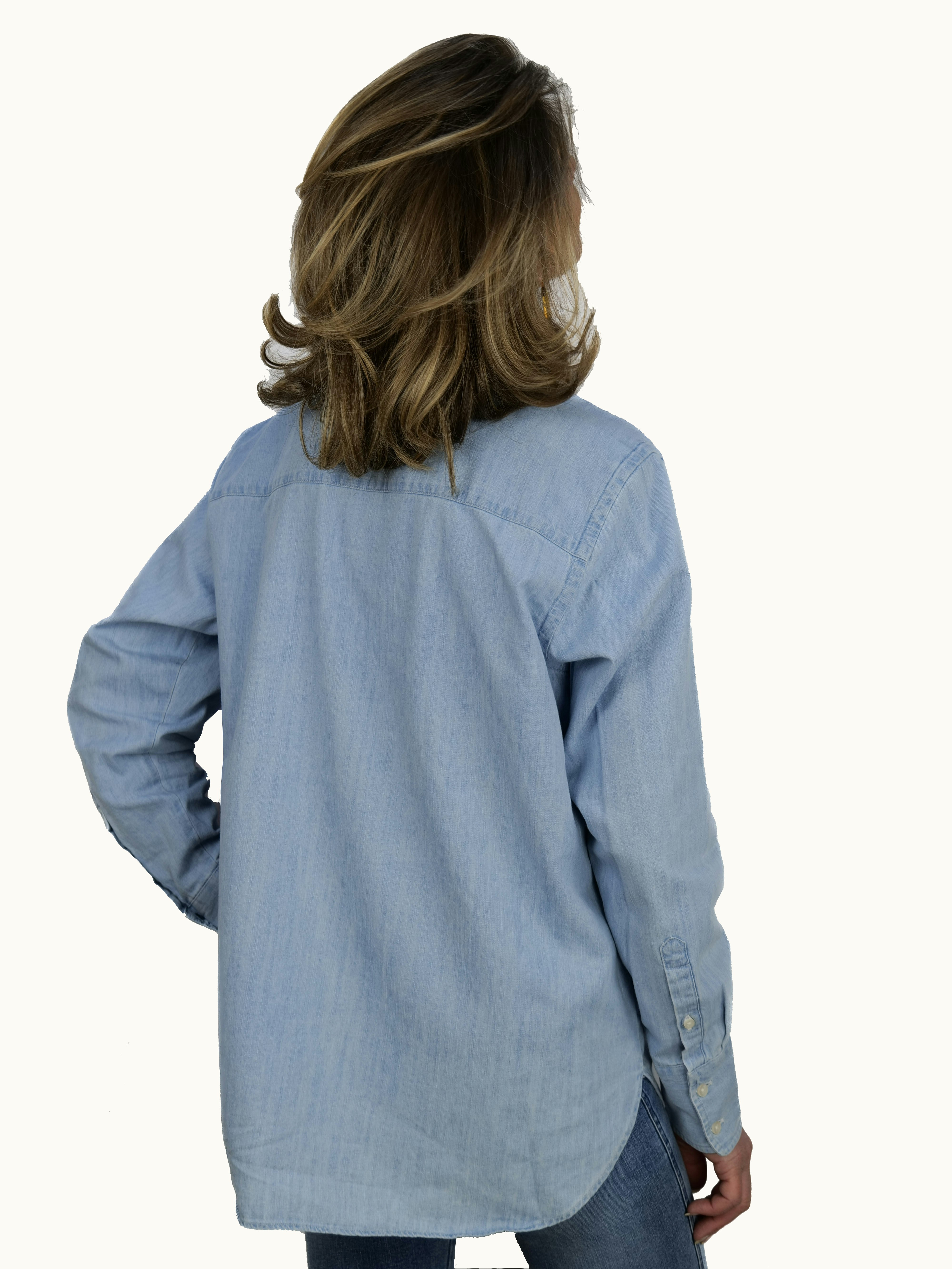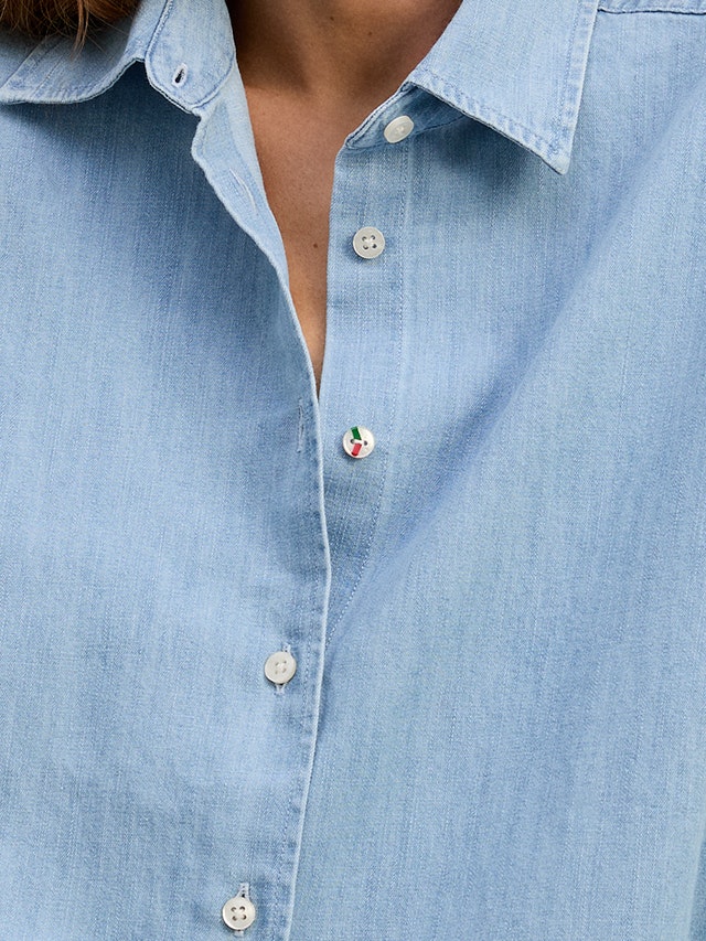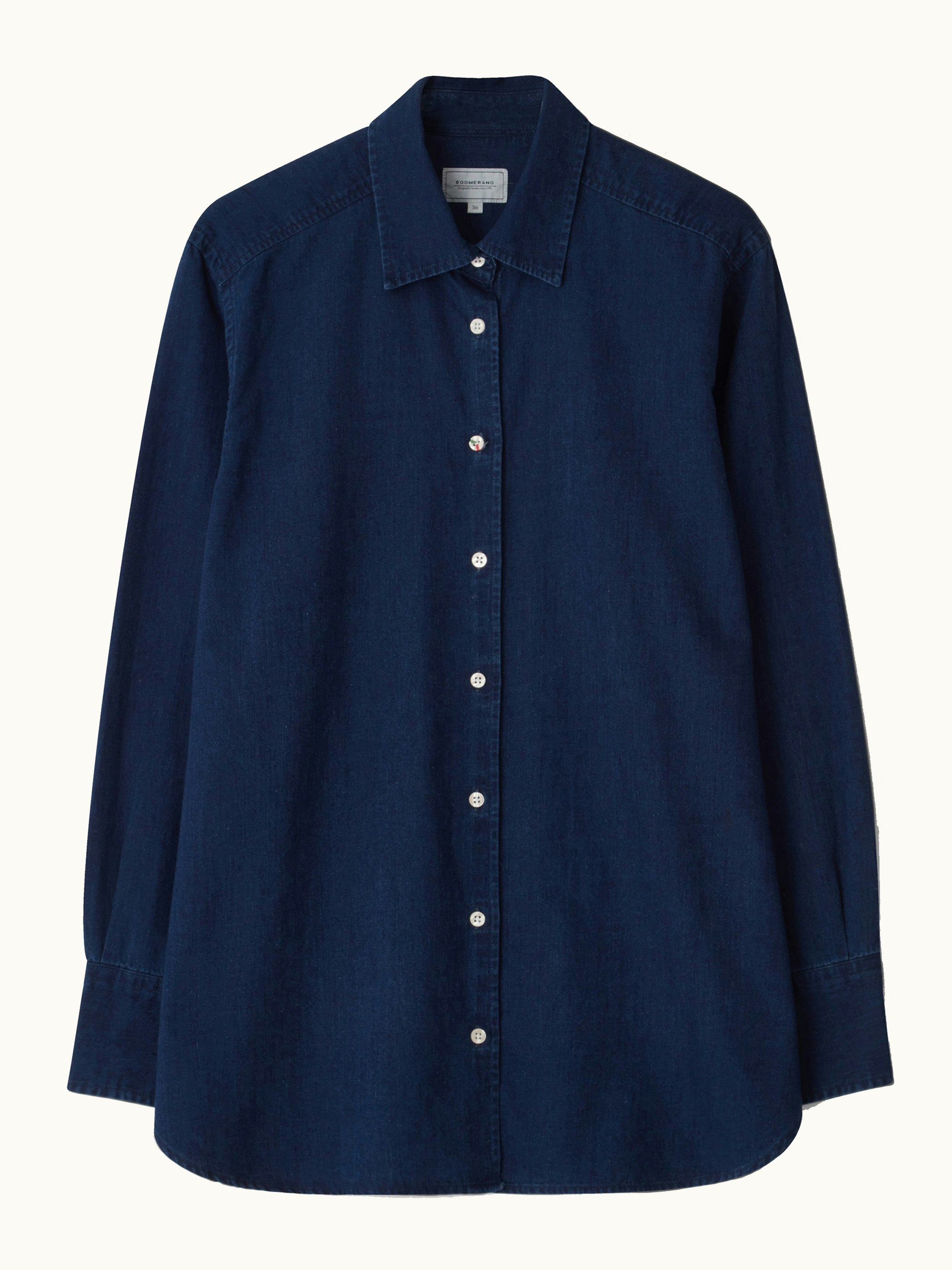 Skjortan har en rakare passform åt oversize med rundad nederkant och en något högre manschett. Skjortan har vår handmålade Boomerang-knapp som tredje knapp.