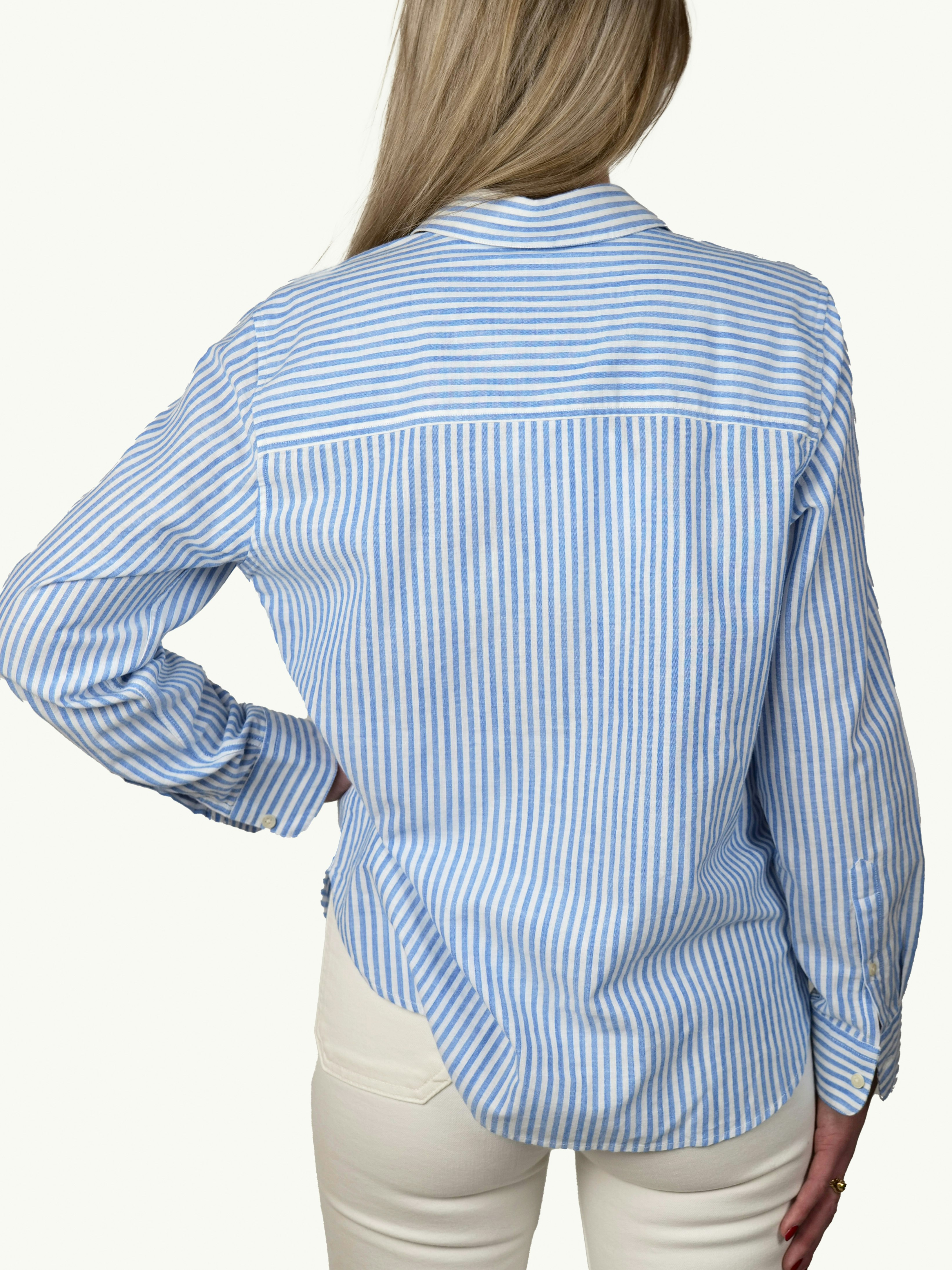 Vår tidlösa favoritskjorta Lina i en flaméväv i en 100% ekologisk bomull. Mjuk att bära med en fin linnekaraktär. Skjortan har en avslappnad passform och ok baktill samt den handmålade Boomerang-knappen som tredje knapp.