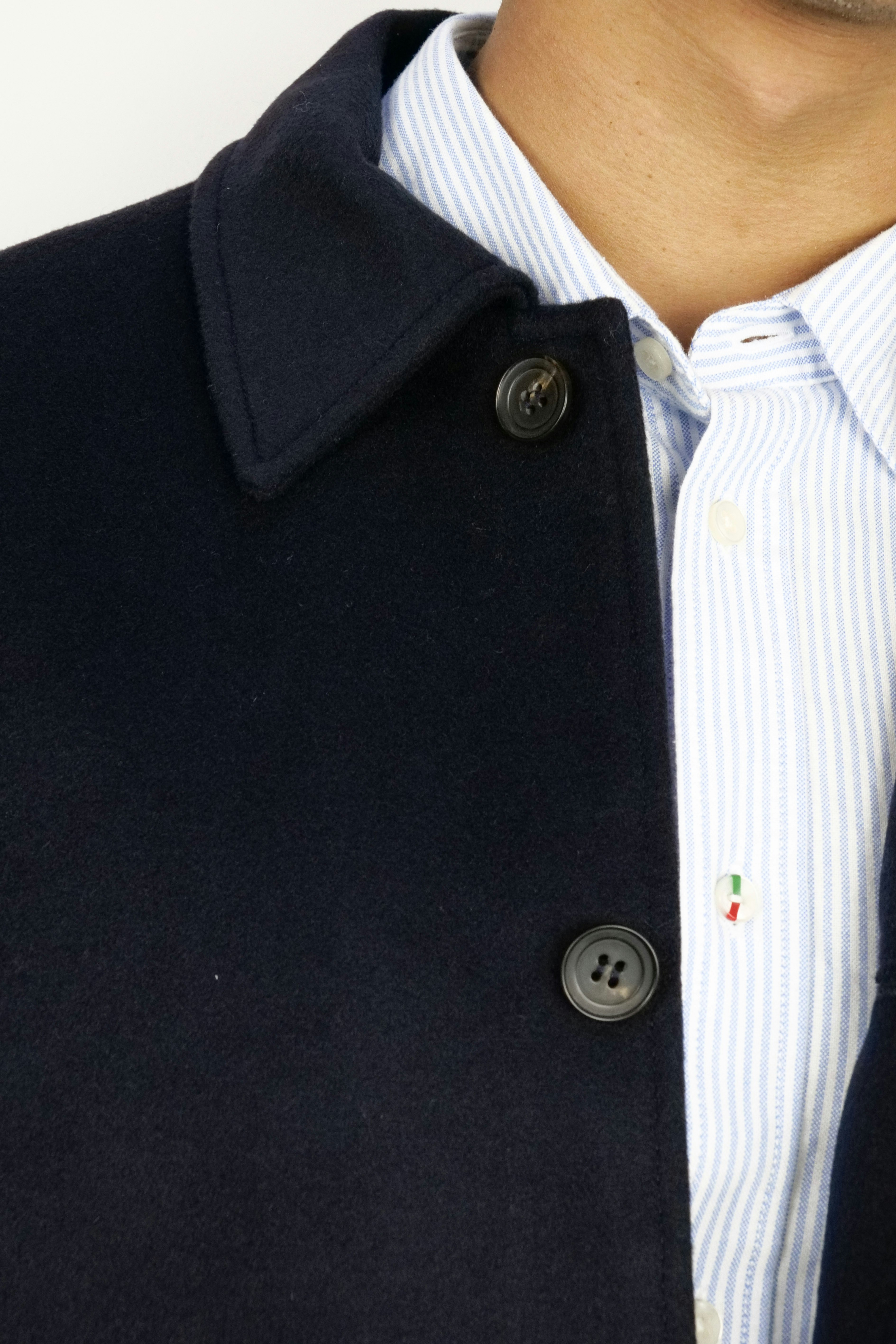 Inuti är jackan fodrad med ett blått silkestyg som inte bara ökar komforten, utan även ger en subtil kontrast och en känsla av lyx varje gång jackan bärs eller tas av. Axlarna är noggrant konstruerade med precision i insättningen, vilket ger en perfekt passform och förstärker den eleganta silhuetten.