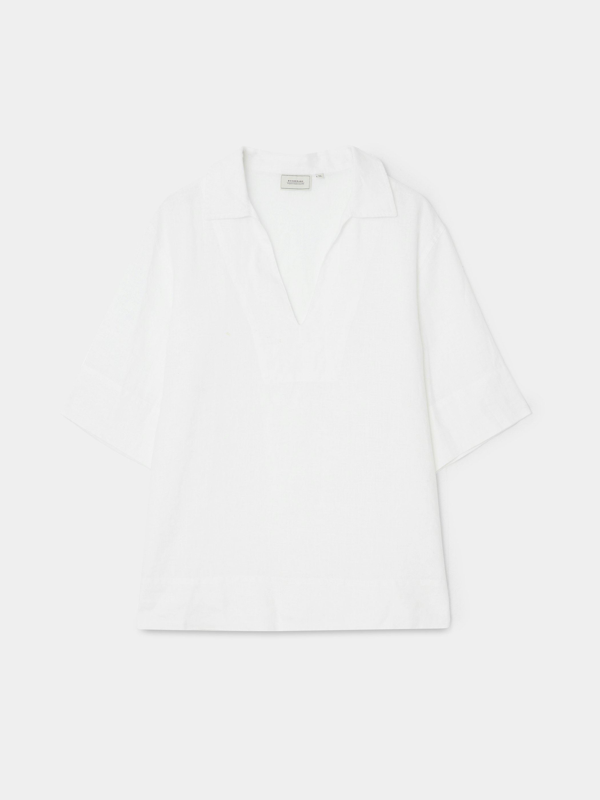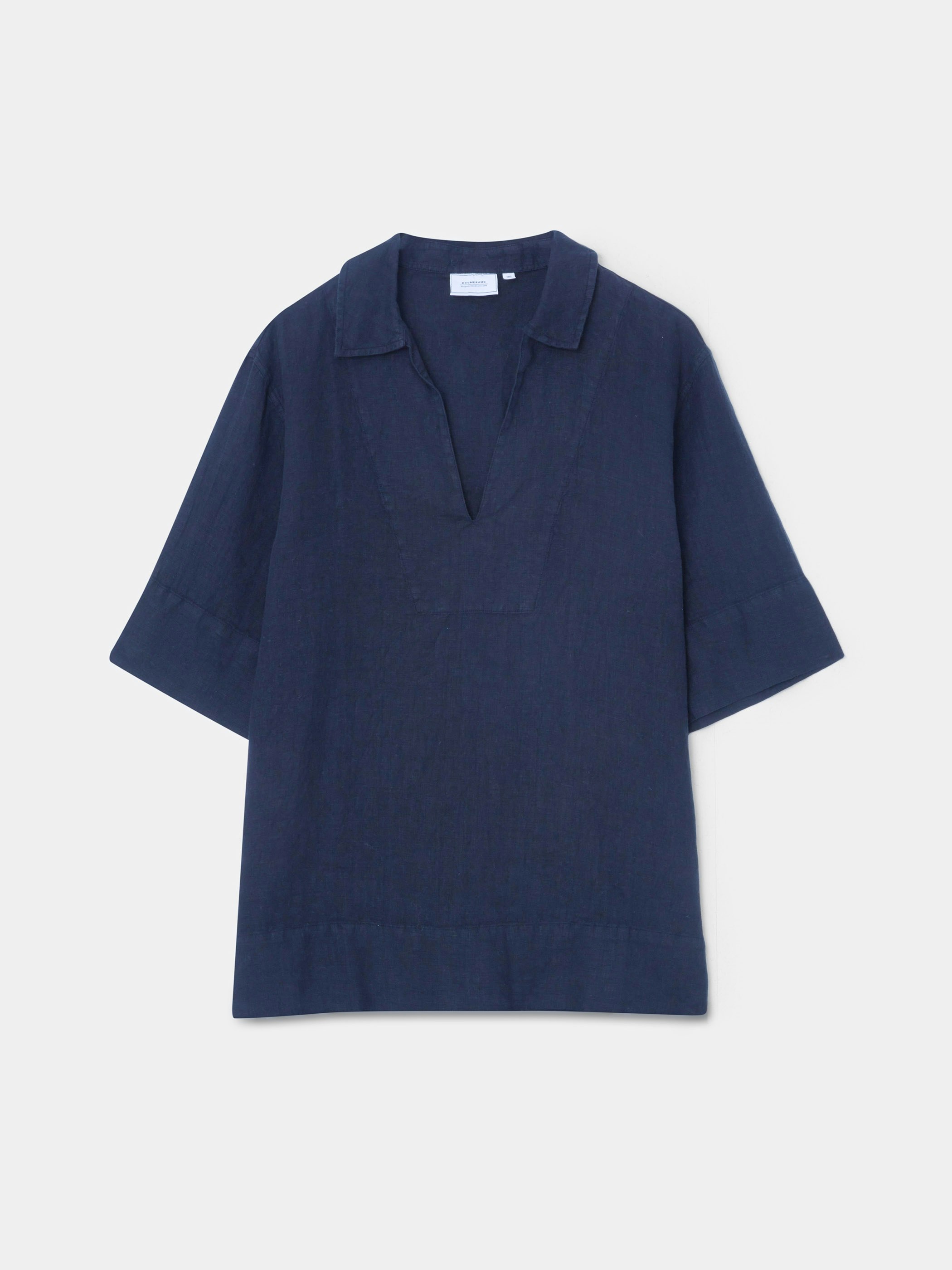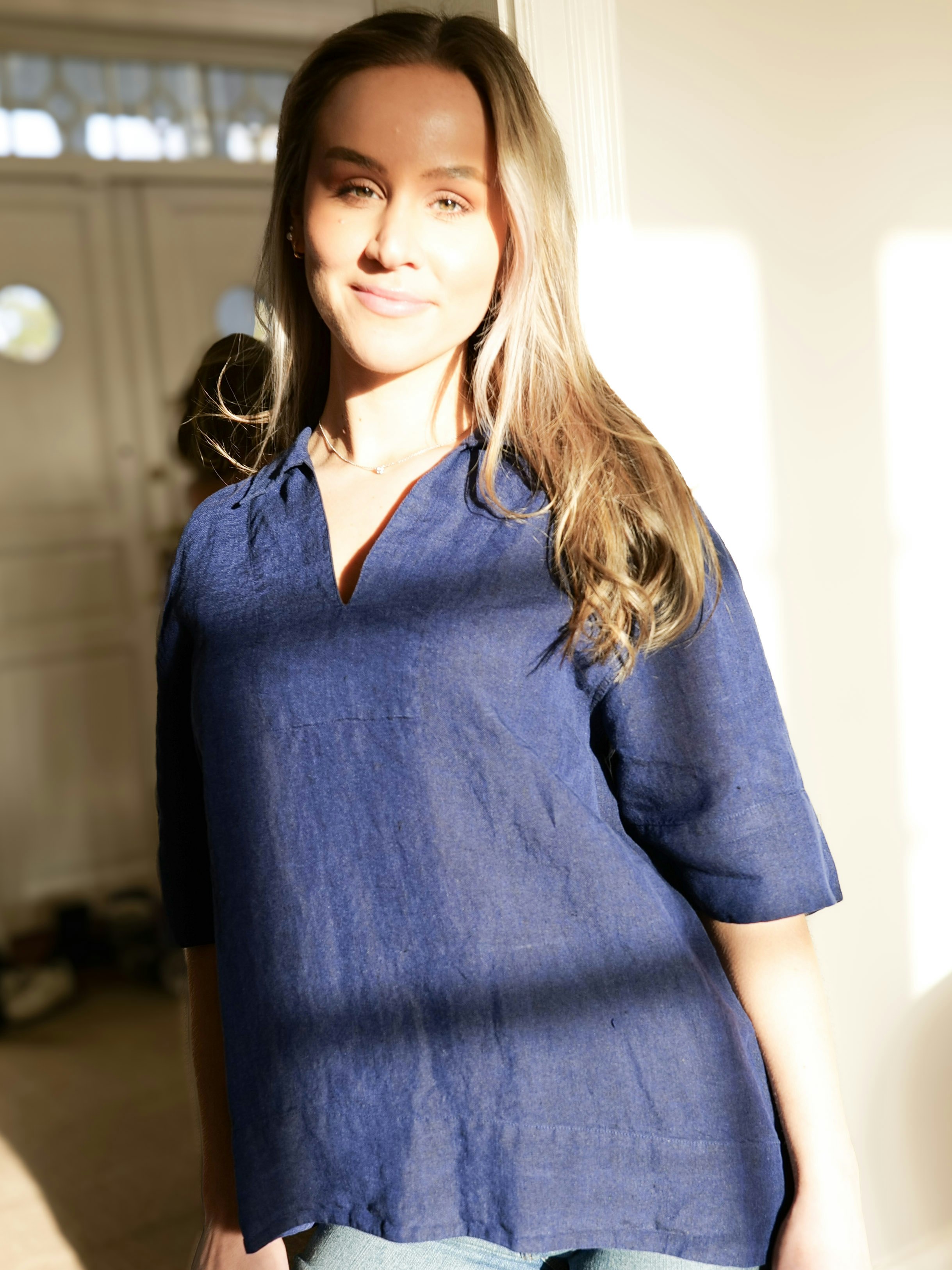 Blusen Ramsö är tillverkad av 100% förtvättad linne så att känslan ska vara mjuk från start. Halsen är fint V-ringad och har kragslag. Ärmarna är korta men ganska rymliga vilket skapar en härlig siluett. Bär linneplaggen som ett set tillsammans med våra linnebyxor eller linneshorts.