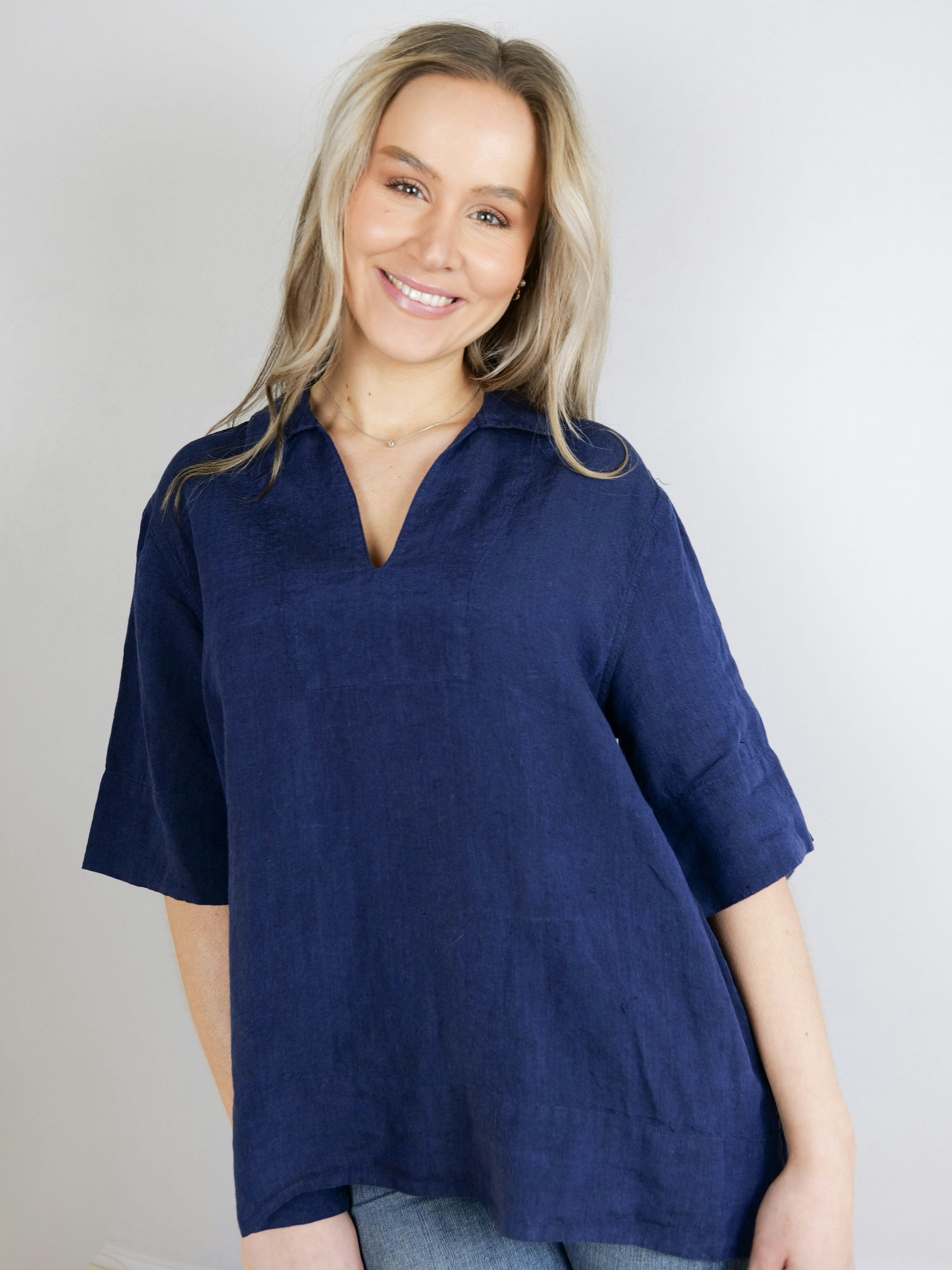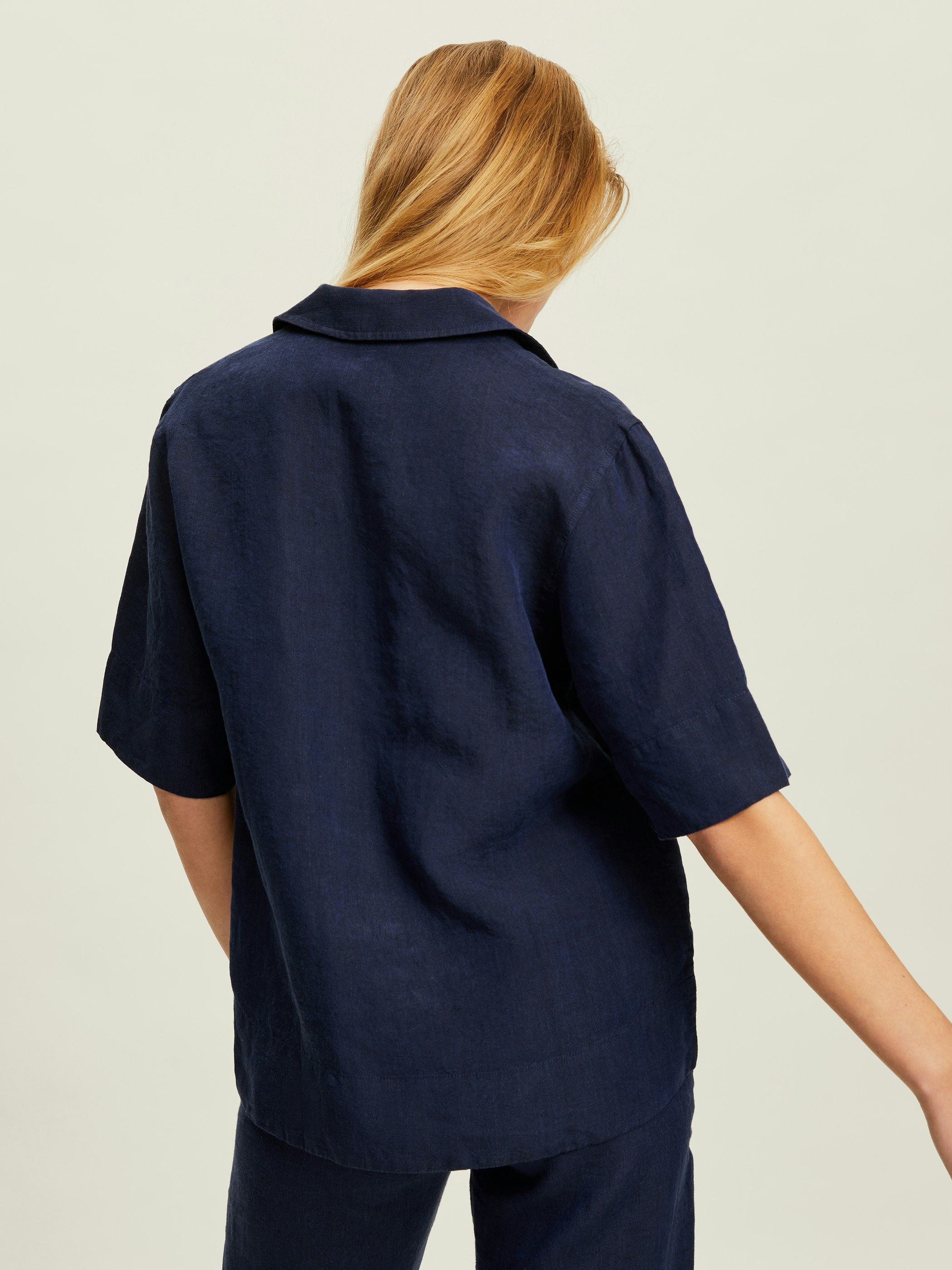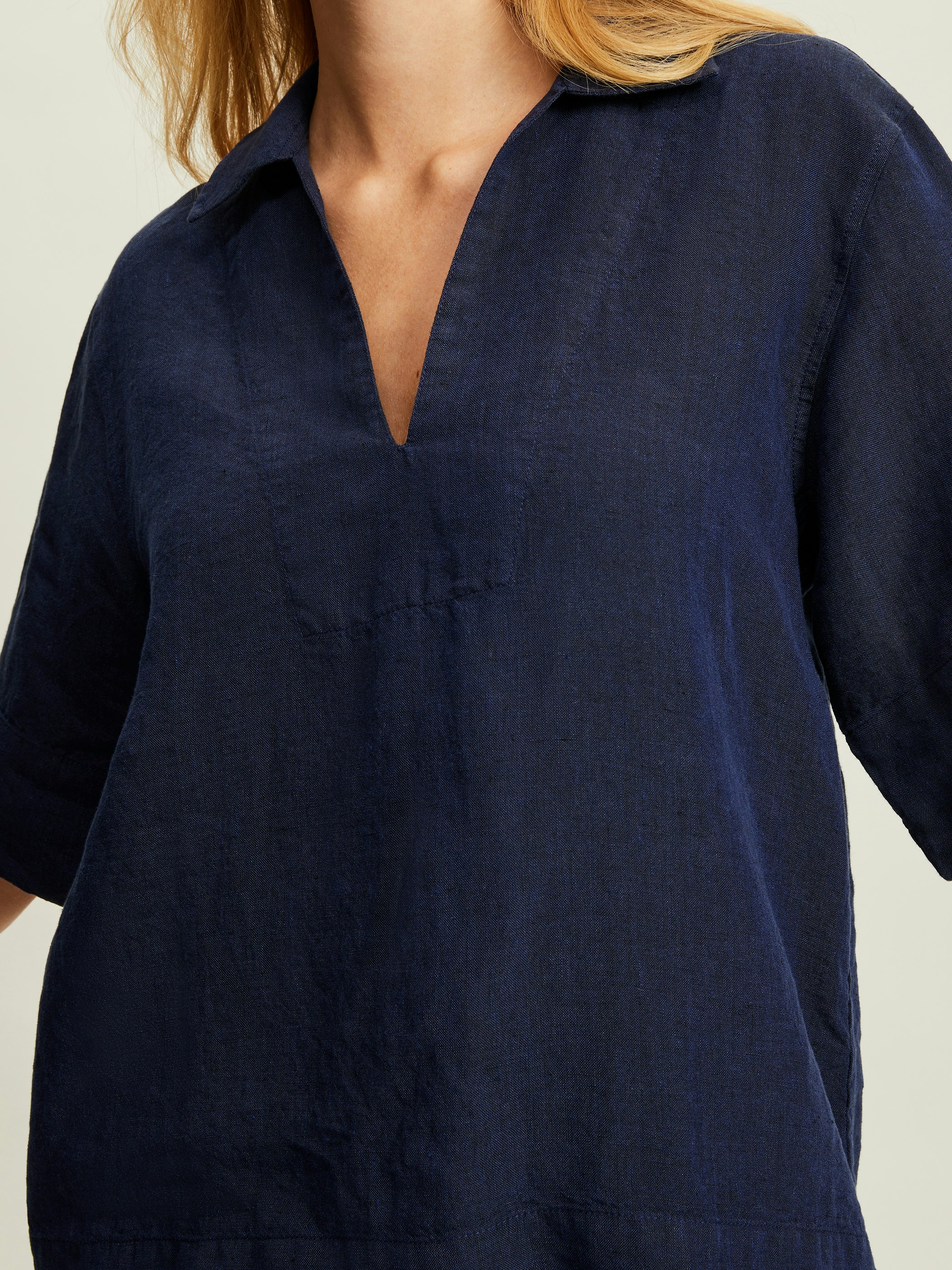 Blusen Ramsö är tillverkad av 100% förtvättad linne så att känslan ska vara mjuk från start. Halsen är fint V-ringad och har kragslag. Ärmarna är korta men ganska rymliga vilket skapar en härlig siluett. Bär linneplaggen som ett set tillsammans med våra linnebyxor eller linneshorts.