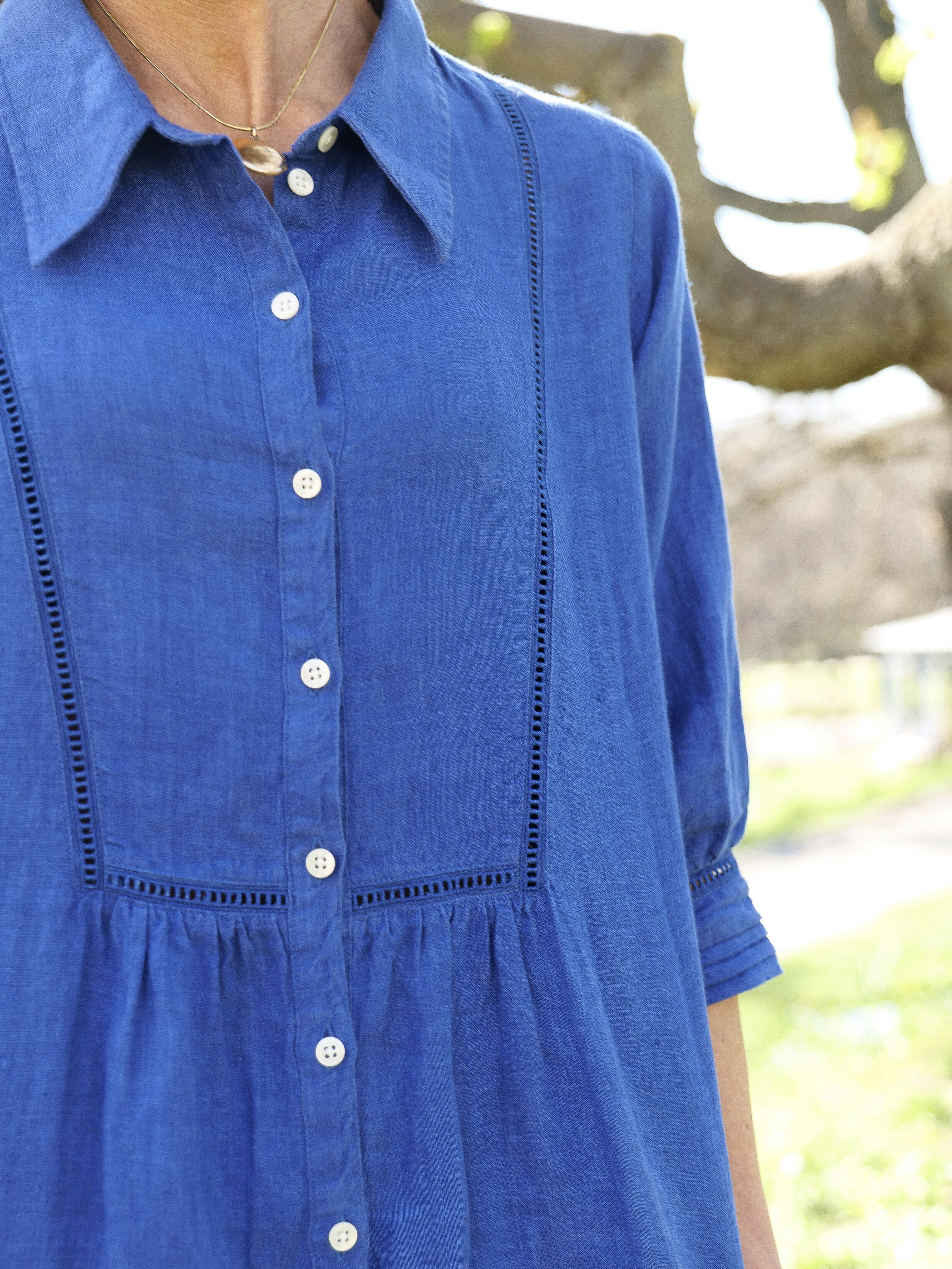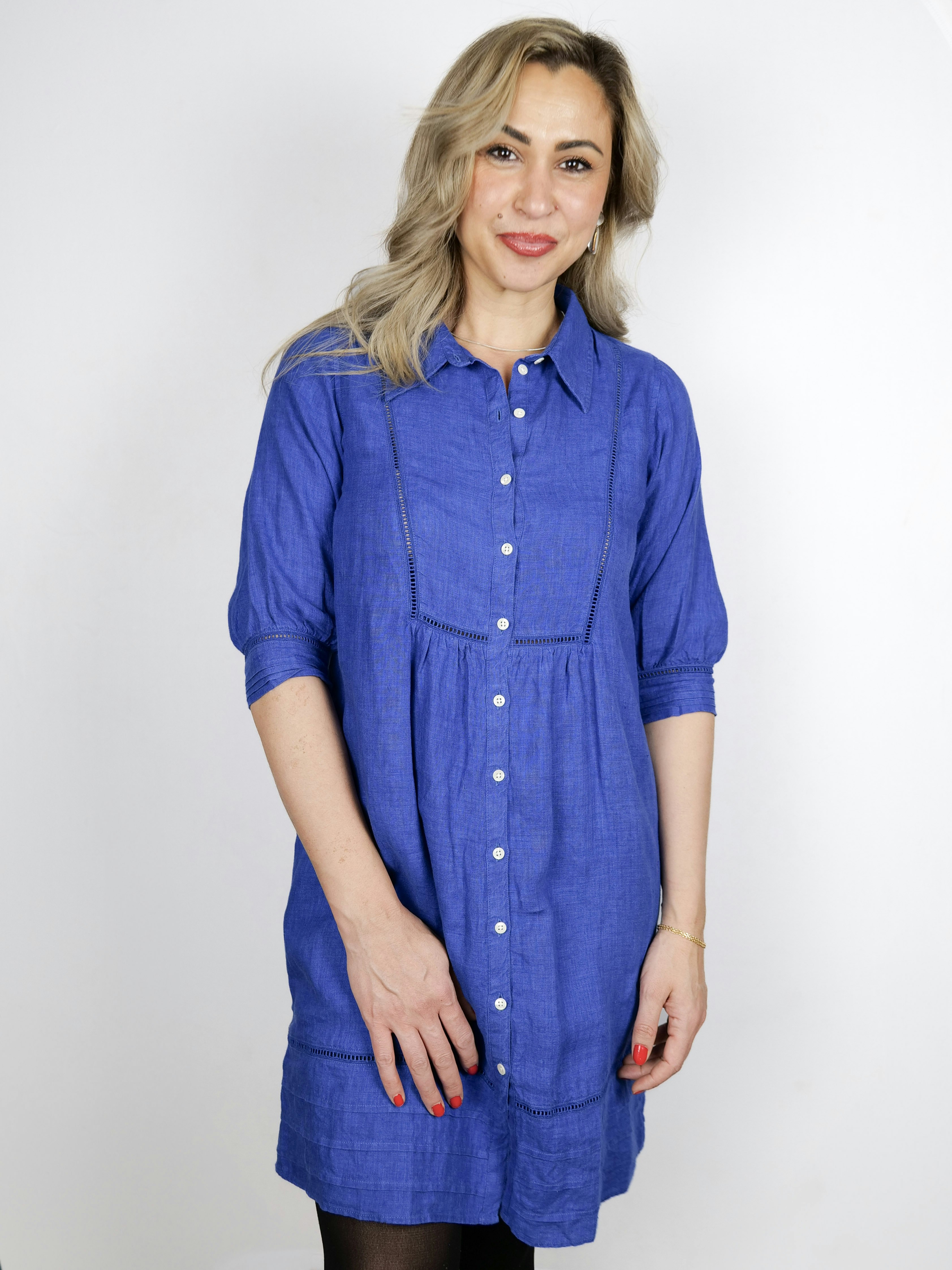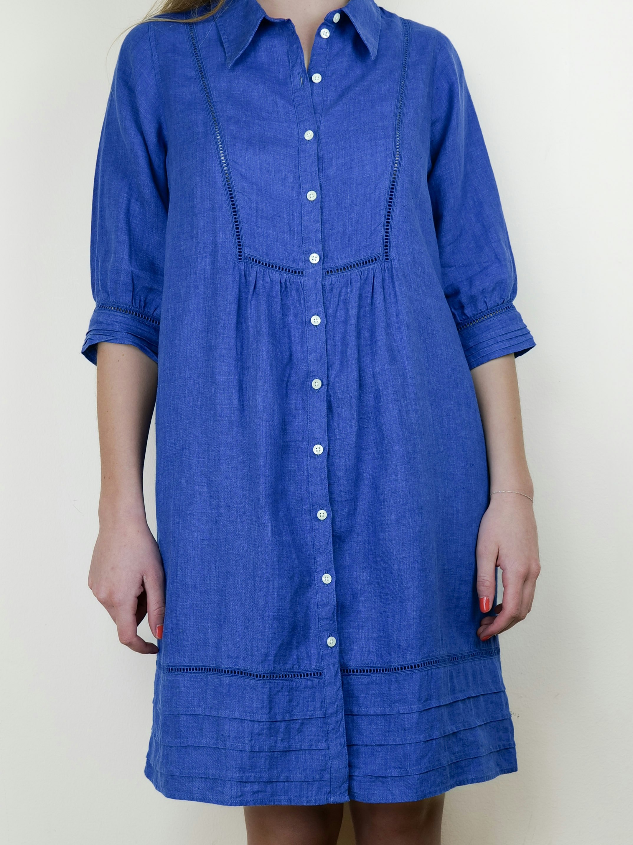Ärmen knäpps strax ovanför armbågen och har en puffig form. Infällda hålsömsband längst manschett, ok fram och botten fåll. Lagda veck på manschett och fåll ger en fin detalj. Klänningen har även fickor i sidan.