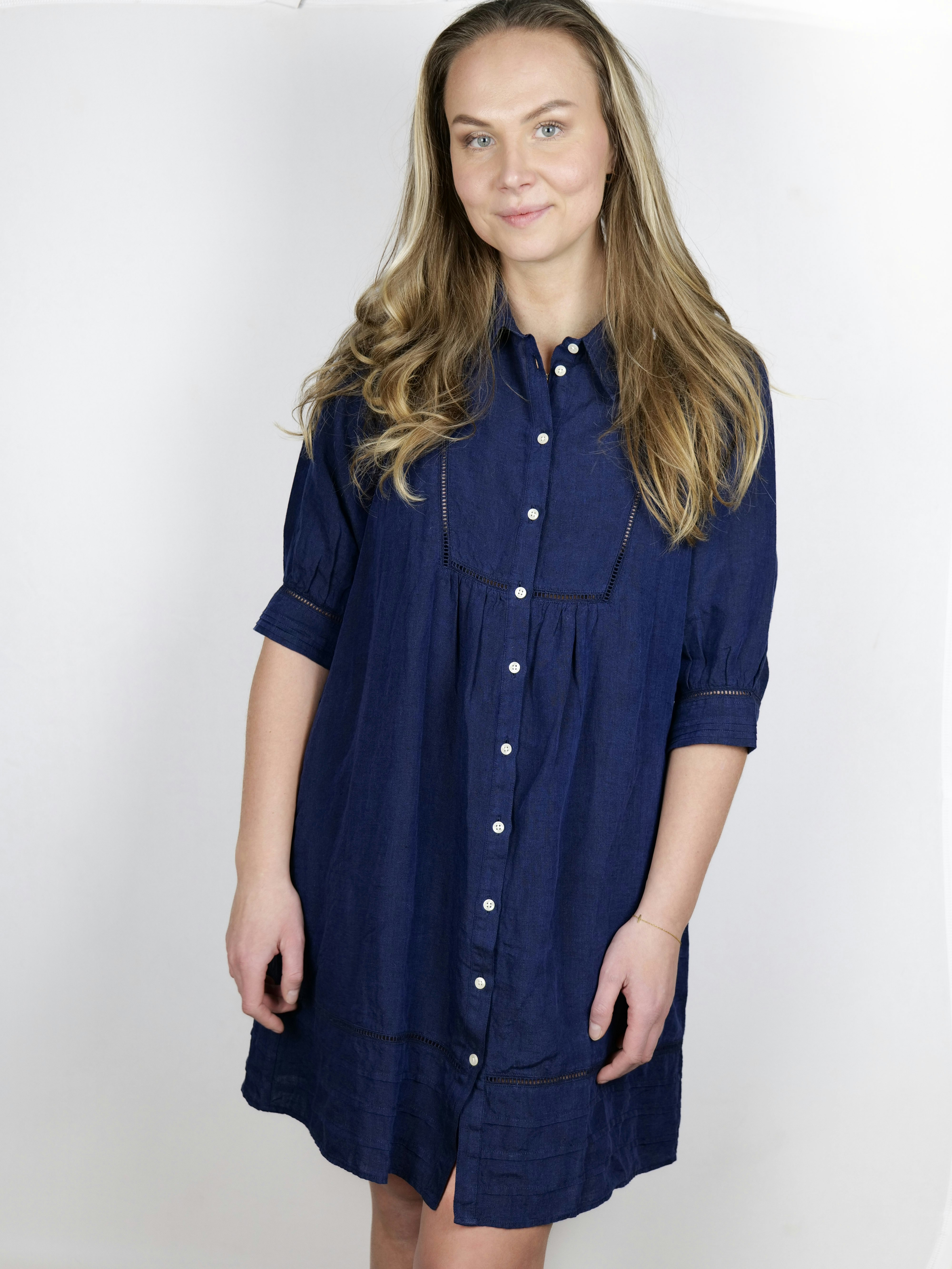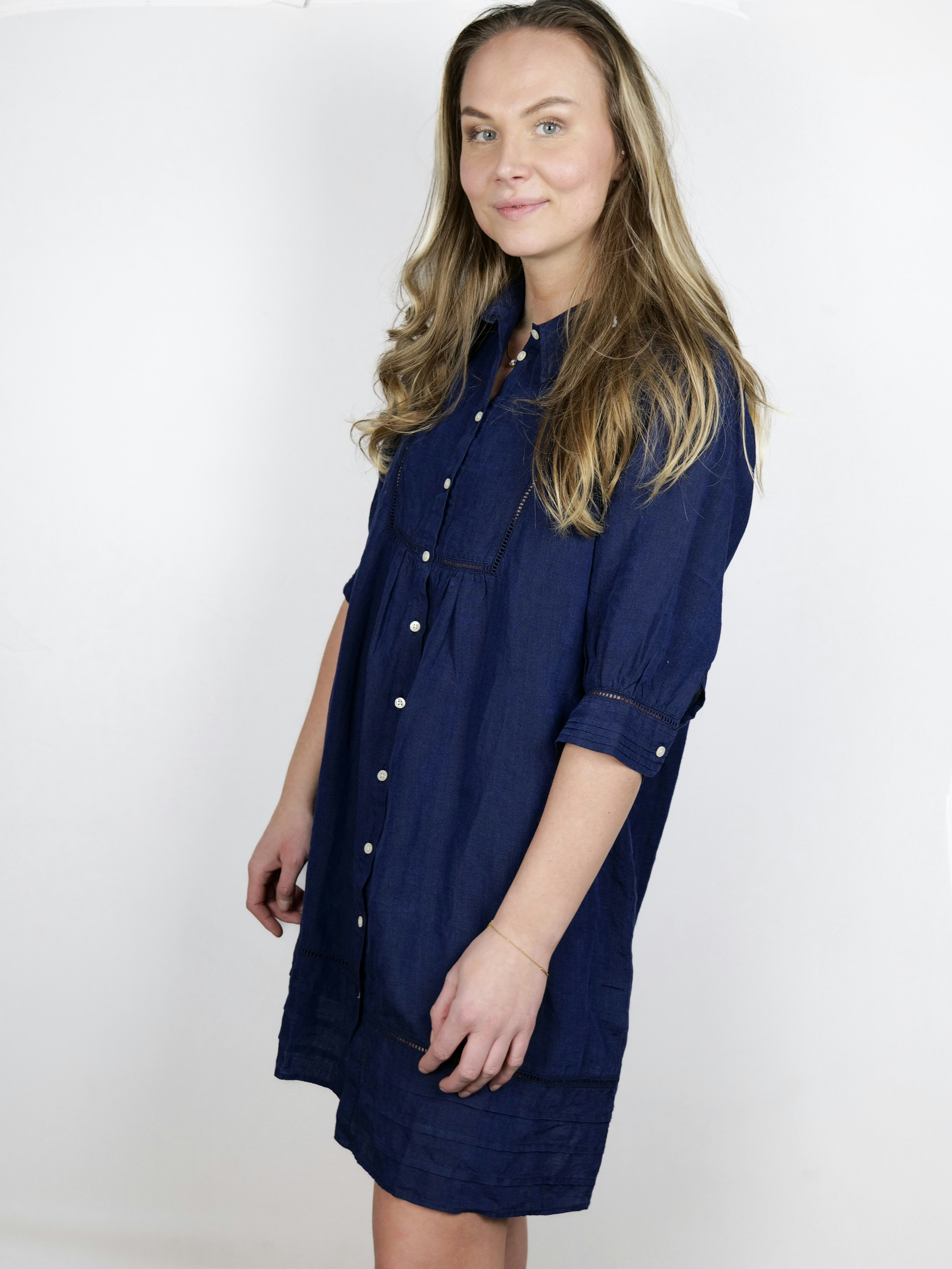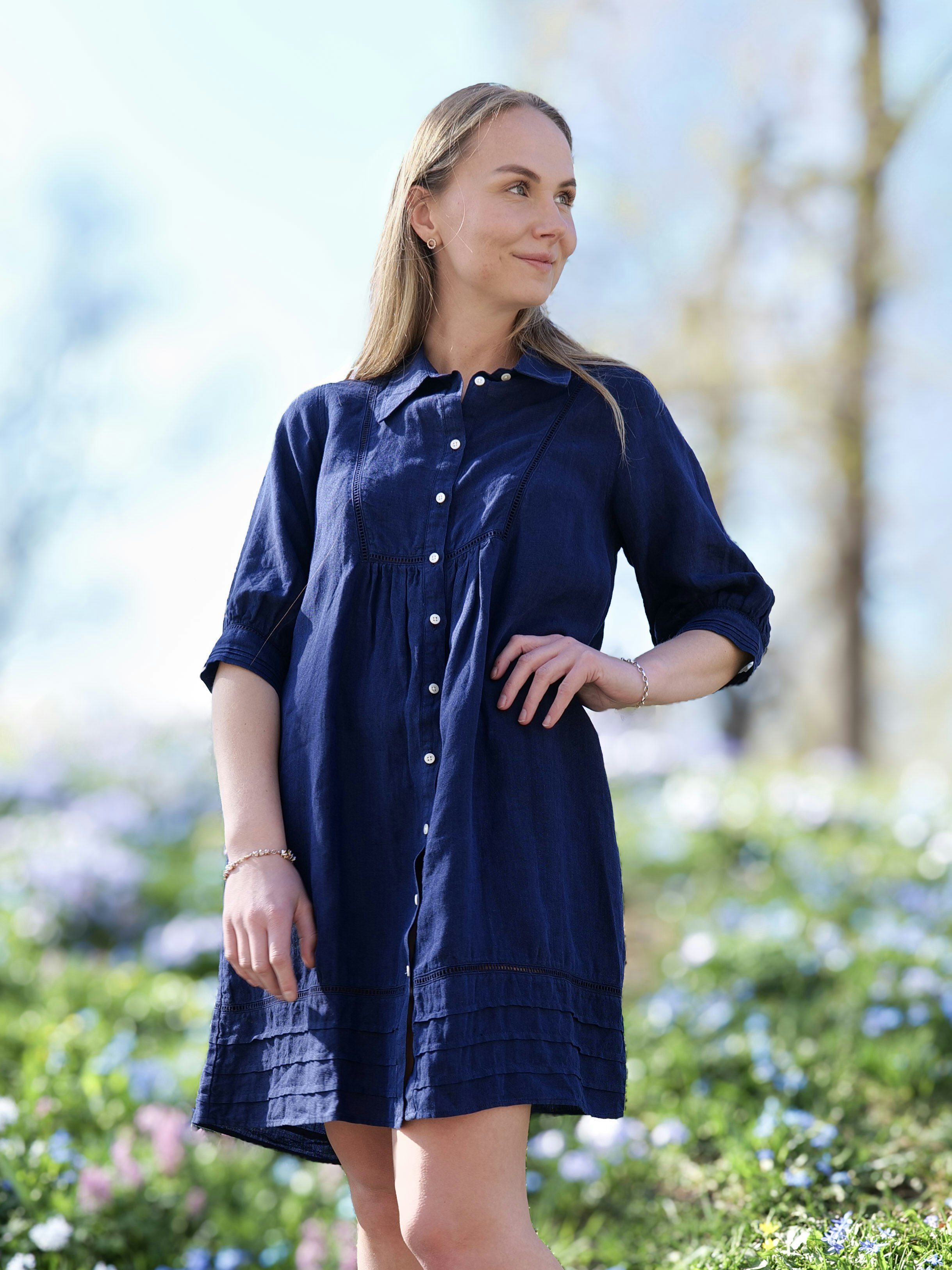 Klänningen är skapad i en avslappnad passform och i en förtvättad linnekvalitet som lovar en mjuk och skön känsla.