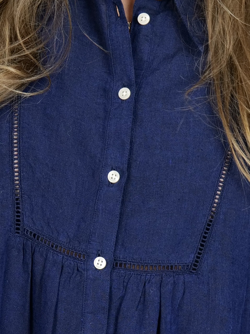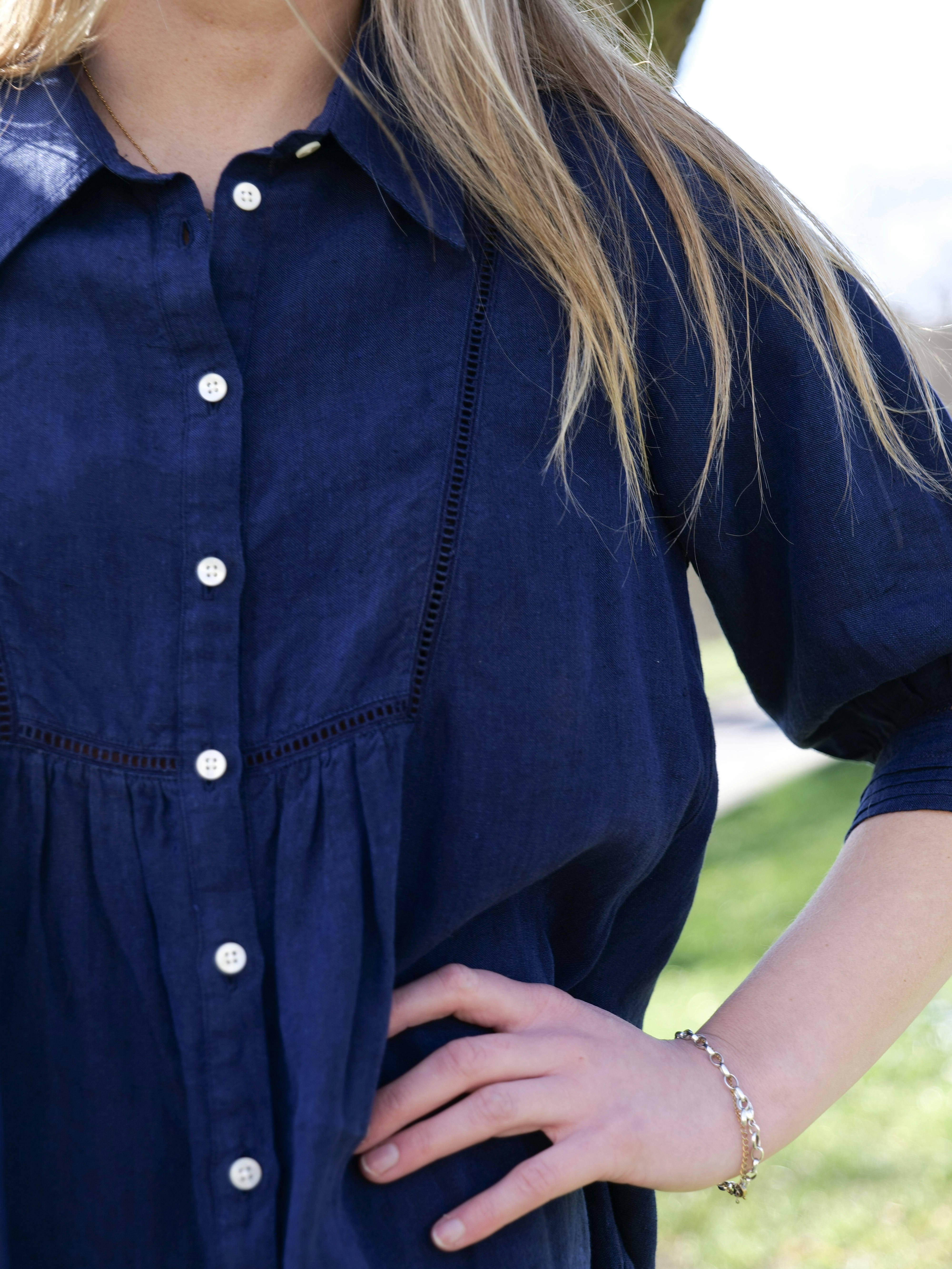 Ärmen knäpps strax ovanför armbågen och har en puffig form. Infällda hålsömsband längst manschett, ok fram och botten fåll. Lagda veck på manschett och fåll ger en fin detalj. Klänningen har även fickor i sidan.
