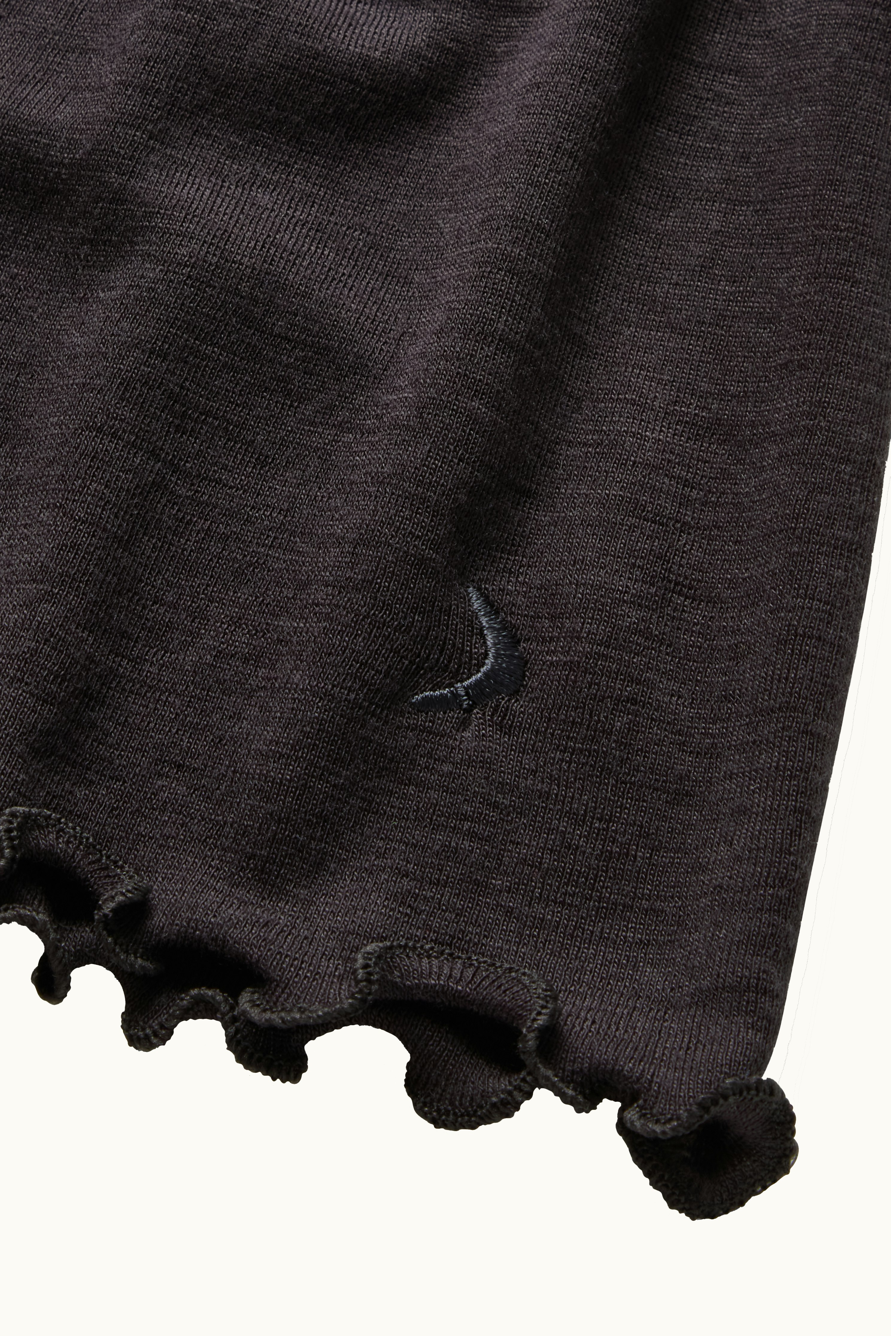 Hals, ärmslut och tröjslut har en frillad kant, vilket tillför en romantisk och sofistikerad känsla till tröjan. En diskret, tonal logga pryder vänster sida, som en subtil men elegant detalj.