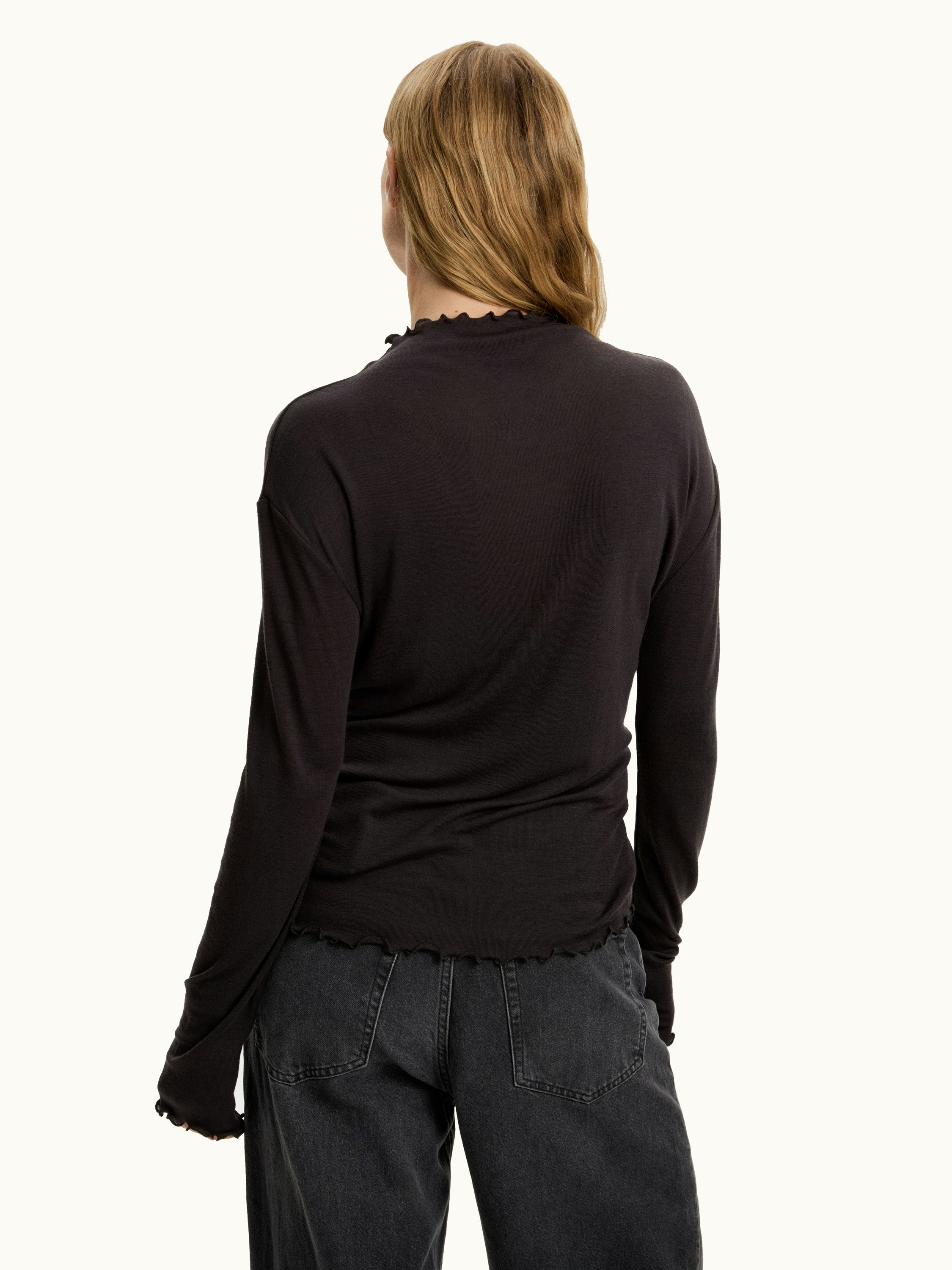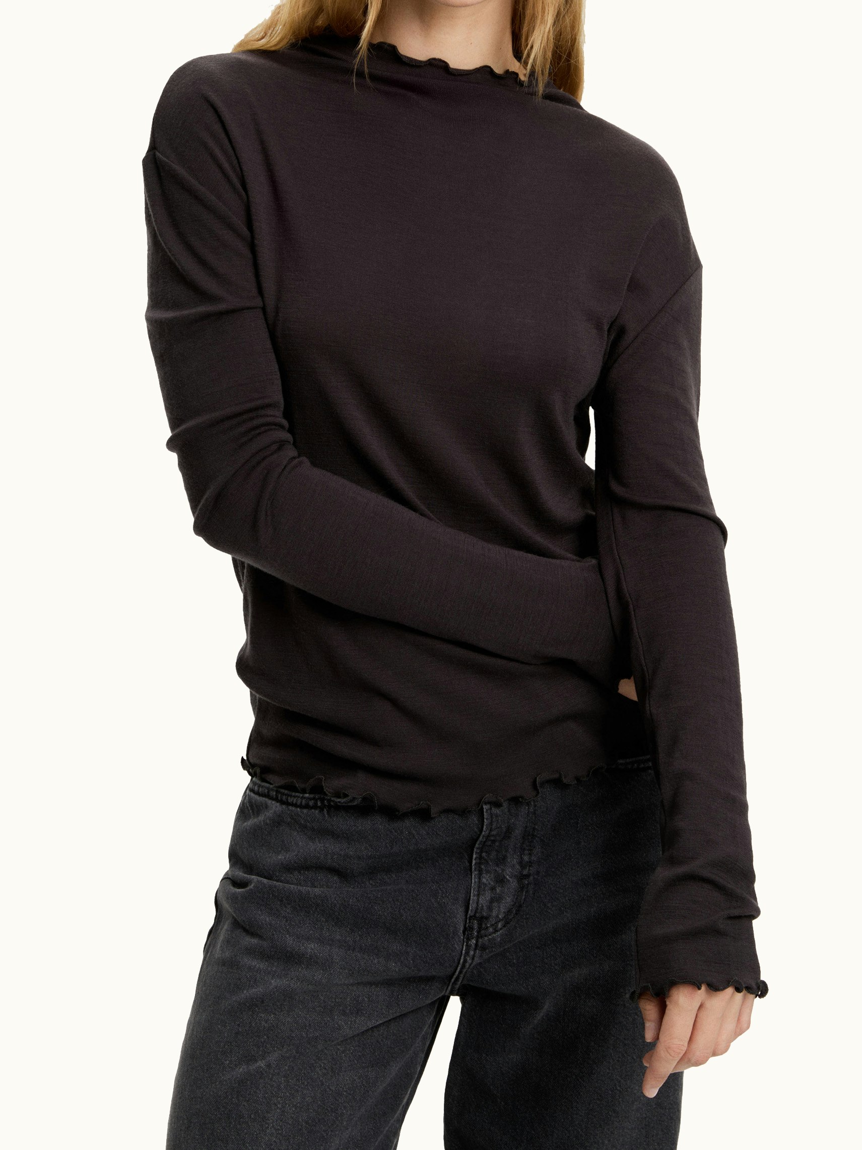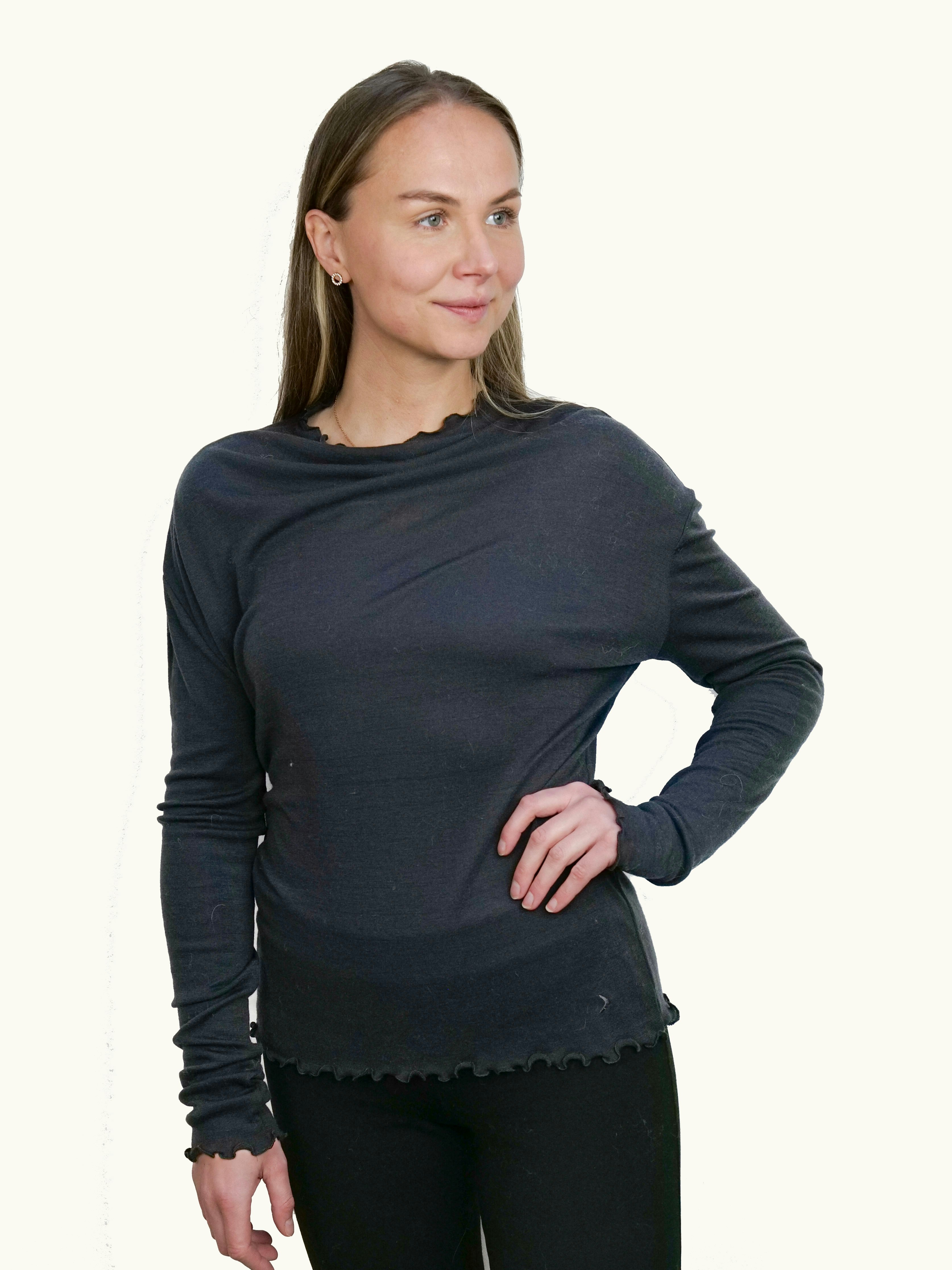 Skenholmen är lika mångsidig som den är vacker – bär den som den är för en enkel, stilren look, eller låt den frillade kanten sticka fram effektfullt under en skjorta eller tröja. Den mjuka merinoullen gör tröjan till ett perfekt lager för kyligare dagar, samtidigt som den är skön och luftig mot huden.