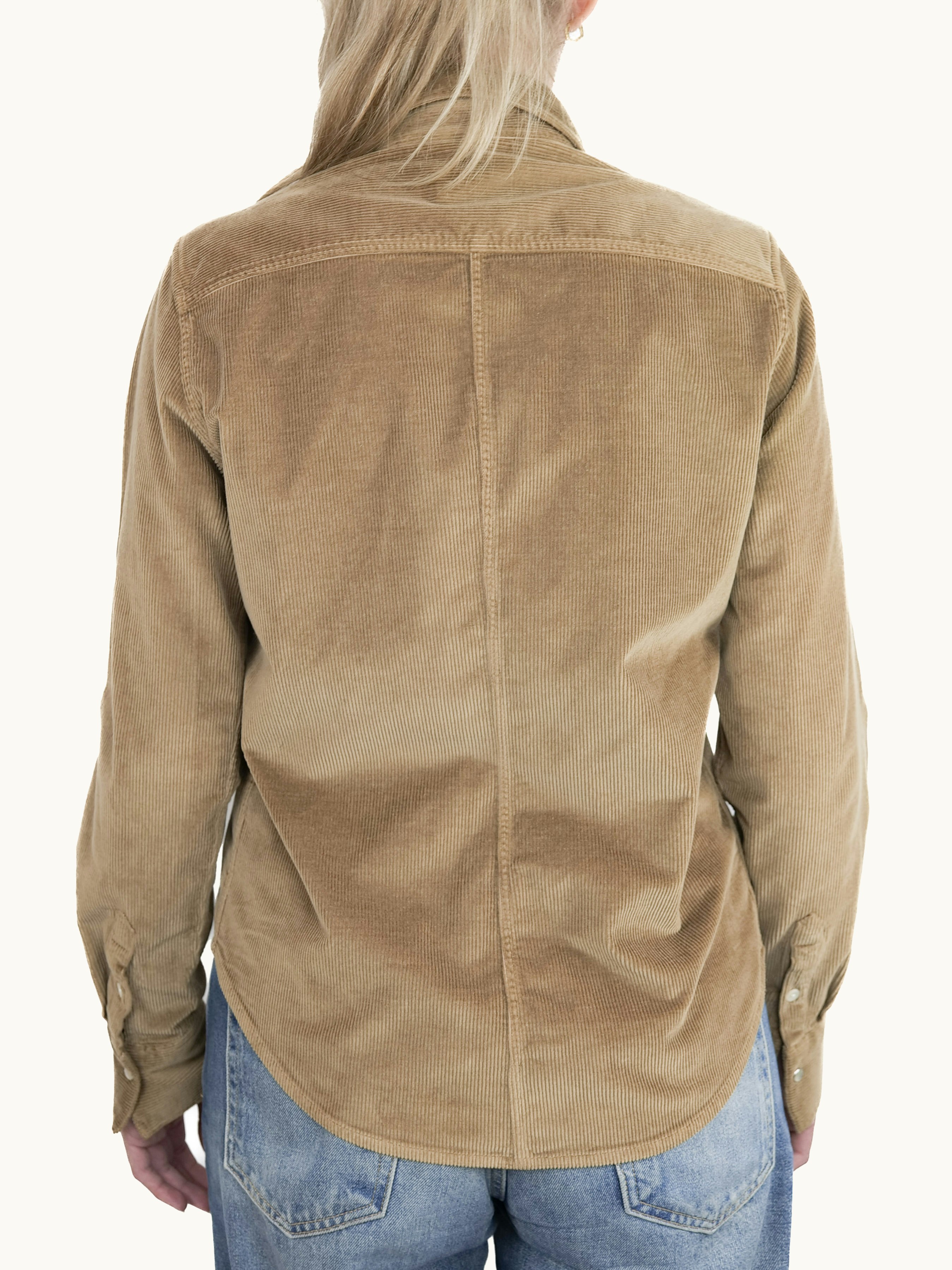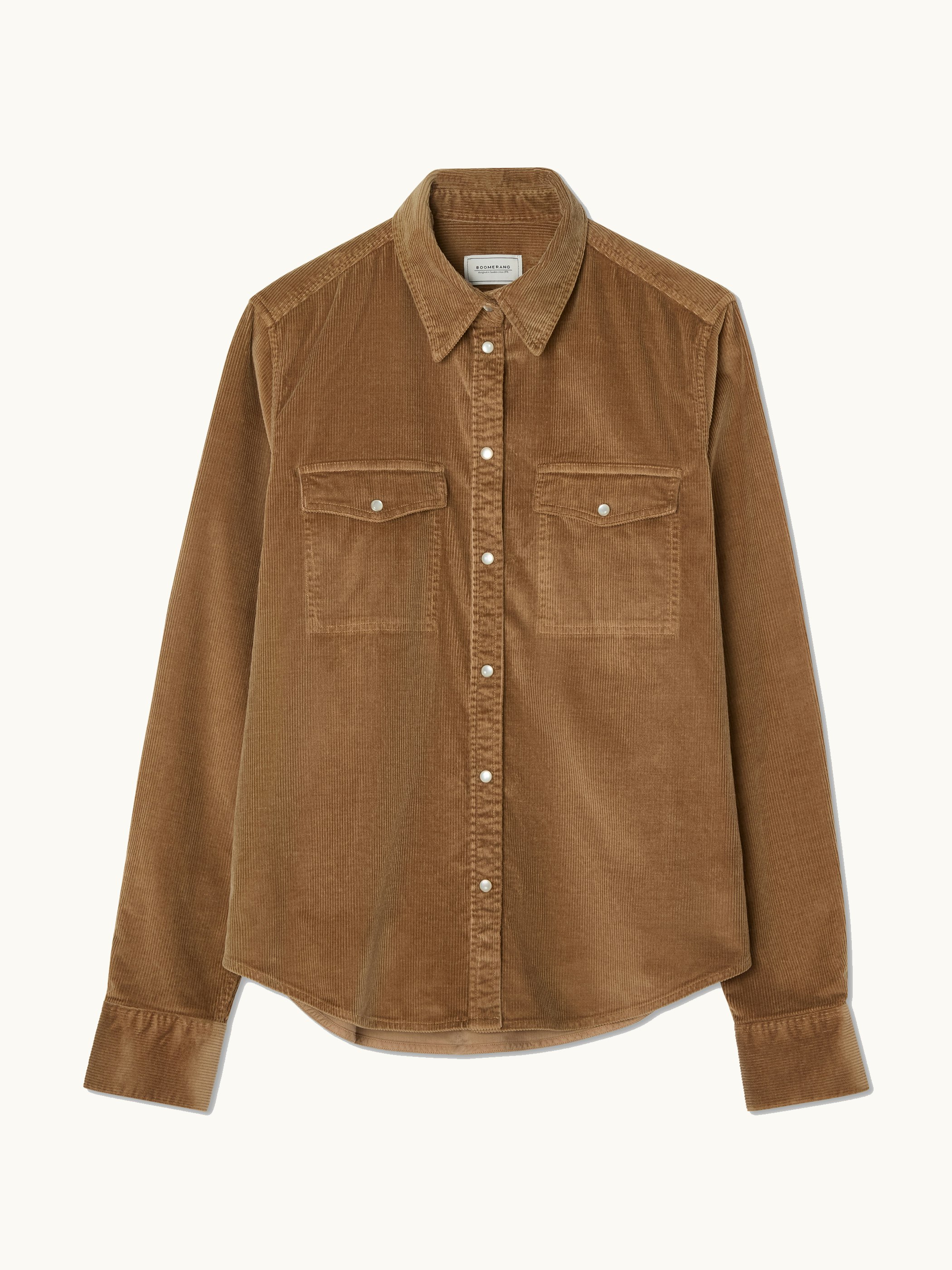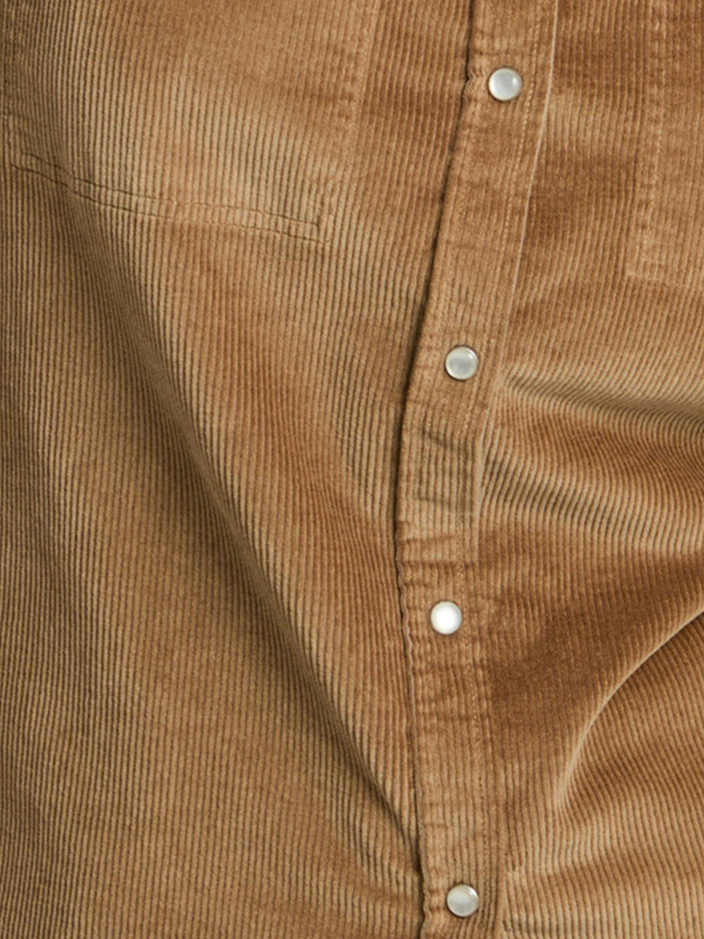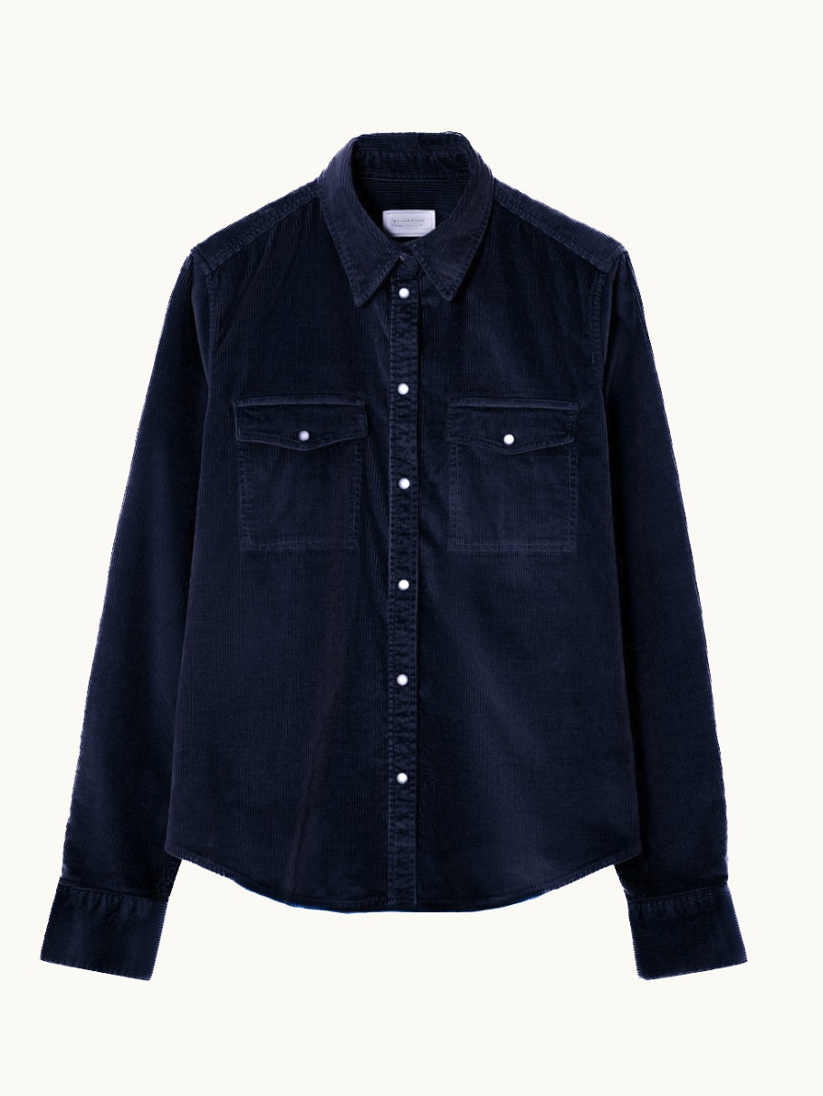 Den klassiska kragen och manschetterna med knäppning förstärker den tidlösa känslan, medan skjortans stängning med tryckknappar i pärlemor gör den uppdaterad.