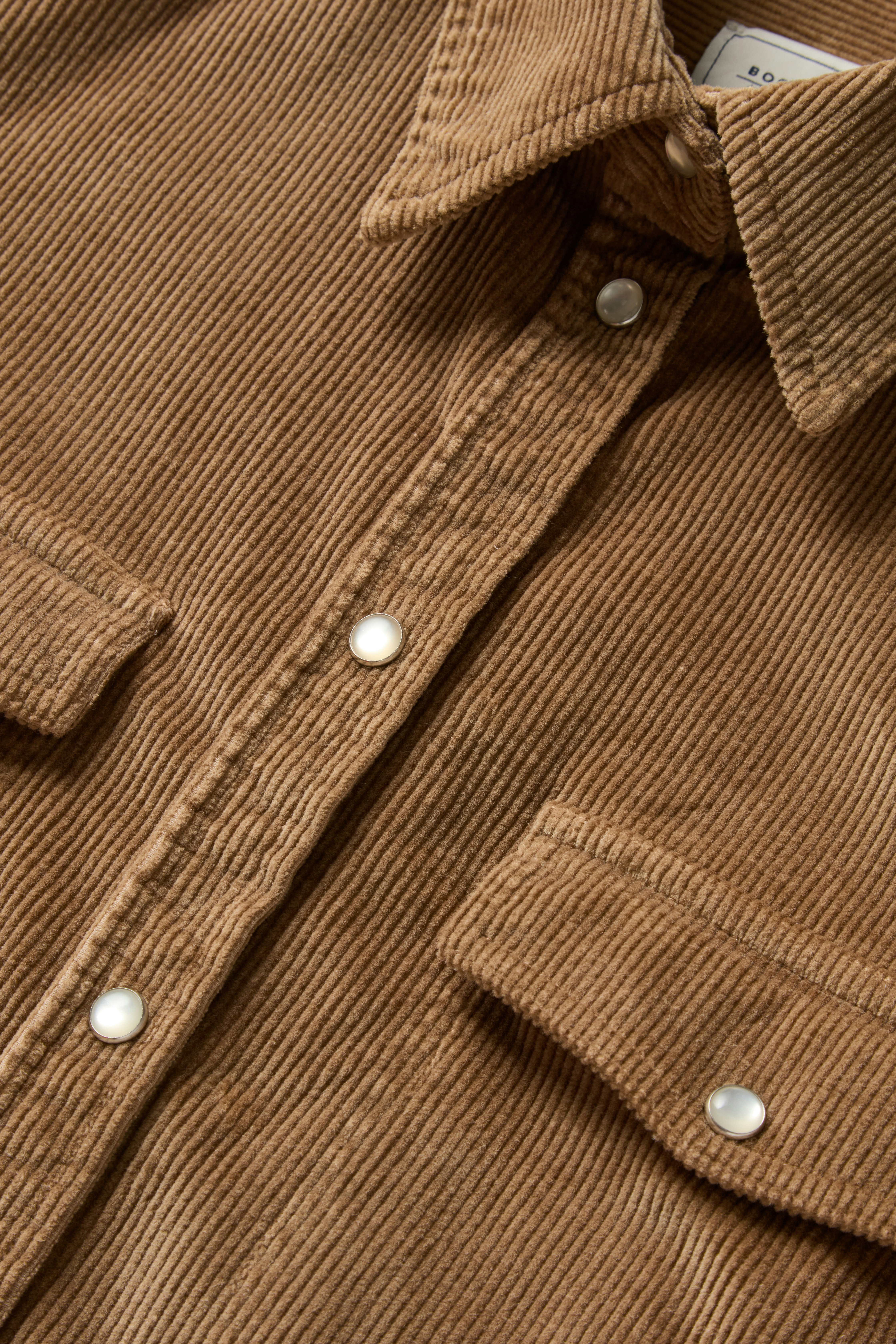 Två bröstfickor som har ficklock och knäpps även dom med tryckknappar i pärlemor. Baksidan pryds av ett rakt ok och en söm som löper längs mitten av ryggen, vilket tillför en smal passform och en subtil men distinkt karaktär till skjortan.