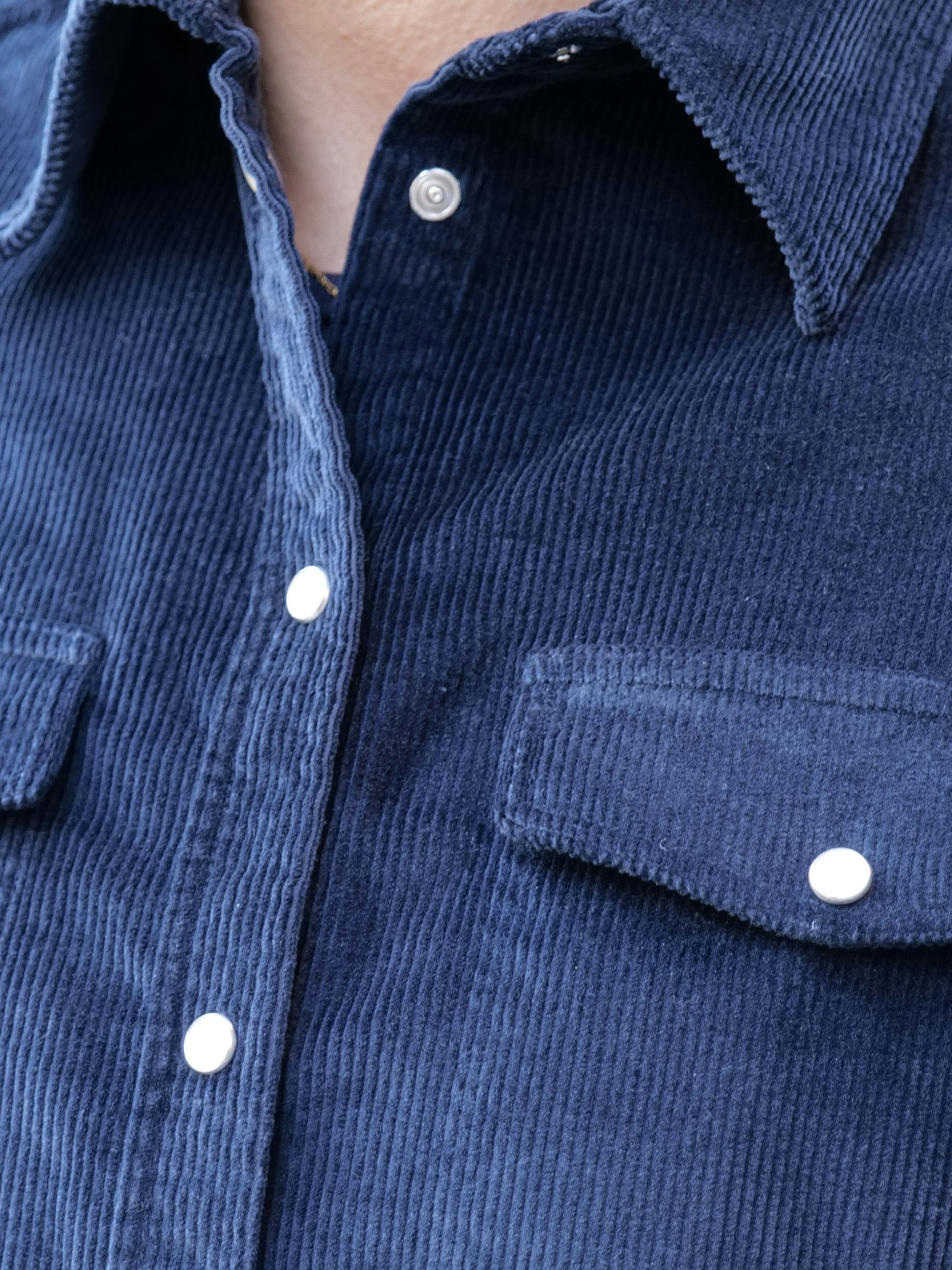 Den klassiska kragen och manschetterna med knäppning förstärker den tidlösa känslan, medan skjortans stängning med tryckknappar i pärlemor gör den uppdaterad.