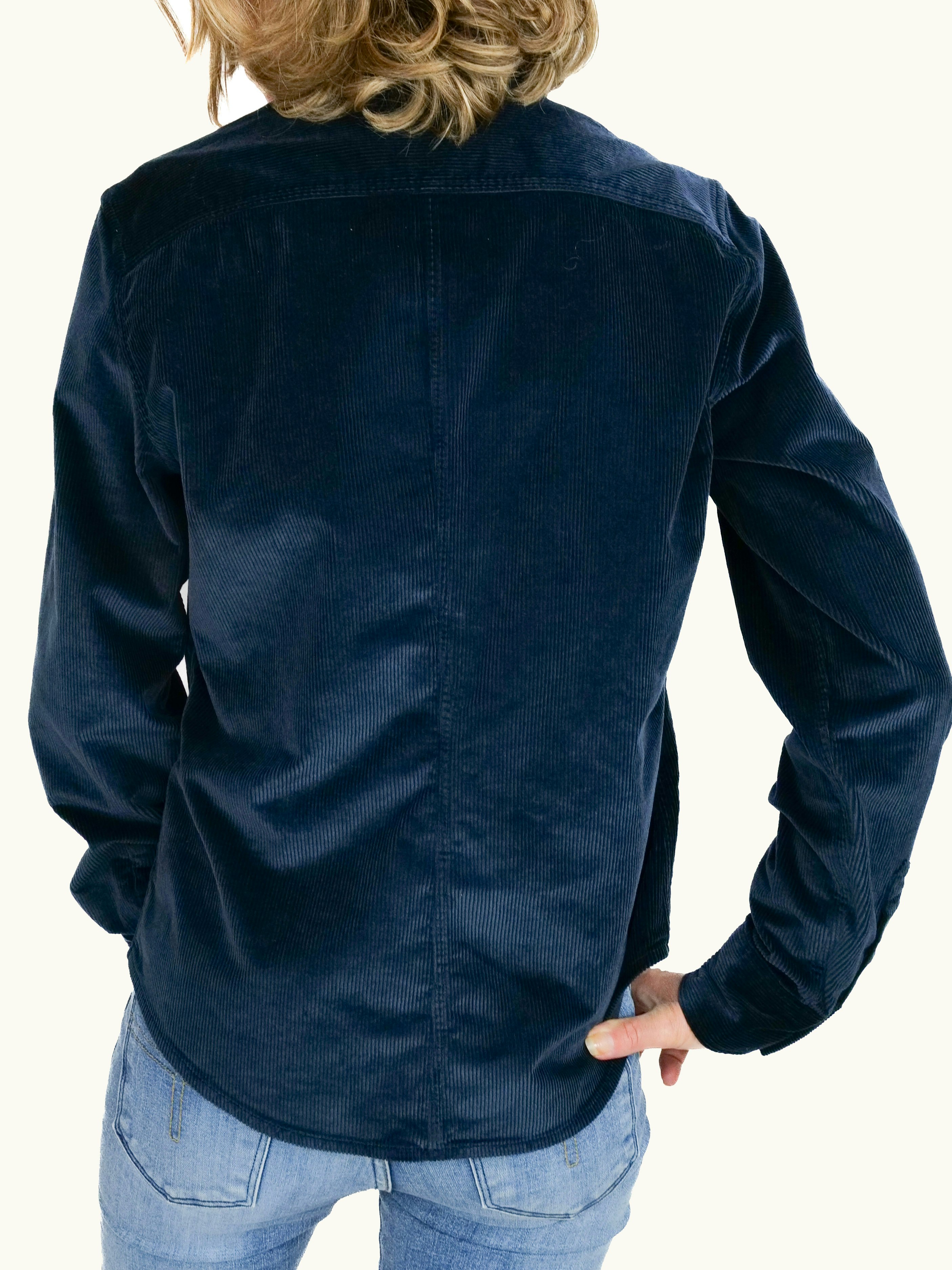 Två bröstfickor som har ficklock och knäpps även dom med tryckknappar i pärlemor. Baksidan pryds av ett rakt ok och en söm som löper längs mitten av ryggen, vilket tillför en smal passform och en subtil men distinkt karaktär till skjortan.