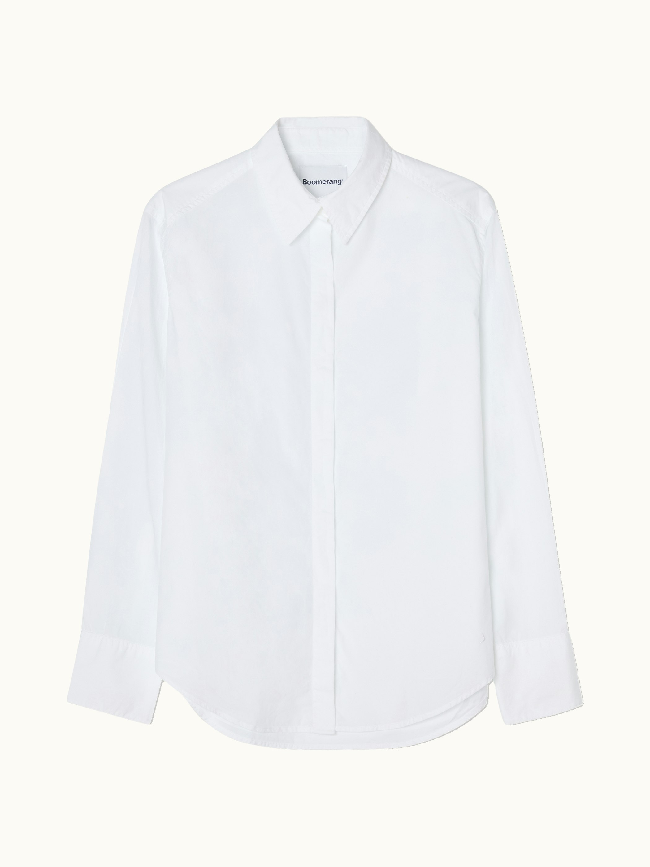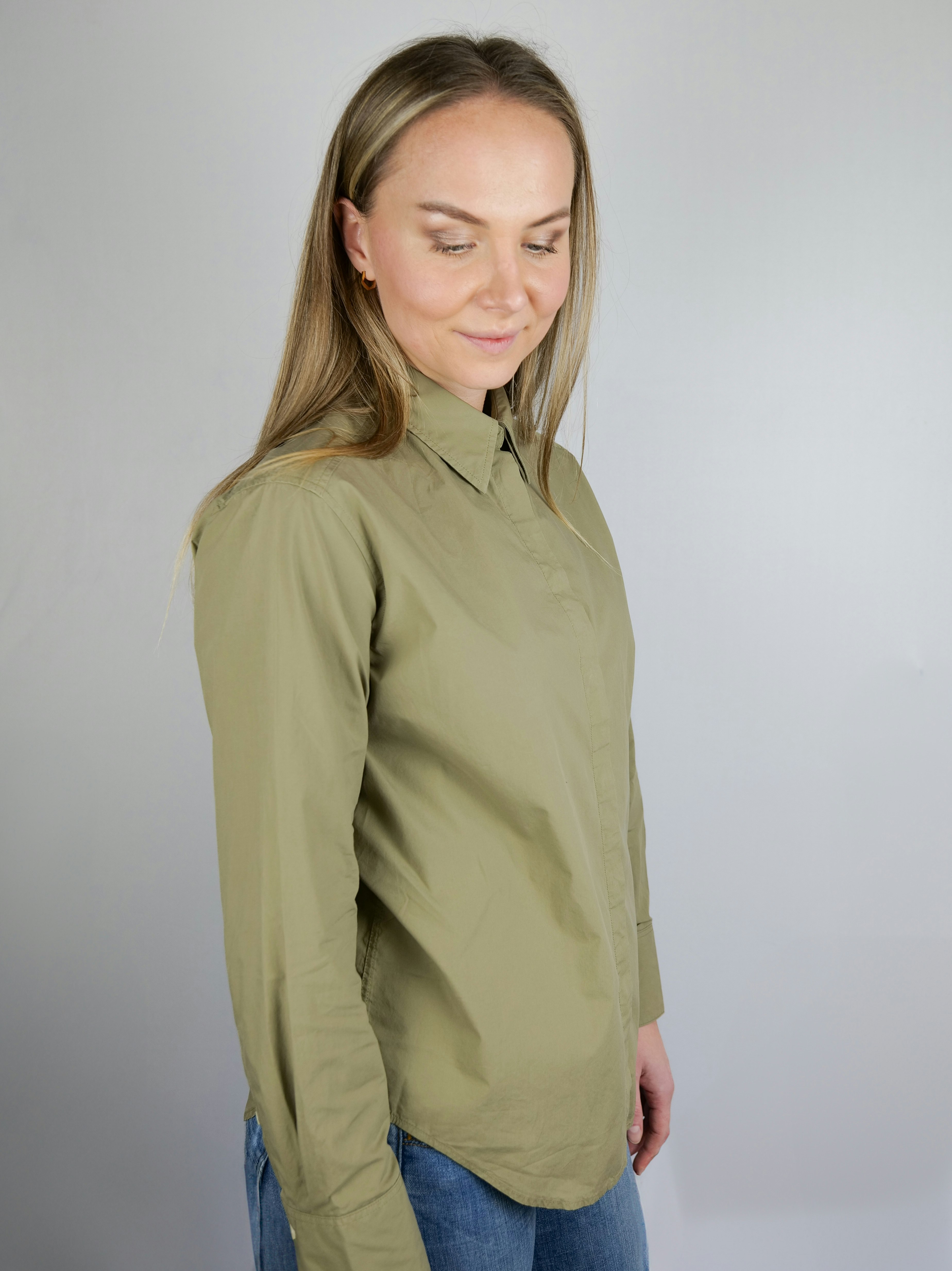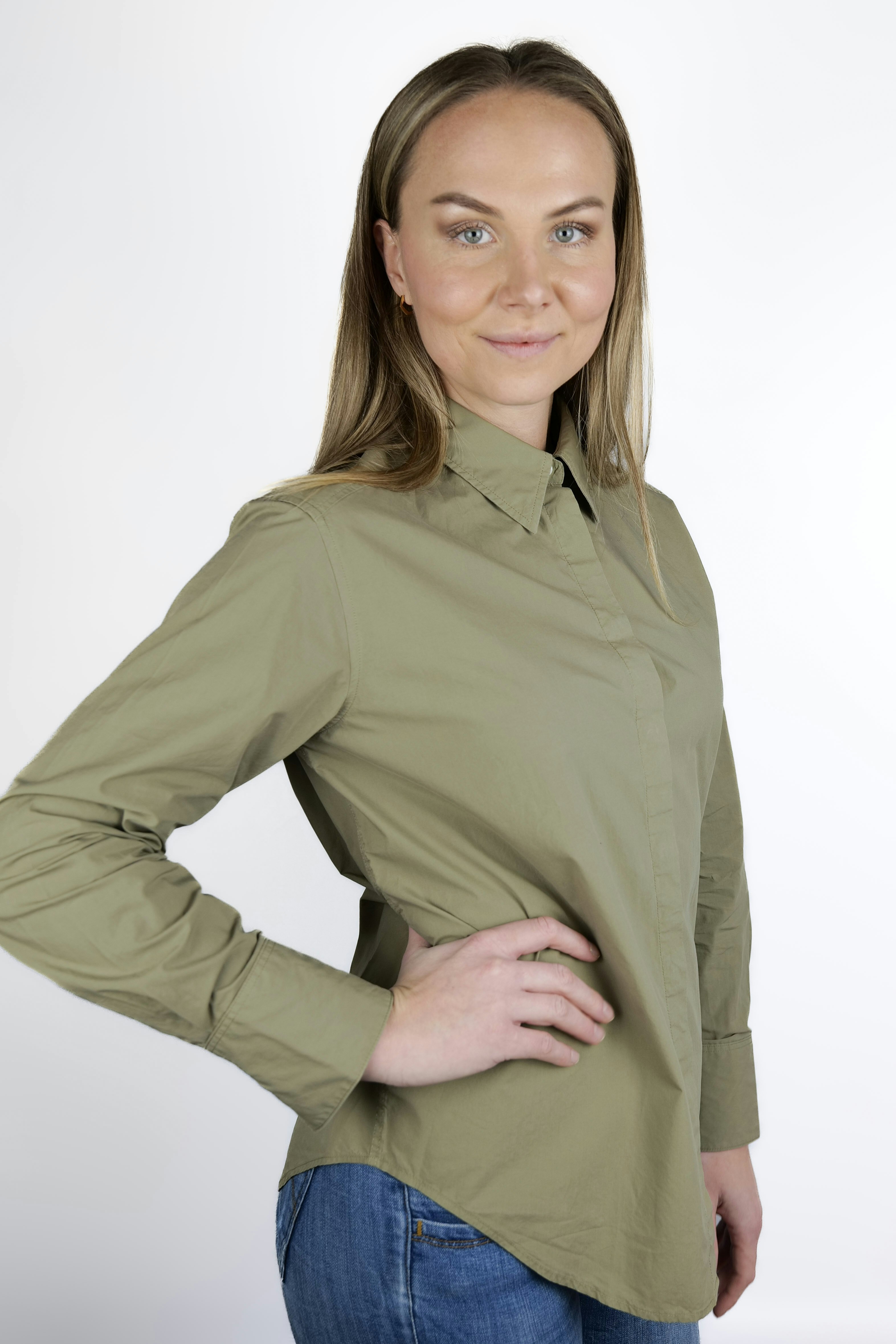 Skjortan har en dold knäppning som ger ett stilrent och minimalistiskt uttryck, perfekt för såväl vardag som mer formella tillfällen. Den rundade fållen bidrar till en elegant finish och gör skjortan lätt att bära både instoppad och löst hängande. Manschetten knäpps med en enkel knapp, vilket ger en diskret men genomtänkt detalj.