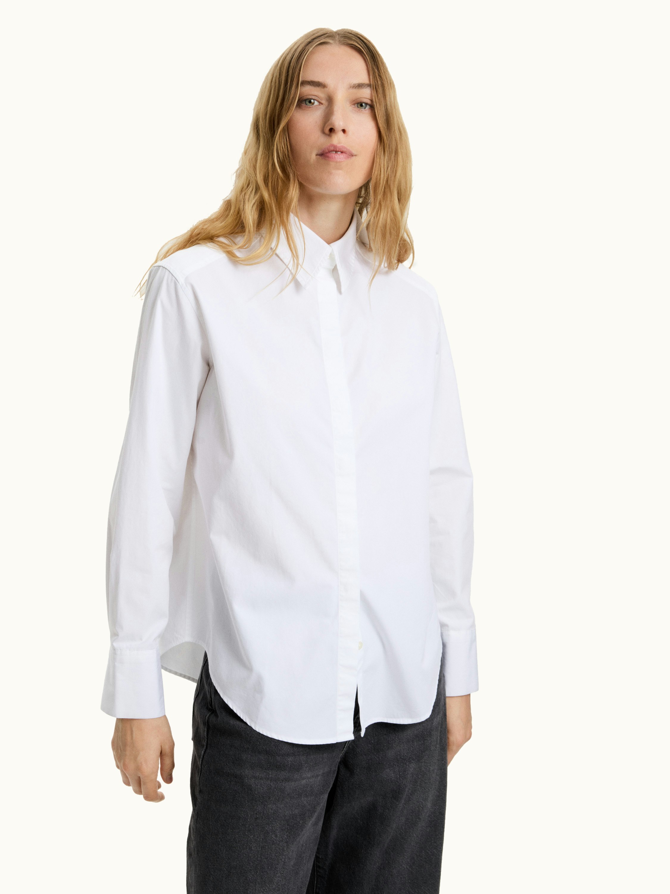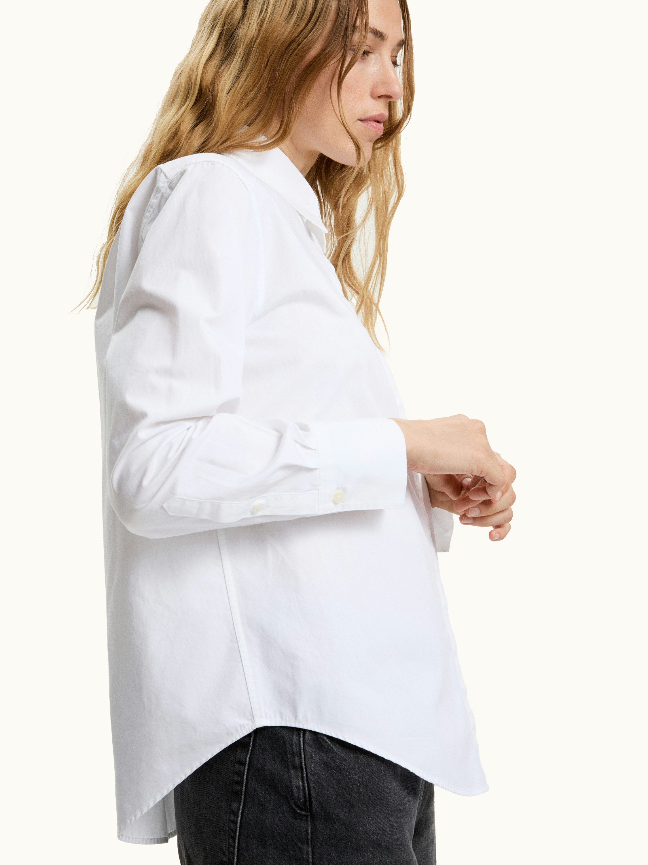 Skjortan har en dold knäppning som ger ett stilrent och minimalistiskt uttryck, perfekt för såväl vardag som mer formella tillfällen. Den rundade fållen bidrar till en elegant finish och gör skjortan lätt att bära både instoppad och löst hängande. Manschetten knäpps med en enkel knapp, vilket ger en diskret men genomtänkt detalj.
