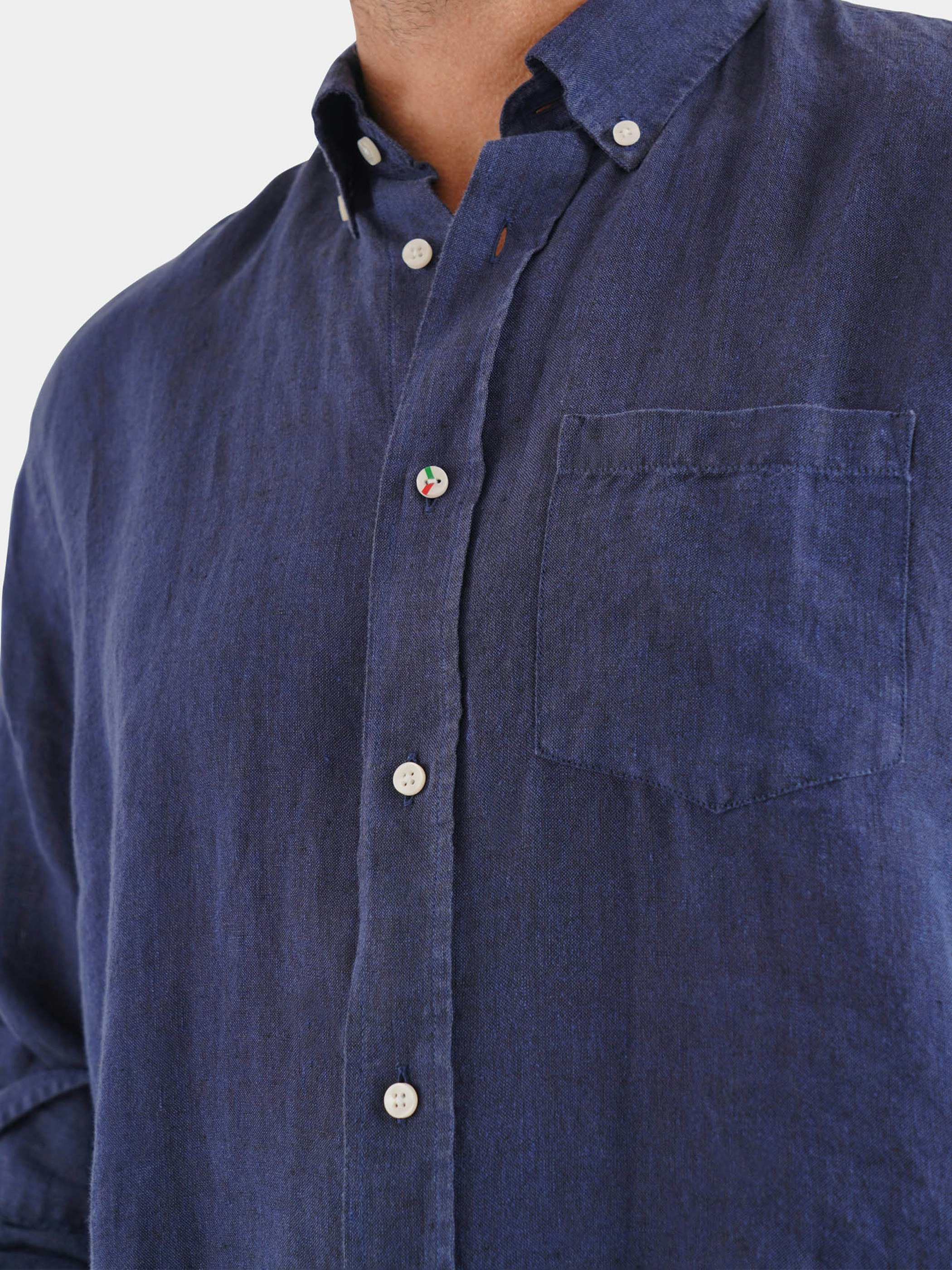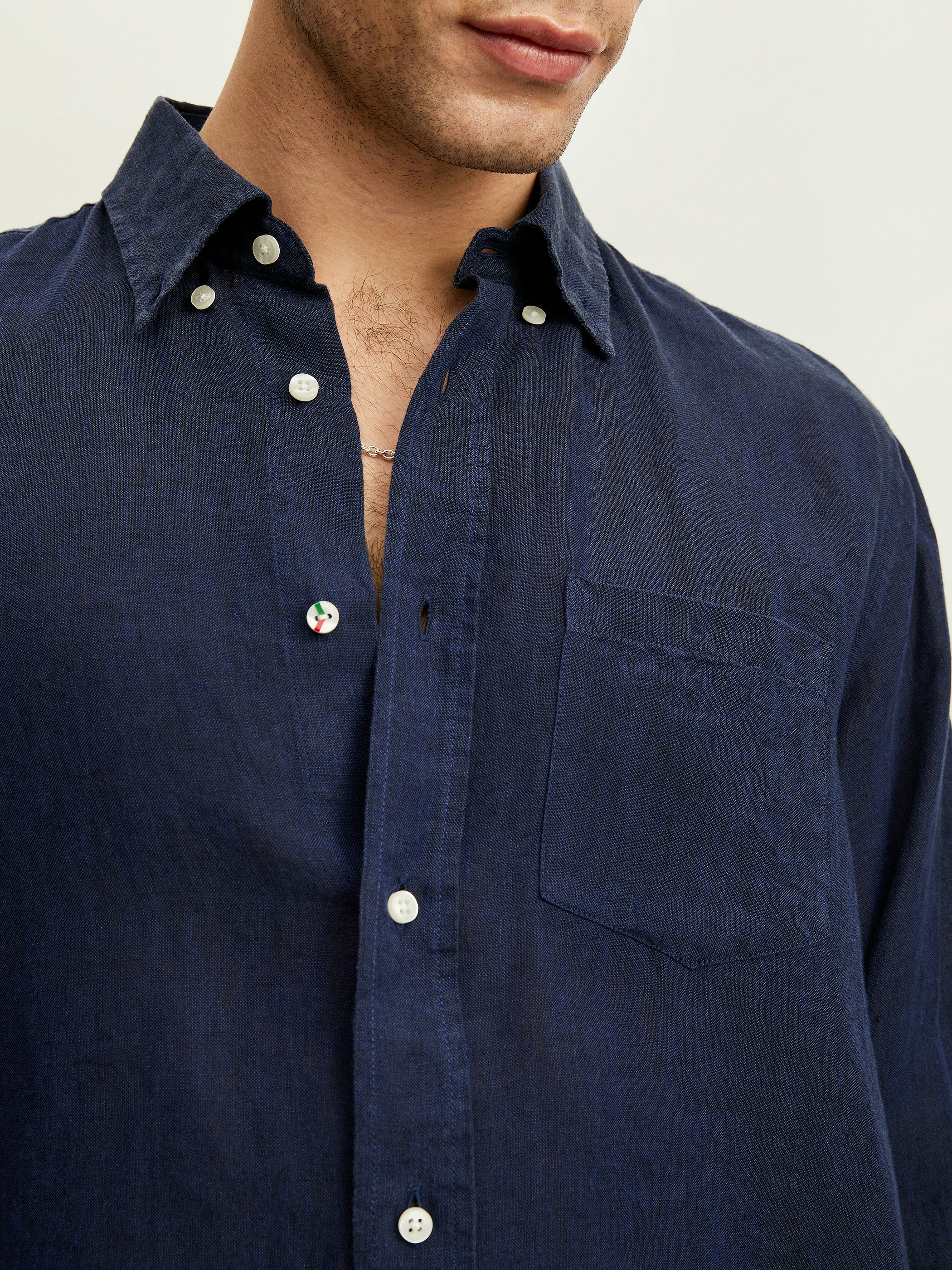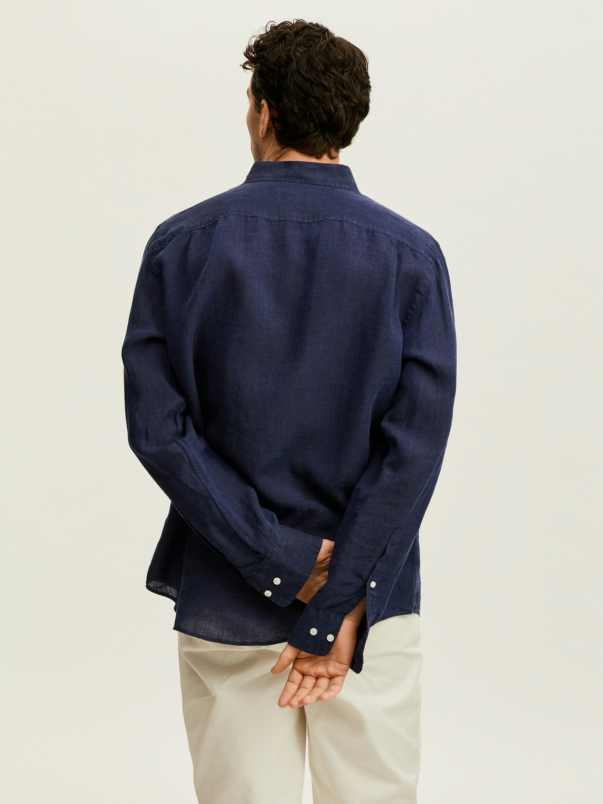 Väddö linneskjorta har en regular passform och är tillverkad i Portugal. Skjortan har en button-down krage och en praktisk bröstficka.