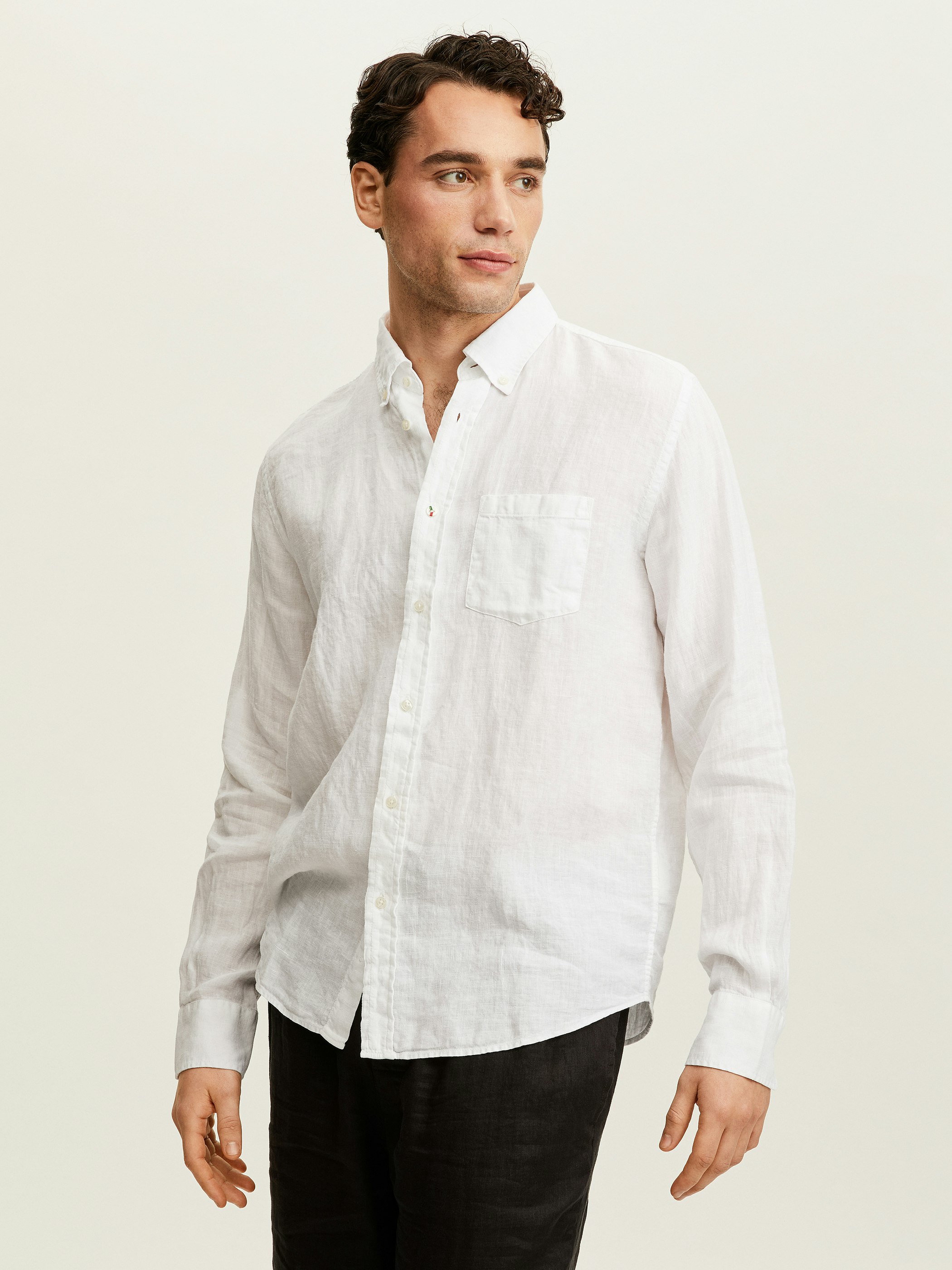 Väddö linneskjorta har en regular passform och är tillverkad i Portugal. Skjortan har en button-down krage och en praktisk bröstficka.