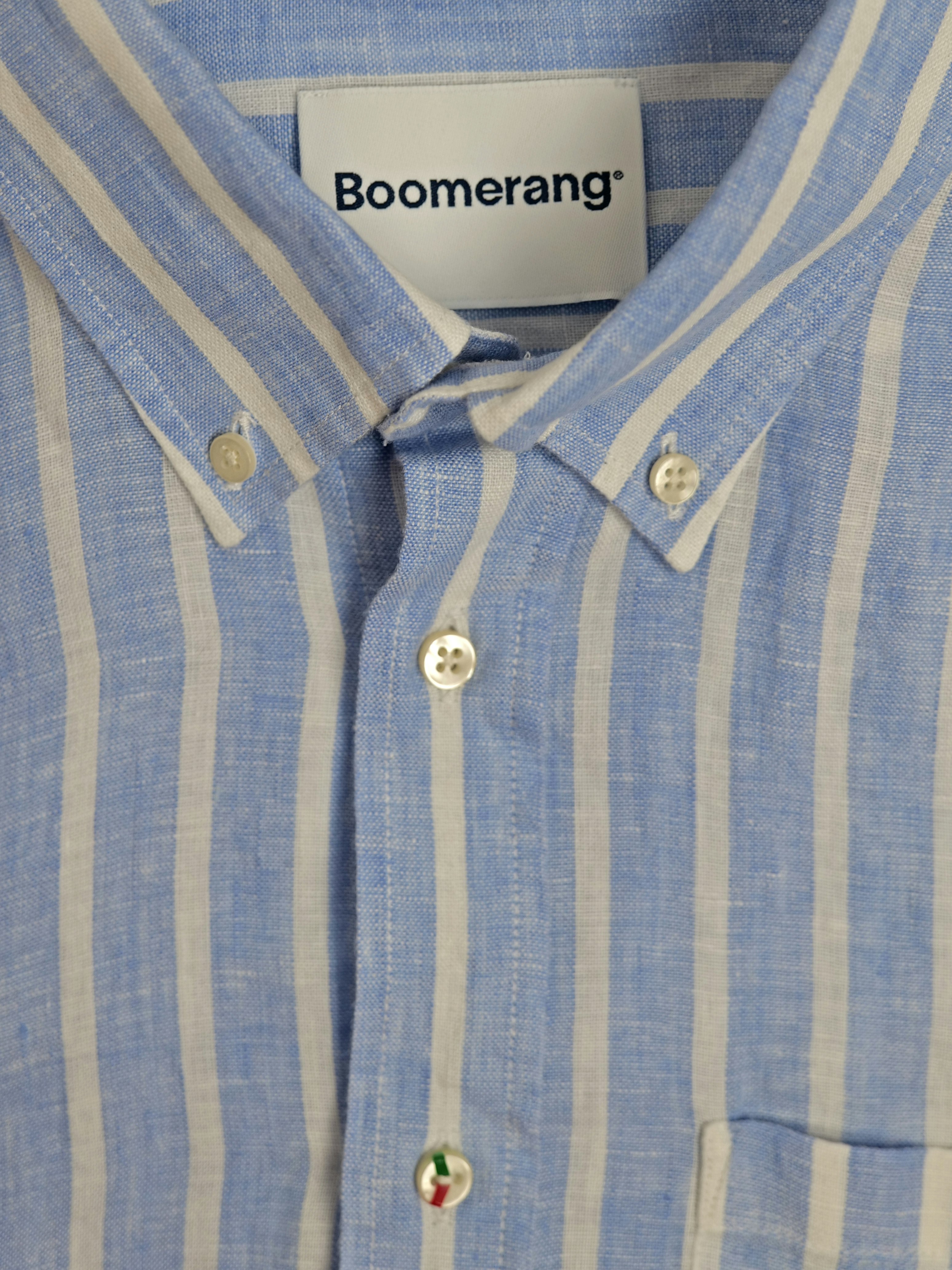 Skjortans tredje knapp är vår handmålade Boomerang-knapp, medan resterande knappar är tillverkade av återvunnet material – en detalj som speglar vårt fokus på medvetna materialval och långsiktig design.